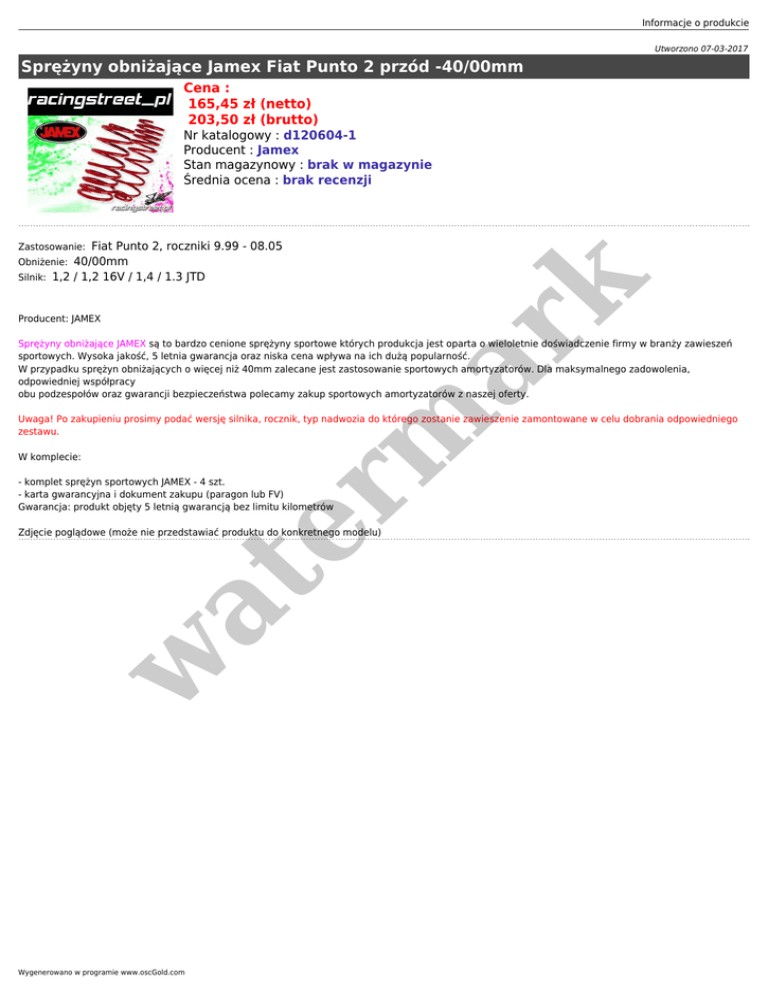 Informacje o produkcie Utworzono 07-03-2017 Sprężyny obniżające Jamex Fiat Punto 2 przód -40/00mm Cena : 165,45 zł (netto) 203,50 zł (brutto) Nr katalogowy : d120604-1 Producent : Jamex Stan magazynowy : brak w magazynie Średnia ocena : brak recenzji Fiat Punto 2, roczniki 9.99 - 08.05 40/00mm Silnik: 1,2 / 1,2 16V / 1,4 / 1.3 JTD Zastosowanie: er m ar k Obniżenie: Producent: JAMEX Sprężyny obniżające JAMEX są to bardzo cenione sprężyny sportowe których produkcja jest oparta o wieloletnie doświadczenie firmy w branży zawieszeń sportowych. Wysoka jakość, 5 letnia gwarancja oraz niska cena wpływa na ich dużą popularność. W przypadku sprężyn obniżających o więcej niż 40mm zalecane jest zastosowanie sportowych amortyzatorów. Dla maksymalnego zadowolenia, odpowiedniej współpracy obu podzespołów oraz gwarancji bezpieczeństwa polecamy zakup sportowych amortyzatorów z naszej oferty. Uwaga! Po zakupieniu prosimy podać wersję silnika, rocznik, typ nadwozia do którego zostanie zawieszenie zamontowane w celu dobrania odpowiedniego zestawu. W komplecie: - komplet sprężyn sportowych JAMEX - 4 szt. - karta gwarancyjna i dokument zakupu (paragon lub FV) Gwarancja: produkt objęty 5 letnią gwarancją bez limitu kilometrów w at Zdjęcie poglądowe (może nie przedstawiać produktu do konkretnego modelu) Wygenerowano w programie www.oscGold.com