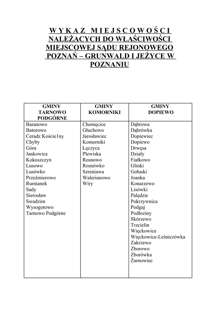 WYKAZ MIEJSCOWOŚCI NALEŻACYCH DO WŁAŚCIWOŚCI MIEJSCOWEJ SĄDU REJONOWEGO POZNAŃ – GRUNWALD I JEŻYCE W POZNANIU GMINY TARNOWO PODGÓRNE Baranowo Batorowo Ceradz Koście1ny Chyby Góra Jankowice Kokoszczyn Lusowo Lusówko Przeźmierowo Rumianek Sady Sierosław Swadzim Wysogotowo Tarnowo Podgórne GMINY KOMORNIKI Chomęcice Głuchowo Jarosławiec Komorniki Łęczyca Plewiska Rosnowo Rosnówko Szreniawa Walerianowo Wiry GMINY DOPIEWO Dąbrowa Dąbrówka Dopiewiec Dopiewo Drwęsa Działy Fiałkowo Glinki Gołuski Joanka Konarzewo Lisówki Palędzie Pokrzywnica Podgaj Podłoziny Skórzewo Trzcielin Więckowice Więckowice-Leśniczówka Zakrzewo Zborowo Zborówka Żarnowiec