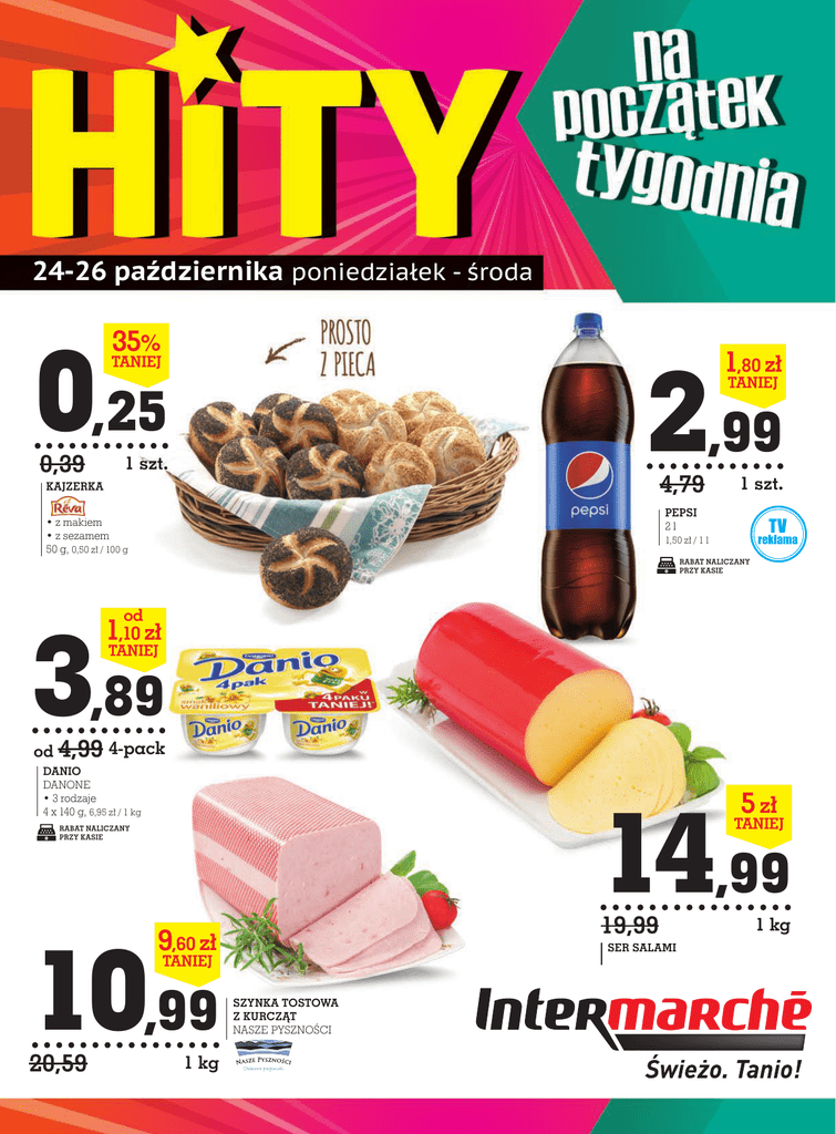 24-26 października poniedziałek - środa 0,25 35% 2,99 1,80 zł TANIEJ 0,39 TANIEJ 1 szt. 4,79 KAJZERKA 1 szt. PEPSI 2l • z makiem • z sezamem 50 g, 0,50 zł / 100 g TV reklama 1,50 zł / 1 l RABAT NALICZANY PRZY KASIE 3,89 od 1,10 zł TANIEJ od 4,99 4-pack DANIO DANONE • 3 rodzaje 4 x 140 g, 6,95 zł / 1 kg 14,99 5 zł TANIEJ RABAT NALICZANY PRZY KASIE 10,99 19,99 9,60 zł SER SALAMI TANIEJ 20,59 1 kg SZYNKA TOSTOWA Z KURCZĄT NASZE PYSZNOŚCI 1 kg 24-26 października poniedziałek - środa 5,89 ZYSK 4,10 zł 9,99 TV reklama 1 szt. 1,47 zł / 1 l RABAT NALICZANY PRZY KASIE Oferta promocyjna nr 42/2016 ważna w dniach wskazanych na stronach lub do wyczerpania zapasu. Sklepy w których obowiązuje promocja gazetkowa dostępne na stronie www.intermarche.pl. Sprzedaż wyłącznie detaliczna. Ceny zawierają podatek VAT. Zdjęcia i wygląd towarów w gazetce mogą nieznacznie odbiegać od rzeczywistości. Za ewentualne błędy w druku uprzejmie przepraszamy.