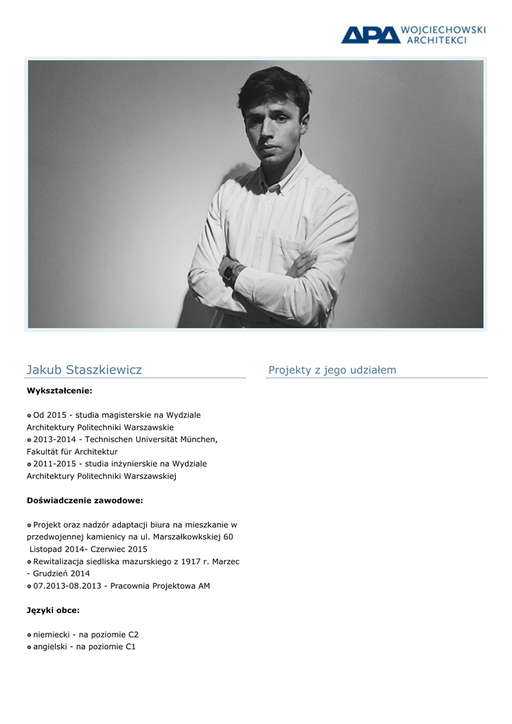 Jakub Staszkiewicz Wykształcenie: Od 2015 - studia magisterskie na Wydziale Architektury Politechniki Warszawskie 2013-2014 - Technischen Universität München, Fakultät für Architektur 2011-2015 - studia inżynierskie na Wydziale Architektury Politechniki Warszawskiej Doświadczenie zawodowe: Projekt oraz nadzór adaptacji biura na mieszkanie w przedwojennej kamienicy na ul. Marszałkowkskiej 60 Listopad 2014- Czerwiec 2015 Rewitalizacja siedliska mazurskiego z 1917 r. Marzec - Grudzień 2014 07.2013-08.2013 - Pracownia Projektowa AM Języki obce: niemiecki - na poziomie C2 angielski - na poziomie C1 Projekty z jego udziałem Zainteresowania: gotowanie narciarstwo surfing żeglarstwo squash