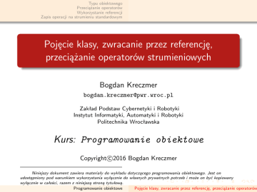 Typu obiektowego Przeciążanie operatorów Wykorzystanie referencji Zapis operacji na strumieniu standardowym Pojęcie klasy, zwracanie przez referencję, przeciążanie operatorów strumieniowych Bogdan Kreczmer [email protected] Zakład Podstaw Cybernetyki i Robotyki Instytut Informatyki, Automatyki i Robotyki Politechnika Wrocławska Kurs: Programowanie obiektowe c Copyright2016 Bogdan Kreczmer Niniejszy dokument zawiera materiały do wykładu dotyczącego programowania obiektowego. Jest on udostępniony pod warunkiem wykorzystania wyłącznie do własnych prywatnych potrzeb i może on być kopiowany wyłącznie w całości, razem z niniejszą stroną tytułową. Programowanie obiektowe Pojęcie klasy, zwracanie przez referencję, przeciążanie operatorów Typu obiektowego Przeciążanie operatorów Wykorzystanie referencji Zapis operacji na strumieniu standardowym Niniejsza prezentacja została wykonana przy użyciu systemu składu LATEX oraz stylu beamer, którego autorem jest Till Tantau. Strona domowa projektu Beamer: http://latex-beamer.sourceforge.net Programowanie obiektowe Typu obiektowego Przeciążanie operatorów Wykorzystanie referencji Zapis operacji na strumieniu standardowym Spis treści 1 Typu obiektowego Typy obiektowe, hierarchie typów 2 Przeciążanie operatorów Łączność operatorów i porządek wykonywania operacji 3 Wykorzystanie referencji Przekazywanie parametrów przez referencję i zwracanie referencji Operacje czytania 4 Zapis operacji na strumieniu standardowym Połączenie kaskadowe operacji zapisu Przeciążenie operatora zapisu do strumienia standardowego Przeciążenie operatora czytania ze strumienia standardowego Rozpoznawanie i reakcja na błąd czytania Programowanie obiektowe Typu obiektowego Przeciążanie operatorów Wykorzystanie referencji Zapis operacji na strumieniu standardowym Typy obiektowe, hierarchie typów Spis treści 1 Typu obiektowego Typy obiektowe, hierarchie typów 2 Przeciążanie operatorów Łączność operatorów i porządek wykonywania operacji 3 Wykorzystanie referencji Przekazywanie parametrów przez referencję i zwracanie referencji Operacje czytania 4 Zapis operacji na strumieniu standardowym Połączenie kaskadowe operacji zapisu Przeciążenie operatora zapisu do strumienia standardowego Przeciążenie operatora czytania ze strumienia standardowego Rozpoznawanie i reakcja na błąd czytania Programowanie obiektowe Pojęcie klasy, zwracanie przez referencję, przeciążanie operatorów Typu obiektowego Przeciążanie operatorów Wykorzystanie referencji Zapis operacji na strumieniu standardowym Typ obiektowy Typ obiektowy ??? Programowanie obiektowe Typy obiektowe, hierarchie typów Typu obiektowego Przeciążanie operatorów Wykorzystanie referencji Zapis operacji na strumieniu standardowym Typy obiektowe, hierarchie typów Typ obiektowy Typ obiektowy jest pojęciem, tzn. jest koncepcją lub ideą, którą stosujemy do obiektów występujących w naszej świadomości. Programowanie obiektowe Typu obiektowego Przeciążanie operatorów Wykorzystanie referencji Zapis operacji na strumieniu standardowym Typy obiektowe, hierarchie typów Typ obiektowy Typ obiektowy jest pojęciem, tzn. jest koncepcją lub ideą, którą stosujemy do obiektów występujących w naszej świadomości. Typ obiektowy jest typem obiektu. Programowanie obiektowe Typu obiektowego Przeciążanie operatorów Wykorzystanie referencji Zapis operacji na strumieniu standardowym Typy obiektowe, hierarchie typów Typ obiektowy Typ obiektowy jest pojęciem, tzn. jest koncepcją lub ideą, którą stosujemy do obiektów występujących w naszej świadomości. Typ obiektowy jest typem obiektu. Przykład typów obiektowych: robot przemysłowy, pojazd, idealny człowiek, wektor, równanie liniowe. Programowanie obiektowe Typu obiektowego Przeciążanie operatorów Wykorzystanie referencji Zapis operacji na strumieniu standardowym Typy obiektowe, hierarchie typów Typ obiektowy Własności: Typ obiektowy jest też pojęciem. Do pojedynczego obiektu może stosować się wiele pojęć (typów obiektowych). Typy obiektowe mogą tworzyć hierarchię od bardzo ogólnych pojęć do pojęć szczegółowych. Programowanie obiektowe Typu obiektowego Przeciążanie operatorów Wykorzystanie referencji Zapis operacji na strumieniu standardowym Typy obiektowe, hierarchie typów Typ obiektowy Własności: Typ obiektowy jest też pojęciem. Do pojedynczego obiektu może stosować się wiele pojęć (typów obiektowych). Typy obiektowe mogą tworzyć hierarchię od bardzo ogólnych pojęć do pojęć szczegółowych. Programowanie obiektowe Typu obiektowego Przeciążanie operatorów Wykorzystanie referencji Zapis operacji na strumieniu standardowym Typy obiektowe, hierarchie typów Typ obiektowy Własności: Typ obiektowy jest też pojęciem. Do pojedynczego obiektu może stosować się wiele pojęć (typów obiektowych). Typy obiektowe mogą tworzyć hierarchię od bardzo ogólnych pojęć do pojęć szczegółowych. Programowanie obiektowe Typu obiektowego Przeciążanie operatorów Wykorzystanie referencji Zapis operacji na strumieniu standardowym Typy obiektowe, hierarchie typów Typ obiektowy Własności: Typ obiektowy jest też pojęciem. Do pojedynczego obiektu może stosować się wiele pojęć (typów obiektowych). Typy obiektowe mogą tworzyć hierarchię od bardzo ogólnych pojęć do pojęć szczegółowych. Programowanie obiektowe Typu obiektowego Przeciążanie operatorów Wykorzystanie referencji Zapis operacji na strumieniu standardowym Przykład hierarchii maszyna ↑ pojazd ↑ samochód ↑ Ferrante V Concept Programowanie obiektowe Typy obiektowe, hierarchie typów Typu obiektowego Przeciążanie operatorów Wykorzystanie referencji Zapis operacji na strumieniu standardowym Typy obiektowe, hierarchie typów Czym jest klasa Klasa jest typem obiektowym Programowanie obiektowe Typu obiektowego Przeciążanie operatorów Wykorzystanie referencji Zapis 