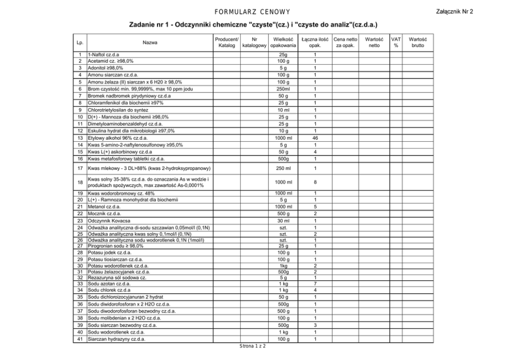 FORMULARZ CENOWY Zadanie nr 1 - Odczynniki chemiczne "czyste"(cz.) i "czyste do analiz"(cz.d.a.) Lp. Nazwa Producent/ Nr Wielkość Katalog katalogowy opakowania Łączna ilość opak. 1 2 3 4 5 6 7 8 9 10 11 12 13 14 15 16 1-Naftol cz.d.a Acetamid cz. ≥98,0% Adonitol ≥98,0% Amonu siarczan cz.d.a. Amonu żelaza (II) siarczan x 6 H20 ≥ 98,0% Brom czystość min. 99,9999%, max 10 ppm jodu Bromek nadbromek pirydyniowy cz.d.a Chloramfenikol dla biochemii ≥97% Chlorotrietylosilan do syntez D(+) - Mannoza dla biochemii ≥98,0% Dimetyloaminobenzaldehyd cz.d.a. Eskulina hydrat dla mikrobiologii ≥97,0% Etylowy alkohol 96% cz.d.a. Kwas 5-amino-2-naftylenosulfonowy ≥95,0% Kwas L(+) askorbinowy cz.d.a Kwas metafosforowy tabletki cz.d.a. 25g 100 g 5g 100 g 100 g 250ml 50 g 25 g 10 ml 25 g 25 g 10 g 1000 ml 5g 50 g 500g 1 1 1 1 1 1 1 1 1 1 1 1 46 1 4 1 17 Kwas mlekowy - 3 DL>88% (kwas 2-hydroksypropanowy) 250 ml 1 18 Kwas solny 35-38% cz.d.a. do oznaczania As w wodzie i produktach spożywczych, max zawartość As-0,0001% 1000 ml 8 19 20 21 22 23 24 25 26 27 28 29 30 31 32 33 34 35 36 37 38 39 40 41 Kwas wodorobromowy cz. 48% L(+) - Ramnoza monohydrat dla biochemii Metanol cz.d.a. Mocznik cz.d.a. Odczynnik Kovacsa Odważka analityczna di-sodu szczawian 0,05mol/l (0,1N) Odważka analityczna kwas solny 0,1mol/l (0,1N) Odważka analityczna sodu wodorotlenek 0,1N (1mol/l) Pirogronian sodu ≥ 98,0% Potasu jodek cz.d.a. Potasu tiosiarczan cz.d.a. Potasu wodorotlenek cz.d.a. Potasu żelazocyjanek cz.d.a. Rezazuryna sól sodowa cz. Sodu azotan cz.d.a. Sodu chlorek cz.d.a Sodu dichloroizocyjanuran 2 hydrat Sodu diwidorofosforan x 2 H2O cz.d.a. Sodu diwodorofosforan bezwodny cz.d.a. Sodu molibdenian x 2 H2O cz.d.a. Sodu siarczan bezwodny cz.d.a. Sodu wodorotlenek cz.d.a. Siarczan hydrazyny cz.d.a. 1000 ml 5g 1000 ml 500 g 30 ml szt. szt. szt. 25 g 100 g 100 g 1kg 500g 5g 1 kg 1 kg 50 g 500g 500 g 100 g 500g 1 kg 100 g 1 1 5 2 1 1 2 1 1 1 1 2 2 1 7 4 1 1 1 1 3 1 1 Strona 1 z 2 Cena netto za opak. Wartość netto VAT % Wartość brutto FORMULARZ CENOWY Zadanie nr 1 - Odczynniki chemiczne "czyste"(cz.) i "czyste do analiz"(cz.d.a.) Lp. 42 43 44 45 46 47 48 49 50 51 52 Nazwa Producent/ Nr Wielkość Katalog katalogowy opakowania Tetrahydrofuran cz.d.a. Trehaloza dla mikrobiologii Tri-Sodu cytrynian 2 hydrat cz.d.a. Tri-Sodu cytrynian 2 hydrat cz.d.a. Wapnia chlorek bezwodny do eksykatorów cz.d.a. Wapnia węglan strącony cz.d.a. Wersenian dwusodowy cz.d.a. Wodoru nadtlenek 30% cz.d.a. Zieleń bromokrezolowa wsk. Zieleń malachitowa (szczawian) dla biochemii Żelaza (III) cytrynian monohydrat cz.d.a. 1000ml 5g 500g 250 g 1 kg 500 g 500 g 1000 ml 5g 10 g 250 g Łączna ilość opak. Cena netto za opak. Wartość netto VAT % 2 1 1 1 1 1 1 1 1 1 1 Suma : odrzuceniem oferty. Wykonawca oświadcza, że oferowane wyspecyfikowane odczynniki chemiczne spełniają powyższe wymagania jakościowe wymagane przez Zamawiającego. .................................................... ...................................................... Strona 2 z 2 Wartość brutto