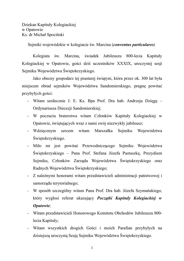 Dziekan Kapituły Kolegiackiej w Opatowie Ks. dr Michał Spociński Sejmiki wojewódzkie w kolegiacie św. Marcina (conventus particulares) Kolegiata św. Marcina, świadek Jubileuszu 800-lecia Kapituły Kolegiackiej w Opatowie, gości dziś uczestników XXXIX, uroczystej sesji Sejmiku Województwa Świętokrzyskiego. Jako obecny gospodarz tej prastarej świątyni, która przez ok. 300 lat była miejscem obrad sejmików Województwa Sandomierskiego, pragnę powitać przybyłych gości: - Witam serdecznie J. E. Ks. Bpa Prof. Dra hab. Andrzeja Dzięgę – Ordynariusza Diecezji Sandomierskiej; - W poczuciu braterstwa witam Członków Kapituły Kolegiackiej w Opatowie, świętujących wraz z nami swój niezwykły jubileusz; - Wdzięcznym sercem witam Marszałka Sejmiku Województwa Świętokrzyskiego. - Miło mi jest powitać Przewodniczącego Sejmiku Województwa Świętokrzyskiego – Pana Prof. Stefana Józefa Pastuszkę, Prezydium Sejmiku, Członków Zarządu Województwa Świętokrzyskiego oraz Radnych Województwa Świętokrzyskiego; - Z należnymi honorami witam przedstawicieli administracji państwowej i samorządu terytorialnego; - W sposób szczególny witam Pana Prof. Dra hab. Józefa Szymańskiego, który wygłosi referat ukazujący Początki Kapituły Kolegiackiej w Opatowie; - Witam przedstawicieli Honorowego Komitetu Obchodów Jubileuszu 800lecia Kapituły; - Witam wszystkich drogich Gości i moich Parafian przybyłych na dzisiejszą uroczystą Sesję Sejmiku Województwa Świętokrzyskiego. 1 Pragnę przedstawić krótką informację odnośnie do blisko 300-tuletniego okresu historii sejmików obradujących w tych dostojnych murach. Obecnie, gdy kraj nasz usiany jest obszernymi budowlami cywilnymi, może dziwić stary zwyczaj obradowania w obiektach sakralnych. Jednym z nich była nasza świątynia – duża, dogodnie położona, gościnna. Polski parlamentaryzm cieszy się jedną z dłuższych tradycji w Europie. Wprawdzie od początku Rzeczpospolitej król uważany był za dzierżyciela władzy najwyższej – suwerena, ale korzystał z pomocy rady. Już od poł. XVI w. były 3 stany sejmujące – król, senat i izba poselska. Król nie mógł samodzielnie wydawać konstytucji, nakładać podatków, dysponować majątkiem państwa; bez zgody sejmu nie mógł też zawierać związku małżeńskiego, nabywać dóbr dla siebie i rodziny, czy wyjeżdżać za granicę. Musiał zasięgać rady senatorów we wszystkich ważniejszych sprawach, zaś senatorowie zdawali sprawę ze swoich rad sejmowi. Wzrastała natomiast niezależność szlachty, wpływającej na los Kraju poprzez sejmiki. W drugiej poł. XVI w. w całej Rzeczpospolitej było 70 sejmików szlacheckich. Miejscem obradowania sejmików województwa sandomierskiego był Opatów, trzecie co do znaczenia - po Sandomierzu i Wiślicy - miasto tej ziemi. Był miejscem dogodnym ze względu na położenie przy ważnym trakcie komunikacyjnym, niedaleko stolicy województwa, z możliwością wyżywienia i zakwaterowania przybyłej szlachty, otoczone rozległymi łąkami służącymi do popasu koni. Nie posiadając odpowiedniego locum, gościło obradującą szlachtę w największej świątyni – kolegiacie św. Marcina, a latem w jej otoczeniu. Komisje sejmikowe zbierały się w zakrystiach i kapliczkach. Powaga dostojnej budowli i jej sakralny charakter mitygowała krewkich sarmatów, którzy przez wzgląd na jej liturgiczne przeznaczenie powściągali swoje temperamenty, choć zdarzały się burdy i swary. Na niesubordynowanych nakładano kary pieniężne lub nakazywano zakup wyposażenia świątyni (np. w 1727 r. winny rozpętania burdy Adam Rawita 2 Gawroński – podczasi mielnicki, który pokaleczył niejakiego Skotnickiego, ucinając mu palce. Z polecenia biskupa krakowskiego – jako zadośćuczynienie miał zakupić ornat do kolegiaty. Z kolei w 1754 r. sąd nakazał niejakiemu Malinowskiemu zapłacił karę 6000 zł węgierskich, za to, że w czasie sejmiku sprofanował cmentarz przykolegiacki. Zdarzały się też inne profanacje wnętrza świątyni – wg przekazów zniszczone zostały dwa ołtarze przy filarach. Do dziś widać ślady zniszczenia murów zewnętrznych przez szlachtę ostrzącą o nie szablę. Za poczynione szkody szlachta sandomierska starała się wynagrodzić Kapitułę Kolegiacką, m.in. przez zwolnienie dóbr od podatków (np. 1670 r.) lub darowanie sum pieniężnych (np. w 1727 r. Kapituła otrzymała 1000 zł), a o rozwój samego miasta dbała w sposób szczególny. Po zawieruchach wojennych, w czasie których Opatów został zniszczony, zwłaszcza w roku 1657 od wojsk Jerzego II Rakoczego - sejmik z dnia 3 listopada 1678 r. prosił o ustanowienie w Opatowie trzech jarmarków rocznie - na Św. Trójcę, na Św. Franciszka i na Św. Tomasza, żeby, jak przekazują źródła – „to miasto fundować się mogło i budować dla sejmików, które się w tym mieście odprawować zwykły". Coroczne zjazdy szlachty stymulowały rozwój rzemiosła – np. w 1629 r. był tu jedyny w powiecie garbarz (safiannik), skrzypek, aptekarz, 3 felczerów, 5 rzeźników, 14 piekarzy. Zatem nie ulega wątpliwości, że sejmiki miały wpływ na rozwój miasta. Czy służyły samej świątyni lub wzrostowi religijności wiernych? Raczej nie! Co więcej, przysporzały zgorszenia i zakłócały jej pierwszorzędne funkcje liturgiczne. Wpływały destrukcyjnie na rytm życia duchowego, np. w 1710 r. Kapituła Kolegiacka musiała przesunąć swoje obrady o kilka dni z powodu trwającego sejmiku. Po raz pierwszy, w 1369 r., odbył się tu wiec okręgu sandomierskiego. Ponadto 13 lipca 1434 r. miał tu miejsce zjazd opozycji małopolskiej, 3 bezskutecznie zmierzającej do odsunięcia Jagiellonów od tronu Rzeczpospolitej. W latach 1473 i 1490 zbierały się małopolskie sejmiki generalne z udziałem króla Kazimierza Jagiellończyka. Prawie wszystkie sejmiki (deputackie, przedsejmowe, kapturowe, elekcyjne, relacyjne), ju
