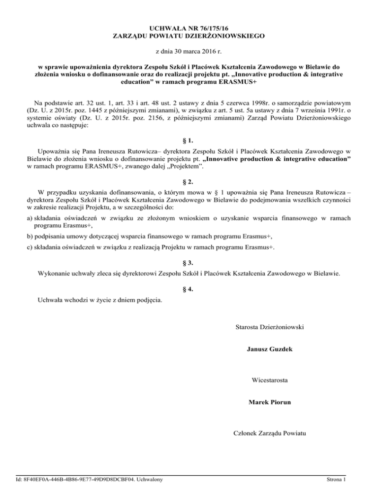 UCHWAŁA NR 76/175/16 ZARZĄDU POWIATU DZIERŻONIOWSKIEGO z dnia 30 marca 2016 r. w sprawie upoważnienia dyrektora Zespołu Szkół i Placówek Kształcenia Zawodowego w Bielawie do złożenia wniosku o dofinansowanie oraz do realizacji projektu pt. „Innovative production & integrative education” w ramach programu ERASMUS+ Na podstawie art. 32 ust. 1, art. 33 i art. 48 ust. 2 ustawy z dnia 5 czerwca 1998r. o samorządzie powiatowym (Dz. U. z 2015r. poz. 1445 z późniejszymi zmianami), w związku z art. 5 ust. 5a ustawy z dnia 7 września 1991r. o systemie oświaty (Dz. U. z 2015r. poz. 2156, z późniejszymi zmianami) Zarząd Powiatu Dzierżoniowskiego uchwala co następuje: § 1. Upoważnia się Pana Ireneusza Rutowicza– dyrektora Zespołu Szkół i Placówek Kształcenia Zawodowego w Bielawie do złożenia wniosku o dofinansowanie projektu pt. „Innovative production & integrative education” w ramach programu ERASMUS+, zwanego dalej „Projektem”. § 2. W przypadku uzyskania dofinansowania, o którym mowa w § 1 upoważnia się Pana Ireneusza Rutowicza – dyrektora Zespołu Szkół i Placówek Kształcenia Zawodowego w Bielawie do podejmowania wszelkich czynności w zakresie realizacji Projektu, a w szczególności do: a) składania oświadczeń w związku ze złożonym wnioskiem o uzyskanie wsparcia finansowego w ramach programu Erasmus+, b) podpisania umowy dotyczącej wsparcia finansowego w ramach programu Erasmus+, c) składania oświadczeń w związku z realizacją Projektu w ramach programu Erasmus+. § 3. Wykonanie uchwały zleca się dyrektorowi Zespołu Szkół i Placówek Kształcenia Zawodowego w Bielawie. § 4. Uchwała wchodzi w życie z dniem podjęcia. Starosta Dzierżoniowski Janusz Guzdek Wicestarosta Marek Piorun Członek Zarządu Powiatu Id: 8F40EF0A-446B-4B86-9E77-49D9D8DCBF04. Uchwalony Strona 1 Jarosław Tyniec Członek Zarządu Powiatu Krzysztof Nawrot Id: 8F40EF0A-446B-4B86-9E77-49D9D8DCBF04. Uchwalony Strona 2 UZASADNIENIE W dniu 22.03.2016r. dyrektor Zespołu Szkół i Placówek Kształcenia Zawodowego w Bielawie zwrócił się z prośbą o udzielenie upoważnienia do złożenia wniosku o dofinansowanie projektu w ramach programu Erasmus+ oraz jego realizacji w przypadku uzyskania dofinansowania. Upoważnienie takie wymagane jest podczas składania wniosku o dofinansowanie i zgodnie z art. 48 ust. 2 ustawy o samorządzie powiatowym Zarząd Powiatu może upoważnić kierowników jednostek organizacyjnych powiatu do składania oświadczeń woli związanych z prowadzeniem bieżącej działalności powiatu. Założeniem projektu jest podniesienie jakości kształcenia zawodowego w Zespole Szkół i Placówek Kształcenia Zawodowego w Bielawie poprzez współpracę sześciu szkół partnerskich: z Niemiec, ze Słowenii, z Chorwacji, ze Słowacji, z Czech oraz z Polski. Realizacja tego założenia odbywać będzie się poprzez spotkania uczniów szkół partnerskich, podczas których uczniowie m.in. będą doskonalić umiejętności związane z obsługą drukarki 3D oraz tworzeniem projektów i wykonywaniem obróbki przedmiotów na obrabiarkach sterowanych numerycznie, a tym samym poznawać przyszłościowe metody wytwórcze w technologii CAD/CAM/CNC. W projekcie dla szkoły zaplanowanych jest łącznie 12 mobilności uczniowskich i 4 nauczycielskie. W ramach projektu przewiduje się również zakup materiałów do druku w technologii 3D, materiałów do obróbki CAM/CNC oraz projektora interaktywnego. Wnioskowana kwota dla Zespołu Szkół i Placówek Kształcenia Zawodowego w Bielawie wynosi 18 060 euro i w 100% finansowana jest ze środków programu Erasmus+ (na zasadzie 80% zaliczki, 20% refundacja po zatwierdzeniu raportu końcowego). Planowany okres realizacji projektu: 01.09.2016r.-31.08.2019r. Mając powyższe na uwadze zasadnym jest podjęcie niniejszej uchwały. Id: 8F40EF0A-446B-4B86-9E77-49D9D8DCBF04. Uchwalony Strona 1