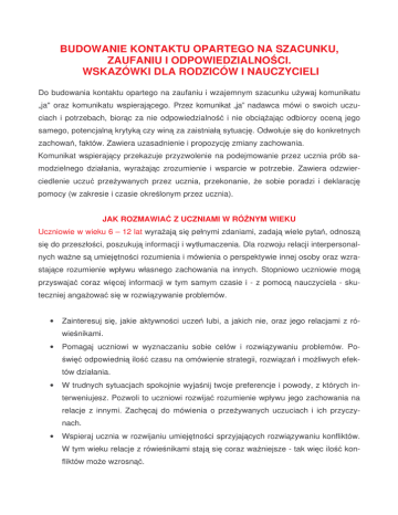 BUDOWANIE KONTAKTU OPARTEGO NA SZACUNKU, ZAUFANIU I ODPOWIEDZIALNO CI. WSKAZÓWKI DLA RODZICÓW I NAUCZYCIELI Do budowania kontaktu opartego na zaufaniu i wzajemnym szacunku u ywaj komunikatu „ja" oraz komunikatu wspieraj cego. Przez komunikat „ja” nadawca mówi o swoich uczuciach i potrzebach, bior c za nie odpowiedzialno i nie obci aj c odbiorcy ocen jego samego, potencjaln krytyk czy win za zaistniał sytuacj . Odwołuje si do konkretnych zachowa , faktów. Zawiera uzasadnienie i propozycj zmiany zachowania. Komunikat wspieraj cy przekazuje przyzwolenie na podejmowanie przez ucznia prób samodzielnego działania, wyra aj c zrozumienie i wsparcie w potrzebie. Zawiera odzwierciedlenie uczu prze ywanych przez ucznia, przekonanie, e sobie poradzi i deklaracj pomocy (w zakresie i czasie okre lonym przez ucznia). JAK ROZMAWIA Z UCZNIAMI W RÓ NYM WIEKU Uczniowie w wieku 6 – 12 lat wyra aj si pełnymi zdaniami, zadaj wiele pyta , odnosz si do przeszło ci, poszukuj informacji i wytłumaczenia. Dla rozwoju relacji interpersonalnych wa ne s umiej tno ci rozumienia i mówienia o perspektywie innej osoby oraz wzrastaj ce rozumienie wpływu własnego zachowania na innych. Stopniowo uczniowie mog przyswaja coraz wi cej informacji w tym samym czasie i - z pomoc nauczyciela - skuteczniej anga owa si w rozwi zywanie problemów. • Zainteresuj si , jakie aktywno ci ucze lubi, a jakich nie, oraz jego relacjami z rówie nikami. • Pomagaj uczniowi w wyznaczaniu sobie celów i rozwi zywaniu problemów. Powi odpowiedni ilo czasu na omówienie strategii, rozwi za i mo liwych efek- tów działania. • W trudnych sytuacjach spokojnie wyja nij twoje preferencje i powody, z których interweniujesz. Pozwoli to uczniowi rozwija rozumienie wpływu jego zachowania na relacje z innymi. Zach caj do mówienia o prze ywanych uczuciach i ich przyczynach. • Wspieraj ucznia w rozwijaniu umiej tno ci sprzyjaj cych rozwi zywaniu konfliktów. W tym wieku relacje z rówie nikami staj si coraz wa niejsze - tak wi c ilo fliktów mo e wzrosn . kon- Uczniowie w wieku 12 – 18 lat, nastolatki, s zainteresowani rozmowami o sobie i swoich relacjach. W procesie kształtowania swojej to samo ci chc zrozumie , kim byli i kim si staj , a tak e pozna zdanie innych na swój temat. Cz stym tematem ich rozmy la i rozmów jest ró nicowanie si od rodziców, nauczycieli, dorosłych w ogóle, przy jednoczesnym poszukiwaniu autorytetów. Dla tego okresu rozwojowego typowe s zachowania buntownicze. • B d wra liwy na do wiadczenia ucznia. Pami taj - to bardzo trudny okres ci głych fizycznych, psychicznych i społecznych zmian. • Zainteresuj si ulubionymi zaj ciami nastolatka. Posłuchaj „jego" muzyki, nawet je li ci si nie podoba. • Zachowaj równowag pomi dzy oczekiwaniem odpowiedzialno ci ze strony ucznia a proponowaniem mu wsparcia. • Pami taj, e my li adolescenta mog by ró ne od twoich. Zaakceptuj to jako objaw rozwijaj cej si indywidualno ci ucznia, je li jego pogl dy i zachowania nie rani innych i nie stanowi dla nikogo zagro enia. • Zadawaj pytania otwarte, unikaj „przesłuchiwania". • Pami taj o poczuciu humoru. • Znajd czas na rozmow tylko na temat pozytywnych wra e i miłych spraw. • B d elastyczny. Zanim przedstawisz swoje zdanie - spytaj o perspektyw ucznia. Unikaj dominacji.