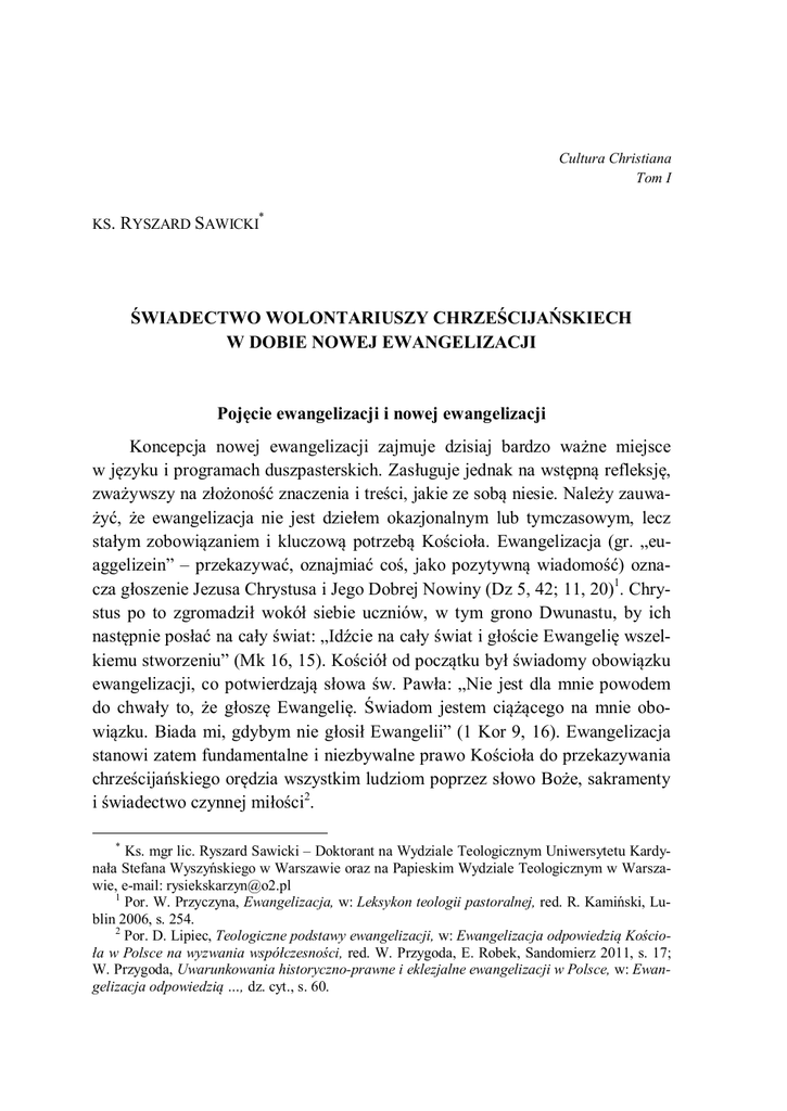 Cultura Christiana Tom I KS. RYSZARD SAWICKI* WIADECTWO WOLONTARIUSZY CHRZE CIJA SKIECH W DOBIE NOWEJ EWANGELIZACJI Poj cie ewangelizacji i nowej ewangelizacji Koncepcja nowej ewangelizacji zajmuje dzisiaj bardzo wa ne miejsce w j zyku i programach duszpasterskich. Zas uguje jednak na wst pn refleksj , zwa ywszy na z ono znaczenia i tre ci, jakie ze sob niesie. Nale y zauwa, e ewangelizacja nie jest dzie em okazjonalnym lub tymczasowym, lecz sta ym zobowi zaniem i kluczow potrzeb Ko cio a. Ewangelizacja (gr. „euaggelizein” – przekazywa , oznajmia co , jako pozytywn wiadomo ) oznacza g oszenie Jezusa Chrystusa i Jego Dobrej Nowiny (Dz 5, 42; 11, 20)1. Chrystus po to zgromadzi wokó siebie uczniów, w tym grono Dwunastu, by ich nast pnie pos na ca y wiat: „Id cie na ca y wiat i g cie Ewangeli wszelkiemu stworzeniu” (Mk 16, 15). Ko ció od pocz tku by wiadomy obowi zku ewangelizacji, co potwierdzaj s owa w. Paw a: „Nie jest dla mnie powodem do chwa y to, e g osz Ewangeli . wiadom jestem ci cego na mnie obowi zku. Biada mi, gdybym nie g osi Ewangelii” (1 Kor 9, 16). Ewangelizacja stanowi zatem fundamentalne i niezbywalne prawo Ko cio a do przekazywania chrze cija skiego or dzia wszystkim ludziom poprzez s owo Bo e, sakramenty i wiadectwo czynnej mi ci2. * Ks. mgr lic. Ryszard Sawicki – Doktorant na Wydziale Teologicznym Uniwersytetu Kardyna a Stefana Wyszy skiego w Warszawie oraz na Papieskim Wydziale Teologicznym w Warszawie, e-mail: [email protected] 1 Por. W. Przyczyna, Ewangelizacja, w: Leksykon teologii pastoralnej, red. R. Kami ski, Lublin 2006, s. 254. 2 Por. D. Lipiec, Teologiczne podstawy ewangelizacji, w: Ewangelizacja odpowiedzi Ko cioa w Polsce na wyzwania wspó czesno ci, red. W. Przygoda, E. Robek, Sandomierz 2011, s. 17; W. Przygoda, Uwarunkowania historyczno-prawne i eklezjalne ewangelizacji w Polsce, w: Ewangelizacja odpowiedzi …, dz. cyt., s. 60. 148 KS. RYSZARD SAWICKI oszenie Dobrej Nowiny dokonuje si zawsze w konkretnej historii pojmowanej jako „kairos”, którego wykorzystanie powinno prowadzi do nieustannej odnowy dzia alno ci pastoralnej wra liwej na cz owieka i na wi ksz skuteczno przepowiadania Ewangelii. Aby skutecznie i owocnie realizowa swoj misj ewangelizacyjn , Ko ció stara si wi c uwzgl dnia uwarunkowania swojej epoki i bada znaki czasu, przyczyniaj c si tym samym do odnowy i przemiany wiata. W niniejszym kontek cie nale y przywo ide nowej ewangelizacji3. Sama definicja nowej ewangelizacji jest ci le zwi zana z eklezjologi Soboru Watyka skiego II, koncepcj „Ecclesia semper renovanda” oraz posoborowym programem nieustannej odnowy Ko cio a i jego dzia alno ci pastoralnej4. Konieczno nowej ewangelizacji wynika z nowej sytuacji Ko cioa w wiecie, a wi c nowych wyzwa i zagro , a tak e nowych szans i mo liwo ci g oszenia Ewangelii. Nagl potrzeb nowej ewangelizacji, w obliczu podst puj cej dechrystianizacji kultury i cywilizacji euroatlantyckiej, dostrzeg Jan Pawe II, który zacz g osi i wciela w ycie ide nowej ewangelizacji jako ogólnoeklezjalnego programu w dzisiejszym wiecie i pilne zadanie odrodzenia chrze cija stwa w krajach zachodnich i spo ecze stwach postkomunistycznych. Okre lenia tego on po raz pierwszy w homilii wyg oszonej 9. czerwca 1979 r. w Nowej Hucie. Mówi wówczas: „Rozpocz a si nowa ewangelizacja, jak gdyby druga, a przecie ta sama, co pierwsza”5. Od tego czasu to sformu owanie u ywane by o przez Papie a systematycznie. Zwrot ten sta si popularny w wiecie od 9. 3 W zale no ci od adresatów wyró nia si ewangelizacj misyjn , pastoraln i now . Ewangelizacja misyjna, zwana pierwsz lub misj „ad gentes”, polega na objawianiu Jezusa Chrystusa i Jego nauki jako Dobrej Nowiny tym, którzy ich nie znaj . Por. Sobór Watyka ski II, Dekret o misyjnej dzia alno ci Ko cio a Ad gentes divinitus [dalej: DM], 6; Pawe VI, Adhortacja apostolska Evangelii nuntiandi [dalej: EN], 51, 53; Jan Pawe II, Encyklika Redemptoris mission [dalej: RMis], 31). Ewangelizacja pastoralna (autoewangelizacja) skierowana jest do tych, którzy od dawna s ju chrze cijanami i od dawna maj zwi zek z Ewangeli , aby pog bi ich wiar we wspólnocie Ko cio a (por. EN 54; RMis 31). Jest zatem pod tym wzgl dem podobna do duszpasterstwa, ale si z nim nie uto samia. 4 My l ta pojawi a si ju w posynodalnej adhortacji apostolskiej Evangelii nuntiandi Paw a VI, w której mowa o konieczno ci ci ego przepowiadania Ewangelii tak e chrze cijanom, poniewa we wspó czesnym wiecie grozi im utrata wiary i oderwanie si od rzeczywisto ci ustanowionej przez Ewangeli , która jest dla ludzi nowym wiatem, nowym porz dkiem rzeczy, now drog istnienia i now zasad ich bycia we wspólnocie (por. EN 23, 52, 54). 5 Jan Pawe II, Homilia w czasie Mszy wi tej odprawianej przed opactwem OO. Cystersów w Mogile (09.06.1979), w: Jan Pawe II, Pielgrzymki do Ojczyzny, przemówienia, homilie, Kraków 1997, s. 187. WIADECTWO WOLONTARIUSZY CHRZE CIJA SKICH … 149 marca 1983 r., kiedy to Papie z okazji 500-lecia ewangelizacji Ameryki Po udniowej wezwa tamtejszych wiernych do zaanga owania si w „now ewangelizacj – now w swym zapale, w swych metodach i w rodkach ekspresji”6. Jan Pawe II odnosi potrzeb nowej ewangelizacji do rodowisk, które ju utraci y wiar lub s na drodze do jej utraty. Jej adresatem s ci, którzy przyj li chrzest, ale zneutralizowali jego znaczenie i cz sto yj tak, „jakby Boga nie by o”. W wypowiedziach wspó czesnych teologów mo na znale wiele ró nic w okre leniach aspektowych nowej ewangelizacji, które staraj si odpowiedzie na pytania: czym ona jest (lub czym te nie jest), jaki sens ma jej nowo , na czym polegaj nowe uwarunkowania, nowa metodyka, nowe tre ci, nowe podmioty i adresaci7? Powy sze pytania okazuj si szczególnie istotne w odniesieniu do teorii i praktyki pastoralnej. Nie mo na bowiem starych metod duszpasterskich nazywa now ewangelizacj , ani te odrzuca wypracowane przez lata praktyki w imi nowej ewangelizacji. Nowa ewangelizacja mo e zapewni rozkwit cz