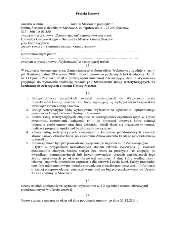 Projekt Umowy zawarta w dniu ….......................... roku w Staszowie pomiędzy : Gminą Staszów z siedzibą w Staszowie, ul. Opatowska 31, 28-200 Staszów, NIP - 866-10-09-350 zwaną w treści umowy „Zamawiającym" reprezentowaną przez: Romualda Garczewskiego – Burmistrza Miasta i Gminy Staszów przy kontrasygnacie Joanny Pokory – Skarbnika Miasta i Gminy Staszów a…................................................................................................................................. reprezentowanym przez: …................................................................................................................................ zwanym w treści umowy „Wykonawcą” o następującej treści: § 1. W rezultacie dokonanego przez Zamawiającego wyboru oferty Wykonawcy zgodnie z art. 4 pkt. 8 ustawy z dnia 29 stycznia 2004 r. Prawo zamówień publicznych (tekst jednolity Dz. U. Nr 113 poz. 759 z roku 2010 z późniejszymi zmianami) Zamawiający zleca, a Wykonawca przyjmuje do wykonania realizację zadania pn.: Świadczenie usług weterynaryjnych na bezdomnych zwierzętach z terenu Gminy Staszów § 2. 1. Usługa dotyczy bezpańskich zwierząt dostarczonych do Wykonawcy przez mieszkańców Gminy Staszów lub firmy zajmującej się wyłapywaniem bezpańskich zwierząt z terenu Gminy Staszów 2. Usługi weterynaryjne będą wykonywane wyłącznie na zgłoszenie uprawnionego pracownika Urzędu Miasta i Gminy w Staszowie 3. Zakres usług weterynaryjnych obejmuje w szczególności czynności ujęte w Opisie przedmiotu zamówienia (załącznik nr 1 do niniejszej umowy), który stanowi integralną część umowy oraz inne działania, jeżeli okażą się niezbędne w ramach realizacji programu opieki nad bezdomnymi zwierzętami. 4. Zakres usług weterynaryjnych związanych z leczeniem przedmiotowych zwierząt strony umowy określać będą, po zgłoszeniu Zmawiającemu każdego indywidualnego przypadku. 5. Eutanazja może być przeprowadzana wyłącznie po uzgodnieniu z Zamawiającym i tylko w przypadkach uzasadnionych stanem zdrowia zwierzęcia tj. zwierząt nieuleczalnie chorych, bardzo starych bez szans na przeżycie lub adopcję; po wypadkach komunikacyjnych lub innych powstałych urazach zagrażających jego życiu; agresywnych po okresie obserwacji minimum 5 dni, które według oceny lekarza stanowią potencjalne zagrożenie dla zdrowia i życia ludzi. Każdy przypadek musi być udokumentowany notatką sporządzoną przez lekarza weterynarii. Informacja o każdej przeprowadzonej eutanazji winna być na bieżąco przekazywana do Urzędu Miasta i Gminy w Staszowie. § 3. Strony ustalają odpłatność za czynności wymienione w § 2 zgodnie z cenami ofertowymi przedstawionymi w ofercie cenowej § 4. Umowa zostaje zawarta na okres od dnia podpisania umowy do dnia 31.12.2011 r. § 5. Wyposażenie w sprzęt, leki i materiały niezbędne do wykonywania usługi zabezpieczy Wykonawca w ilości niezbędnej do prawidłowego wykonania zleconych prac. § 6. 1. Za wykonanie prac stanowiących przedmiot niniejszej umowy ustala się wynagrodzenie na podstawie cen jednostkowych poszczególnych zabiegów określonych w ofercie Wykonawcy 2. Łączna kwota przeznaczona na realizację umowy wynosi do .................................................... złotych brutto (słownie:..........................................) 3. Liczba i rodzaj poszczególnych zabiegów i konsultacji w trakcie trwania umowy może ulec zmianie. 4. Rozliczenie będzie następowało w cyklu miesięcznym, na podstawie faktur wystawionych przez Wykonawcę i dołączonych zestawień faktycznie wykonanych usług weterynaryjnych stanowiących załącznik nr 2 niniejszej umowy oraz notatki z przyjęcia zwierzęcia do lecznicy (załącznik nr 3 do niniejszej umowy). 5 Ceny jednostkowe podane w ofercie cenowej nie będą podlegały rewaloryzacji do końca trwania umowy. 6. Należność za wykonanie usługi regulowana będzie na podstawie miesięcznych faktur wystawianych na: Urząd Miasta i Gminy w Staszowie ul. Opatowska 31, 28-200 Staszów, NIP: 866-10-09-350 w terminie 30 dni od daty ich złożenia. 7. Za termin zapłaty uznaje się dzień obciążenia rachunku Zamawiającego. §7 1. Osobą do kontaktu z ramienia Zamawiającego jest ...................... 2. Osobą do kontaktu z ramienia Wykonawcy jest ............................ §8 Jeżeli zwierzę po wykonaniu zabiegu będzie chorować z winy Wykonawcy (powikłania po zabiegu), zobowiązuje się on do leczenia zwierzęcia bez dodatkowego wynagrodzenia. §9 Wykonawca ponosi pełną odpowiedzialność za szkody powstałe przy realizacji przedmiotu umowy wyrządzone Zamawiającemu lub osobom trzecim. §10 Wykonawca zapłaci Zamawiającemu kary umowne: a) w przypadku odstąpienia od umowy z winy Wykonawcy zapłaci on Zamawiającemu karę umowną w wysokości 10% wynagrodzenia ustalonego w § 6 ust. 1. b) za zwłokę w terminowym wykonaniu zleconych zabiegów - w wysokości 10% ceny brutto za daną usługę obliczoną na podstawie cen jednostkowych podanych w formularzu cenowym – za każdy dzień zwłoki. § 11 Zamawiający może odstąpić od umowy jeżeli Wykonawca nie podjął wykonania obowiązków wynikających z niniejszej umowy lub w przypadku stwierdzenia nienależytego wykonania postanowień umownych przez Wykonawcę. § 12 Ewentualne nieobecności lub przerwy w wykonywaniu usług (urlopy, wyjazdy, choroby, itp.) należy zgłaszać Zamawiającemu z wcześniejszym wyprzedzeniem . § 13 Zamawiający ma prawo uzyskiwania od Wykonawcy bieżących informacji na temat realizacji zadania, a także obserwowania i kontroli Wykonawcy w trakcie wykonywania zdań zleconych przez Zamawiającego oraz wglądu do prowadzonego zestawienia wykonywanych usług. § 14 W sprawach nie uregulowanych w niniejszej umowie mają zastosowanie odpowiednie przepisy kodeksu cywilnego oraz przepisy ustawy Prawo zamówień publicznych. § 15 Zmiany postanowień zawartej umowy nas