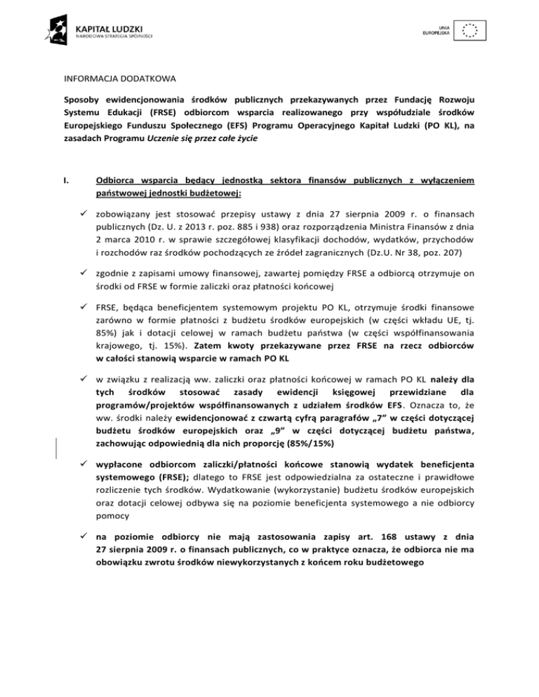 INFORMACJA DODATKOWA Sposoby ewidencjonowania środków publicznych przekazywanych przez Fundację Rozwoju Systemu Edukacji (FRSE) odbiorcom wsparcia realizowanego przy współudziale środków Europejskiego Funduszu Społecznego (EFS) Programu Operacyjnego Kapitał Ludzki (PO KL), na zasadach Programu Uczenie się przez całe życie I. Odbiorca wsparcia będący jednostką sektora finansów publicznych z wyłączeniem państwowej jednostki budżetowej: zobowiązany jest stosować przepisy ustawy z dnia 27 sierpnia 2009 r. o finansach publicznych (Dz. U. z 2013 r. poz. 885 i 938) oraz rozporządzenia Ministra Finansów z dnia 2 marca 2010 r. w sprawie szczegółowej klasyfikacji dochodów, wydatków, przychodów i rozchodów raz środków pochodzących ze źródeł zagranicznych (Dz.U. Nr 38, poz. 207) zgodnie z zapisami umowy finansowej, zawartej pomiędzy FRSE a odbiorcą otrzymuje on środki od FRSE w formie zaliczki oraz płatności końcowej FRSE, będąca beneficjentem systemowym projektu PO KL, otrzymuje środki finansowe zarówno w formie płatności z budżetu środków europejskich (w części wkładu UE, tj. 85%) jak i dotacji celowej w ramach budżetu państwa (w części współfinansowania krajowego, tj. 15%). Zatem kwoty przekazywane przez FRSE na rzecz odbiorców w całości stanowią wsparcie w ramach PO KL w związku z realizacją ww. zaliczki oraz płatności końcowej w ramach PO KL należy dla tych środków stosować zasady ewidencji księgowej przewidziane dla programów/projektów współfinansowanych z udziałem środków EFS. Oznacza to, że ww. środki należy ewidencjonować z czwartą cyfrą paragrafów „7” w części dotyczącej budżetu środków europejskich oraz „9” w części dotyczącej budżetu państwa, zachowując odpowiednią dla nich proporcję (85%/15%) wypłacone odbiorcom zaliczki/płatności końcowe stanowią wydatek beneficjenta systemowego (FRSE); dlatego to FRSE jest odpowiedzialna za ostateczne i prawidłowe rozliczenie tych środków. Wydatkowanie (wykorzystanie) budżetu środków europejskich oraz dotacji celowej odbywa się na poziomie beneficjenta systemowego a nie odbiorcy pomocy na poziomie odbiorcy nie mają zastosowania zapisy art. 168 ustawy z dnia 27 sierpnia 2009 r. o finansach publicznych, co w praktyce oznacza, że odbiorca nie ma obowiązku zwrotu środków niewykorzystanych z końcem roku budżetowego II. Odbiorca wsparcia będący państwową jednostką budżetową (PJB): zobowiązany jest stosować przepisy ustawy z dnia 27 sierpnia 2009 r. o finansach publicznych (Dz. U. z 2013 r. poz. 885 i 938) oraz rozporządzenia Ministra Finansów z dnia 2 marca 2010 r. w sprawie szczegółowej klasyfikacji dochodów, wydatków, przychodów i rozchodów raz środków pochodzących ze źródeł zagranicznych (Dz.U. Nr 38, poz. 207) jest podmiotem funkcjonującym i finansującym się na podstawie przepisów ustawy o finansach publicznych; co oznacza brak możliwości otrzymywania zaliczki/płatności końcowej od podmiotów zewnętrznych (tu: FRSE) zapewnia finansowanie swoich zobowiązań bezpośrednio z budżetu środków europejskich oraz środków budżetu państwa ujętych w części budżetowej dysponenta środków, w ramach której finansowana jest dana jednostka. O wysokości środków faktycznie wydatkowanych, PJB informuje FRSE celem ich rozliczenia we wniosku o płatność środki na finansowanie zadań, zarówno w części finansowania EFS jak i współfinansowania krajowego, mogą pochodzić również z rezerw celowych budżetu środków europejskich oraz budżetu państwa, o które dysponent wnioskuje zgodnie z Procedurą uruchamiania oraz przyznawania zapewnienia finansowania lub dofinansowania przedsięwzięcia ze środków rezerwy celowej budżetu państwa i budżetu środków europejskich dla programów i projektów realizowanych z udziałem środków pochodzących z budżetu Unii Europejskiej oraz (…) FRSE, będąca beneficjentem systemowym projektu PO KL, otrzymuje środki finansowe zarówno w formie płatności z budżetu środków europejskich (w części wkładu UE, tj. 85%) jak i dotacji celowej w ramach budżetu państwa (w części współfinansowania krajowego, tj. 15%). Zatem środki, którymi dysponuje PJB na realizację wsparcia (wydatków) projektów PO KL, realizowanych na zasadach Programu Uczenie się przez całe życie mają także charakter środków wydatkowanych w ramach programów współfinansowanych z funduszy strukturalnych w związku z realizacją wydatków w ramach przedmiotowego wsparcia w ramach PO KL, należy dla tych środków stosować zasady ewidencji księgowej przewidziane dla programów/projektów współfinansowanych z udziałem środków EFS. Oznacza to, że PJB powinna ww. środki ewidencjonować z czwartą cyfrą paragrafów „7” w części dotyczącej budżetu środków europejskich1 oraz „9” w części dotyczącej budżetu państwa, zachowując odpowiednią dla nich proporcję (85%/15%) 1 Zgodnie z art. 188 ustawy o finansach publicznych, PJB powinna zostać umocowana - przez instytucję, z która PJB zawarła umowę finansową (tu: FRSE) oraz dysponenta części budżetowej, w ciężar której realizowane będą wydatki, do składania zleceń płatności