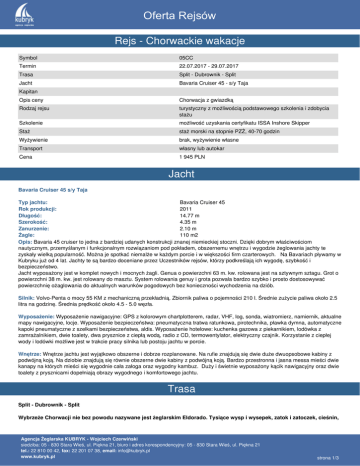 Oferta Rejsów Rejs - Chorwackie wakacje Symbol 05CC Termin 22.07.2017 - 29.07.2017 Trasa Split - Dubrownik - Split Jacht Bavaria Cruiser 45 - s/y Taja Kapitan Opis ceny Chorwacja z gwiazdką Rodzaj rejsu turystyczny z możliwością podstawowego szkolenia i zdobycia stażu Szkolenie możliwość uzyskania certyfikatu ISSA Inshore Skipper Staż staż morski na stopnie PZŻ, 40-70 godzin Wyżywienie brak, wyżywienie własne Transport własny lub autokar Cena 1 945 PLN Jacht Bavaria Cruiser 45 s/y Taja Typ jachtu: Bavaria Cruiser 45 Rok produkcji: 2011 Długość: 14.77 m Szerokość: 4.35 m Zanurzenie: 2.10 m Żagle: 110 m2 Opis: Bavaria 45 cruiser to jedna z bardziej udanych konstrukcji znanej niemieckiej stoczni. Dzięki dobrym właściwościom nautycznym, przemyślanym i funkcjonalnym rozwiązaniom pod pokładem, obszernemu wnętrzu i wygodzie żeglowania jachty te zyskały wielką popularność. Można je spotkać niemalże w każdym porcie i w większości firm czarterowych. Na Bavariach pływamy w Kubryku już od 4 lat. Jachty te są bardzo doceniane przez Uczestników rejsów, którzy podkreślają ich wygodę, szybkość i bezpieczeństwo. Jacht wyposażony jest w komplet nowych i mocnych żagli. Genua o powierzchni 63 m. kw. rolowana jest na sztywnym sztagu. Grot o powierzchni 38 m. kw. jest rolowany do masztu. System rolowania genuy i grota pozwala bardzo szybko i prosto dostosowywać powierzchnię ożaglowania do aktualnych warunków pogodowych bez konieczności wychodzenia na dziób. Silnik: Volvo-Penta o mocy 55 KM z mechaniczną przekładnią. Zbiornik paliwa o pojemności 210 l. Średnie zużycie paliwa około 2.5 litra na godzinę. Średnia prędkość około 4.5 - 5.0 węzła. Wyposażenie: Wyposażenie nawigacyjne: GPS z kolorowym chartplotterem, radar, VHF, log, sonda, wiatromierz, namiernik, aktualne mapy nawigacyjne, locje. Wyposażenie bezpieczeństwa: pneumatyczna tratwa ratunkowa, pirotechnika, pławka dymna, automatyczne kapoki pneumatyczne z szelkami bezpieczeństwa, aldis. Wyposażenie hotelowe: kuchenka gazowa z piekarnikiem, lodówka z zamrażalnikiem, dwie toalety, dwa prysznice z ciepłą wodą, radio z CD, termowentylator, elektryczny czajnik. Korzystanie z ciepłej wody i lodówki możliwe jest w trakcie pracy silnika lub postoju jachtu w porcie. Wnętrze: Wnętrze jachtu jest wyjątkowo obszerne i dobrze rozplanowane. Na rufie znajdują się dwie duże dwuopsobowe kabiny z podwójną koją. Na dziobie znajdują się równie obszerne dwie kabiny z podwójną koją. Bardzo przestronna i jasna messa mieści dwie kanapy na których mieści się wygodnie cała załoga oraz wygodny kambuz. Duży i świetnie wyposażony kącik nawigacyjny oraz dwie toalety z prysznicami dopełniają obrazy wygodnego i komfortowego jachtu. Trasa Split - Dubrownik - Split Wybrzeże Chorwacji nie bez powodu nazywane jest żeglarskim Eldorado. Tysiące wysp i wysepek, zatok i zatoczek, cieśnin, Agencja Żeglarska KUBRYK - Wojciech Czerwiński siedziba: 05 - 830 Stara Wieś, ul. Piękna 21, biuro i adres korespondencyjny: 05 - 830 Stara Wieś, ul. Piękna 21 tel.: 22 810 00 42, fax: 22 201 07 38, email: [email protected] www.kubryk.pl strona 1/3 Oferta Rejsów kanałów i raf wyzwala w każdym żeglarzu gorączkę odkrywcy. Krystalicznie czysta woda i turkusowe zatoki – o tym marzy każdy siedząc za biurkiem. A chorwacka część Adriatyku ma najczystszą wodę na całym północnym Morzu Śródziemnym. Śródziemnomorskie słońce i wysokie temperatury pozwalają na pływanie od wczesnej wiosny do późnej jesieni. Kryształowo czysta, ciepła i błękitna woda zachęca do częstych kąpieli w zatoczkach. Przewidywalne wiatry i osłonięte od fal morze zapewniają przyjemną i spokojną żeglugę. Mnogość marin, portów, zatok i kotwicowisk daje ogromną swobodę w wyborze trasy rejsu i pozwala żeglować od portu do portu, od wyspy do wyspy jedynie w dzień. Nie do przecenienia jest również powalająca śródziemnomorska kuchnia, której koniecznie trzeba skosztować w lokalnych tawernach. Grillowane ryby i owoce morza złowione kilka godzin wcześniej, tradycyjna zupa rybna Brudet, niezwykłe Brodetto przygotowane z ryb, cebuli, pomidorów, marchwi i wina smakują zupełnie wyjątkowo w knajpce tuż nad brzegiem morza. Tradycyjna muzyka na żywo i domowe wino sprawiają, że wakacje zostają na długo w pamięci. To niezwykłe, że tak fascynujące miejsce na wymarzone żeglarskie wakacje z rodziną i przyjaciółmi znajduje się tak niedaleko nas! Trasa rejsu 7 dniowego Split - Dubrovnik - Split to 294 Mm. Planowne porty: Split, Dubrovnik, Wyspa Mliet, Wyspa Korcula, Wyspa Hvar, Sv. Klement, Wyspa Brac, Split. Informacje Cena: 1 945 PLN własny lub autokar Dojazd i powrót nie są wliczone w cenę rejsu. Oferujemy dedykowane żeglarzom połączenie Polski i Chorwacji, obsługiwane przez nowe i komfortowe autokary. Wyjazd z Polski w piątek i powrót w niedzielę oraz przystanek tuż przy marinie to główne zalety tej oferty. Przejazd w obie strony dla uczestników rejsów w promocyjnej cenie 400 PLN. Szczegółowy rozkład jazdy autokaru >>> Zbiórka Seget, 22.07.2017, godz. 17:00 Pakiety ubezpieczeniowe Pakiet minimalny, wliczony w cenę rejsu - 0 PLN Allianz Globtroter SILVER - 58 PLN Allianz Globtroter GOLD - 78 PLN Allianz Globtroter PLATINIUM - 112 PLN Miejsce zaokrętowania Split Miejsce wyokrętowania Split Cena brutto w PLN zawiera: miejsce na jachcie, prowadzenie jachtu przez uprawnionego kapitana, podatek VAT, pakiet VIP. Pakiet VIP zawiera: ubezpieczenie KL i NNW, transit log, sprzątanie końcowe, kaucję, opłatę klimatyczną, Wi-Fi. Cena nie zawiera: wyżywienia, paliwa, opłat portowych, dojazdu. Zaliczka: 50% płatne przy podpisaniu umowy. Reszta: 50% na 5 tygodni przed rozpoczęciem rejsu. Rabat: -3% przy płatności jednorazowej (tylko przy rezerwacji na więcej niż 5 tygodni przed rozpoczęciem rejsu). Dopłata: +3% przy płatności w trzech ratach.
