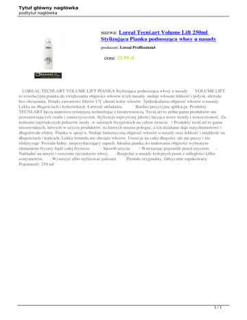 Tytuł główny nagłówka podtytuł nagłówka nazwa: Loreal Tecni.art Volume Lift 250ml Stylizująca Pianka podnosząca włosy u nasady producent: Loreal Proffessionel cena: 33.99 zł LOREAL TECNI.ART VOLUME LIFT PIANKA Stylizująca podnosząca włosy u nasady VOLUME LIFT to rewelacyjna pianka do zwiększania objętości włosów u ich nasady, nadaje włosom lekkość i połysk, utrwala bez obciążania. Dzięki zawartości filtrów UV chroni kolor włosów. Spektakularna objętość włosów u nasady. Lekka na długościach i końcówkach. Łatwość układania. Bardzo precyzyjna aplikacja. Produkty TECNI.ART łączą najnowocześniejszą technologię z kreatywnością. Tecni.art to pełna gama produktów nie pozostawiających osadu i zanieczyszczeń. Stylizacja najwyższej jakości łącząca nowe trendy i nowoczesność. Za kulisami największych pokazów mody, w salonach fryzjerskich na całym świecie. Produkty tecni.art to gama niezawodnych, łatwych w użyciu produktów, na których można polegać, a ich działanie daje natychmiastowe i długotrwałe efekty. Pianka w spray'u. Nadaje fantastyczną objętość włosów u nasady oraz lekkość i miękkość na długościach i końcach. Lekka formuła nie obciąża włosów. Unosi je na całej długości, ale nie puszy i nie elektryzuje. Posiada ładny, nieprzytłaczający zapach. Idealna pianka do nadawania objętości wybranym elementom fryzury bądź całej fryzurze. Sposób użycia: - Wstrząsnąć pojemnik przed użyciem. Nakładać na umyte i osuszone ręcznikiem włosy. - Rozpylać u nasady kolejnych pasm z odległości kilku centymetrów. - Wysuszyć albo stylizować palcami Produkt oryginalny, fabrycznie zapakowany. Pojemność: 250 ml 1/1