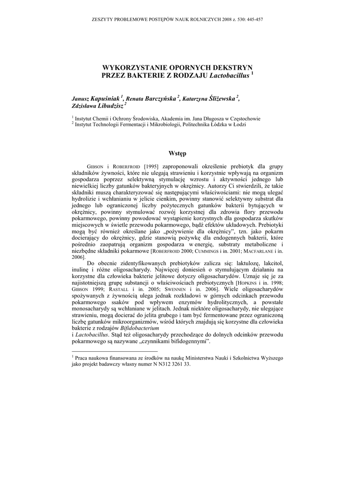 ZESZYTY PROBLEMOWE POSTĘPÓW NAUK ROLNICZYCH 2008 z. 530: 445-457 WYKORZYSTANIE OPORNYCH DEKSTRYN PRZEZ BAKTERIE Z RODZAJU Lactobacillus 1 1 2 2 Janusz Kapuśniak , Renata Barczyńska , Katarzyna ŚliŜewska , 2 Zdzisława Libudzisz 1 2 Instytut Chemii i Ochrony Środowiska, Akademia im. Jana Długosza w Częstochowie Instytut Technologii Fermentacji i Mikrobiologii, Politechnika Łódzka w Łodzi Wstęp GIBSON i ROBERFROID [1995] zaproponowali określenie prebiotyk dla grupy składników Ŝywności, które nie ulegają strawieniu i korzystnie wpływają na organizm gospodarza poprzez selektywną stymulację wzrostu i aktywności jednego lub niewielkiej liczby gatunków bakteryjnych w okręŜnicy. Autorzy Ci stwierdzili, Ŝe takie składniki muszą charakteryzować się następującymi właściwościami: nie mogą ulegać hydrolizie i wchłanianiu w jelicie cienkim, powinny stanowić selektywny substrat dla jednego lub ograniczonej liczby poŜytecznych gatunków bakterii bytujących w okręŜnicy, powinny stymulować rozwój korzystnej dla zdrowia flory przewodu pokarmowego, powinny powodować wystąpienie korzystnych dla gospodarza skutków miejscowych w świetle przewodu pokarmowego, bądź efektów układowych. Prebiotyki mogą być równieŜ określane jako „poŜywienie dla okręŜnicy”, tzn. jako pokarm docierający do okręŜnicy, gdzie stanowią poŜywkę dla endogennych bakterii, które pośrednio zaopatrują organizm gospodarza w energię, substraty metaboliczne i niezbędne składniki pokarmowe [ROBERFROID 2000; CUMMINGS i in. 2001; MACFARLANE i in. 2006]. Do obecnie zidentyfikowanych prebiotyków zalicza się: laktulozę, lakcitol, inulinę i róŜne oligosacharydy. Najwięcej doniesień o stymulującym działaniu na korzystne dla człowieka bakterie jelitowe dotyczy oligosacharydów. Uznaje się je za najistotniejszą grupę substancji o właściwościach prebiotycznych [HOPKINS i in. 1998; GIBSON 1999; RASTALL i in. 2005; SWENNEN i in. 2006]. Wiele oligosacharydów spoŜywanych z Ŝywnością ulega jednak rozkładowi w górnych odcinkach przewodu pokarmowego ssaków pod wpływem enzymów hydrolitycznych, a powstałe monosacharydy są wchłaniane w jelitach. Jednak niektóre oligosacharydy, nie ulegające strawieniu, mogą docierać do jelita grubego i tam być fermentowane przez ograniczoną liczbę gatunków mikroorganizmów, wśród których znajdują się korzystne dla człowieka bakterie z rodzajów Bifidobacterium i Lactobacillus. Stąd teŜ oligosacharydy przechodzące do dolnych odcinków przewodu pokarmowego są nazywane „czynnikami bifidogennymi”. 1 Praca naukowa finansowana ze środków na naukę Ministerstwa Nauki i Szkolnictwa WyŜszego jako projekt badawczy własny numer N N312 3261 33. 446 J. Kapuśniak i inni Ze względu na ograniczoną ilość substancji selektywnie wykorzystywanych przez korzystną dla człowieka mikroflorę jelitową, wciąŜ istnieje duŜe zapotrzebowanie na nowe prebiotyki, które moŜna by z powodzeniem wykorzystać w profilaktyce i kontroli funkcjonowania jelita grubego. DuŜe nadzieje wiąŜe się z zastosowaniem produktów skrobiowych, w szczególności skrobi opornej [ASP i in. 1996; CUMMINGS i in. 1996; TOPPING, CLIFTON 2001; NUGENT 2005] oraz produktów otrzymywanych w wyniku częściowej degradacji skrobi [LESZCZYŃSKI 2004]. Dekstrynizacja skrobi prowadzona w odpowiednich warunkach została zaproponowana jako metoda otrzymywania dekstryn o właściwościach skrobi opornej [OHKUMA i in. 1990]. Dekstryny te zostały nazwane opornymi dekstrynami. Są one definiowane jako krótkołańcuchowe polimery glukozy, które są oporne na działanie enzymów przewodu pokarmowego człowieka. Większość spośród handlowo dostępnych opornych dekstryn jest wytwarzanych ze skrobi poprzez działanie na nią temperaturą lub temperaturą i kwasem [Panel on the definition of dietary fiber 2001]. Oporne dekstryny są dostępne handlowo. Dobrze znaną rozpuszczalną oporną dekstryną jest Fibersol®. Fibersol® wykazuje szereg korzyści fizjologicznych: jest wolnofermentowany [FLICKINGER i in. 2000], reguluje poziom glukozy we krwi, a w konsekwencji takŜe poziom insuliny [UNNO i in. 2002], redukuje poziom trójglicerydów i cholesterolu [YAMAMOTO 2007], zmniejsza ilość tkanki tłuszczowej w trzewiach [OHKUMA i in. 2006], utrzymuje prawidłowy stan okręŜnicy, redukuje częstotliwość występowania chorób jelita grubego poprzez zwiększenie objętości stolca, wilgotności i zredukowanie czasu przejścia [TAKAGAKI i in. 2001]. Wykazano, Ŝe Fibersol® stymuluje wzrost korzystnej flory jelitowej i szczepów bakterii terapeutycznie wprowadzanych do jelita grubego jako probiotyki. Z kolei metabolity korzystnej flory jelitowej hamują wzrost bakterii patogennych [MATSUDA, SATOUCHI 1997; HOPKINS i in. 1998]. Innym komercyjnym przykładem opornej dekstryny jest Nutriose®. Nutriose® charakteryzuje się wysoką tolerancją pokarmową potwierdzoną w badaniach klinicznych krótkoterminowych [VAN DEN HEUVEL i in. 2004] i długoterminowych [PASMAN i in. 2006]. Produkt spoŜywczy moŜe zawierać 20-25% wagowych preparatu. Nawet tak wysokie stęŜenie dekstryny w poŜywieniu nie powoduje dyskomfortu oraz pęcznienia brzucha. Około 15% preparatu Nutriose® jest absorbowane w jelicie cienkim, około 75% jest fermentowane w jelicie grubym, a reszta (10%) - wydalane. Nutriose® sprzyja rozwojowi bakterii probiotycznych, których metabolity hamują wzrost chorobotwórczych bakterii z rodzaju Clostridium w jelicie grubym [PASMAN i in. 2006; LEFRANC-MILLOT i in. 2006]. Ponadto Nutriose® przyczynia się do obniŜenia pH kału, zwiększenia produkcji krótkołańcuchowych kwasów tłuszczowych [PASMAN i in. 2006; LEFRANC-MILLOT i in. 2006], wpływa na zwiększenie produkcji enzymów fekalnych pochodzenia mikrobiologicznego [VAN DEN HEUVEL i in. 2004; PASMAN i in. 2006; LEFRANC® MILLOT i in. 2006]. Preparat Nutriose znalazł szerokie zastosowanie jako