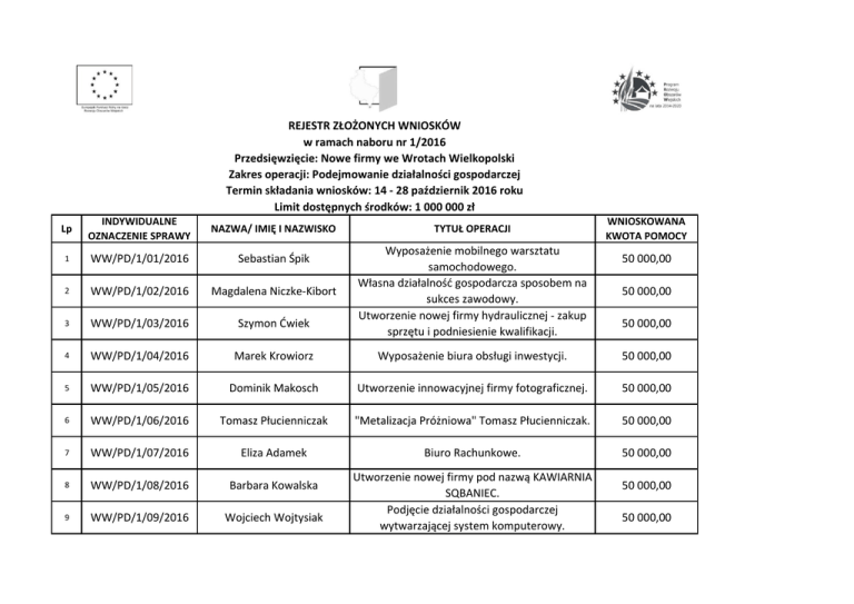 REJESTR ZŁOŻONYCH WNIOSKÓW w ramach naboru nr 1/2016 Przedsięwzięcie: Nowe firmy we Wrotach Wielkopolski Zakres operacji: Podejmowanie działalności gospodarczej Termin składania wniosków: 14 - 28 październik 2016 roku Limit dostępnych środków: 1 000 000 zł Lp INDYWIDUALNE OZNACZENIE SPRAWY NAZWA/ IMIĘ I NAZWISKO 1 WW/PD/1/01/2016 Sebastian Śpik 2 WW/PD/1/02/2016 Magdalena Niczke-Kibort 3 WW/PD/1/03/2016 Szymon Ćwiek 4 WW/PD/1/04/2016 Marek Krowiorz Wyposażenie biura obsługi inwestycji. 50 000,00 5 WW/PD/1/05/2016 Dominik Makosch Utworzenie innowacyjnej firmy fotograficznej. 50 000,00 6 WW/PD/1/06/2016 Tomasz Płucienniczak "Metalizacja Próżniowa" Tomasz Płucienniczak. 50 000,00 7 WW/PD/1/07/2016 Eliza Adamek Biuro Rachunkowe. 50 000,00 8 WW/PD/1/08/2016 Barbara Kowalska 9 WW/PD/1/09/2016 Wojciech Wojtysiak TYTUŁ OPERACJI Wyposażenie mobilnego warsztatu samochodowego. Własna działalność gospodarcza sposobem na sukces zawodowy. Utworzenie nowej firmy hydraulicznej - zakup sprzętu i podniesienie kwalifikacji. Utworzenie nowej firmy pod nazwą KAWIARNIA SQBANIEC. Podjęcie działalności gospodarczej wytwarzającej system komputerowy. WNIOSKOWANA KWOTA POMOCY 50 000,00 50 000,00 50 000,00 50 000,00 50 000,00 10 WW/PD/1/10/2016 Przemysław Jarczak 11 WW/PD/1/11/2016 Paweł Gatner 12 WW/PD/1/12/2016 Marcin Orszulak 13 WW/PD/1/13/2016 Jakub Kurczbuch 14 WW/PD/1/14/2016 Marek Jeziorny 15 WW/PD/1/15/2016 Grzegorz Stasiak PRODUKCJA STELAŻY MEBLOWYCH DREW - MAX. Utworzenie Specjalistycznego Gabinetu Fizjoterapii na obszarze LSR. Utworzenie nowej firmy na obszarze LGD. Budowa maszyn i urządzeń do pakowania w folię termokurczliwą. Utworzenie nowej działalności gospodarczej świadczącej usługi instalatorsko-hydrauliczne. Utworzenie firmy świadczącej usługi w zakresie klasyfikacji gruntów. SUMA: 50 000,00 50 000,00 50 000,00 50 000,00 50 000,00 50 000,00 750 000,00