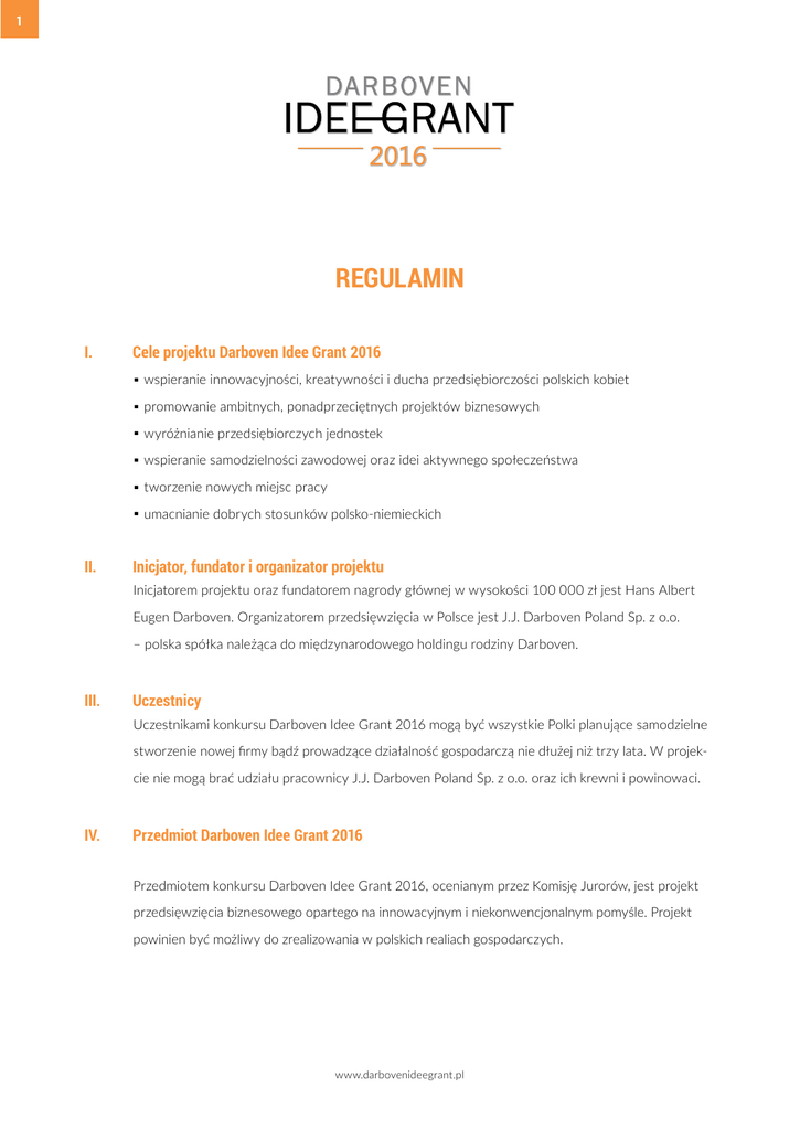 1 REGULAMIN I. Cele projektu Darboven Idee Grant 2016 II. Inicjator, fundator i organizator projektu . wspieranie innowacyjności, kreatywności i ducha przedsiębiorczości polskich kobiet . promowanie ambitnych, ponadprzeciętnych projektów biznesowych . wyróżnianie przedsiębiorczych jednostek . wspieranie samodzielności zawodowej oraz idei aktywnego społeczeństwa . tworzenie nowych miejsc pracy . umacnianie dobrych stosunków polsko-niemieckich Inicjatorem projektu oraz fundatorem nagrody głównej w wysokości 100 000 zł jest Hans Albert Eugen Darboven. Organizatorem przedsięwzięcia w Polsce jest J.J. Darboven Poland Sp. z o.o. – polska spółka należąca do międzynarodowego holdingu rodziny Darboven. III.Uczestnicy Uczestnikami konkursu Darboven Idee Grant 2016 mogą być wszystkie Polki planujące samodzielne stworzenie nowej firmy bądź prowadzące działalność gospodarczą nie dłużej niż trzy lata. W projekcie nie mogą brać udziału pracownicy J.J. Darboven Poland Sp. z o.o. oraz ich krewni i powinowaci. IV. Przedmiot Darboven Idee Grant 2016 Przedmiotem konkursu Darboven Idee Grant 2016, ocenianym przez Komisję Jurorów, jest projekt przedsięwzięcia biznesowego opartego na innowacyjnym i niekonwencjonalnym pomyśle. Projekt powinien być możliwy do zrealizowania w polskich realiach gospodarczych. www.darbovenideegrant.pl 2 V. Zgłoszenia uczestników Zgłoszenia do konkursu dokonuje się przez wypełnienie formularza i przesłanie go na podany w nim adres do dnia 11 września 2016 roku. Formularz konkursowy można pobrać ze strony internetowej www.darbovenideegrant.pl lub zamówić go telefonicznie pod numerem 58 671 21 71. Formularz konkursowy zostanie udostępniony przez Organizatora na stronie www.darbovenideegrant.pl po zakończeniu Inauguracji, która odbędzie się 19.04.2016 roku. W przypadku wysyłki formularza pocztą tradycyjną decyduje data stempla pocztowego. W przypadku wysyłki mailowej termin nadsyłania zgłoszeń mija 11.09.2016 roku o godzinie 23.59. VI. Wyłonienie laureatki Wyłonieniem laureatki zajmuje się Komisja Jurorów, w skład której wchodzą wybitne postaci polskiego i niemieckiego życia gospodarczego, kulturalnego i społecznego. VII.Nagroda Nagrodą dla laureatki, autorki najlepszego projektu wyłonionego przez Komisję Jurorów, jest kwota 100 000 zł brutto, pomniejszona o podatek, o którym mowa w art. 30. pkt. 1 ust. 2) Ustawy z dnia 26 lipca 1991 r. o podatku dochodowym od osób fizycznych. VII. Przebieg konkursu i harmonogram prac jury . 19.04.2016 Inauguracja konkursu w Hotelu Sheraton w Sopocie www.darbovenideegrant.pl 3 . 19.04.2016–11.09.2016 Przyjmowanie zgłoszeń Formularz konkursowy zostanie udostępniony przez Organizatora na stronie www.darbovenideegrant.pl po zakończeniu Inauguracji. W przypadku wysyłki formularza pocztą tradycyjną decyduje data stempla pocztowego. Adres wysyłki: J.J. Darboven Poland Sp. z o.o. ul. Kolejowa 54 84-230 Rumia z dopiskiem: Darboven Idee Grant – zgłoszenie konkursowe. W przypadku wysyłki mailowej termin nadsyłania zgłoszeń mija 11.09.2016 roku o godzinie 23.59. Adres wysyłki [email protected], tytuł e-maila: Zgłoszenie konkursowe – imię i nazwisko. . 12.09.2016–18.09.2016 Weryfikacja nadesłanych projektów . 19–20.09.2016 I posiedzenie Komisji Jurorów, wyłonienie kilkuosobowej grupy finalistek . 7.11.2016 II posiedzenie Jury, prezentacja projektów finalistek . 8.11.2016 Oficjalne ogłoszenie wyników z wręczeniem nagrody głównej – 100 000 zł www.darbovenideegrant.pl