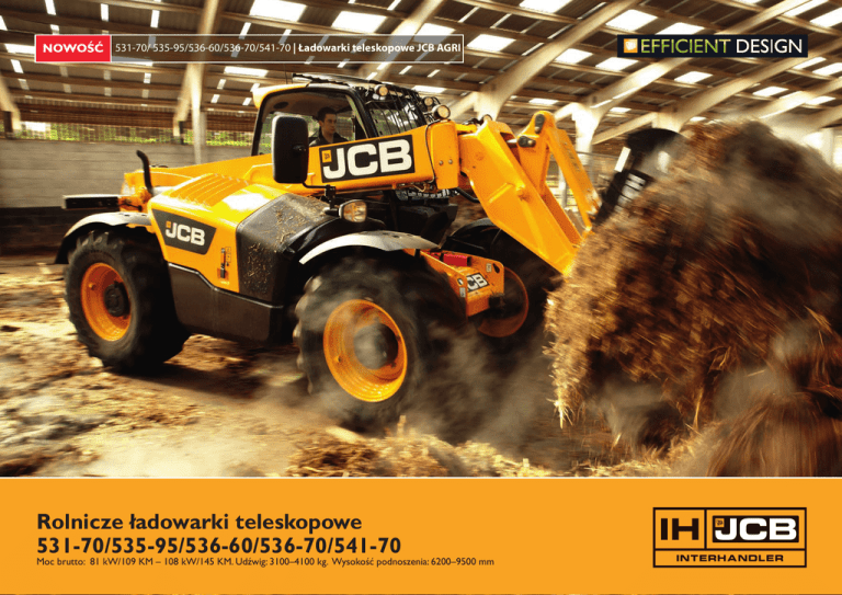 531-70/ 535-95/536-60/536-70/541-70 | Ładowarki teleskopowe JCB AGRI Rolnicze ładowarki teleskopowe 531-70/535-95/536-60/536-70/541-70 Moc brutto: 81 kW/109 KM – 108 kW/145 KM. Udźwig: 3100–4100 kg. Wysokość podnoszenia: 6200–9500 mm Oszczędź na paliwie w ciągu 3 lat 4676 funtów* Każda nowa ładowarka teleskopowa JCB Agri jest efektem naszego programu wydajnych projektów „Efficien Desi”. Oznacza to, że niezależnie jaki model maszyny wybierzesz spodziewać się możesz oszczędności. Tak więc maszyny te wyposażone są w oszczędny w zużyciu paliwa i zdobywający nagrody silnik T4i EcoMAX oraz liczne innowacyjne udoskonalenia jak możliwość zmiany biegów na dźwigni sterowania, inteligentną konsolę sterowania, wentylator chłodzenia o zmiennej prędkości oraz skierowany ku górze wylot powietrza.W celu uzyskanie niezrównanej wydajności maszyna opcjonalnie może być rów-nież wyposażona w silnik o mocy 145KM. Konstrukcja „Efficit Design” oznacza również oszczędności dla środowiska naturalnego; zrównoważony proces produkcyjny prowadzi do wytworzenia maszyny oddziaływującej w najmniejszym stopniu na środowisko naturalne, za-równo na etapie produkcji, okresu użytkowania jak i po zakończeniu jej pracy.Najprościej ujmując, nowe ładowarki teleskopowe JCB Agri zaprojektowane są dla oszczędności pieniędzy, czasu i środowiska naturalnego.* *Wyliczenie dokonane w oparciu o porównanie wyników testów nowej maszyny T4i 541-70 Agri Super 93kW i starszej ma-szy- ny T3 541-70 Agri Super 97kW, przeliczonych na roczny czas pracy 1000 motogodzin i cenie paliwa 72pensów za litr przy mieszanym cyklu pracy maszyny. Dane te oraz potencjalne oszczędności oparte są o badania finy JCB. Wyniki te należy traktować wyłącznie jako dane informacyjne o potencjalnych oszczędnościach i nie powinny być traktowane jako faktyczne oszczędności. Firma JCB zastrzega sobie prawo do zmian i korekty obliczeń. RODZINA NOWYCH ŁADOWAREK TELESKOPOWYCH JCB AGRI ZAPROJEKTOWANA ZOSTAŁA Z MYŚLĄ O NAJLEPSZYM WYKORZYSTANIU TWOJEGO CZASU I PIENIĘDZY. OZNACZA TO, ŻE MOŻESZ OD NIEJ OCZEKIWAĆ WSPANIAŁYCH OSIĄGÓW, UNIWERSALNOŚCI, WIDOCZNOŚCI, DOSKONAŁYCH CZASÓW CYKLI ROBOCZYCH, ERGONOMII STEROWANIA, CZYLI W EFEKCIE NAJWYŻSZEJ WYDAJNOŚCI. Wydajna maszyna 1 Ładowarki teleskopowe JCB Agri są niezwykle manewrowe i kompatowe a olbrzymi kąt skrętu pozwala na zaoszczędzenie cennego czasu w miejscu pracy. 2 Ładowarki teleskopowe JCB Agri standardowo posiadają napęd na cztery koła (istnieje możliwość wyboru napędu na dwa koła w celu ograniczenia zużycia ogumienia i zaoszczędzenia paliwa podczas jazdy po drogach), pomagający zachować doskonałe własności trakcyjne i osiągi maszyny w grząskim miękkim podłożu. Również jako opcja dostępny jest mechanizm różnicowy o ograniczonym poślizgu. Nowy, wydajny silniki JCB EcoMAX T4i zapewnia moc i moment obrotowy przy niskich prędkościach obrotowych zapewniając odpowiednią reakcję maszyny a nasza szeroka oferta ładowarek teleskopowych JCB Agri oznacza, że możesz wybrać model najlepiej odpowiadający Twoim wymaganiom. Dzięki zastosowaniu turbosprężarki o zmiennej geometrii silniki JCB EcoMAX T4i zapewnia doskonałe parametry pracy na niskich obrotach i może dzięki temu ograniczyć zużycie paliwa. Wydajny układ hydrauliczny i układ podnoszenia 4 Dzięki temu wydajność pracy podczas szybkiego przemieszczani się po drogach czy jazdy w nierównym terenie jest wyższa. Szybkozłącza JCB pozwalają na szybką i łatwą wymia-nę osprzętu w standardach „Pin and Cone”, JCB Q-fitoraz w wersji przemysłowej. 3 Układ amortyzacji (SRS) pozwala na ograniczenie drgań przenoszonych przez wysięgnik i zapewnia polepszenia warunków przewożenia ładunków jak również zwiększa komfort pracy operatora. 5 W celu zapewnienia najlepszych parametrów podnoszenia, wysuwania, spychania oraz najszybszych cykli roboczych maszyny wyposażone są w wiodący w swojej klasie układ hydrauliczny „Varifl”. 4 Ładowarki teleskopowe JCB Agri | 531-70/535-95/536-60/536-70/541-70 NIEZRÓWNANE OSIĄGI, NIEZRÓWNANA WYDAJNOŚĆ PRACY Elementy sterowania wpływające na wydajność pracy 6 Ładowarki teleskopowe JCB AGRI umożliwiają pracę w trzech trybach kierowania. Kierowanie skrętem dwóch kół jest idealne do jazdy po drogach z dużą prędkości; kierowaniem skrętem czterech kół jest idealne podczas pracy w ograniczonej przestrzeni; a tryb „kraba” jest idealny do manewrowania maszyną w pobliżu ścian i budynków. 7 Umieszczona na dźwigni sterowania manualna lub automatyczna zmiana biegów we wszystkich modelach oznacza, że zmianę prędkość i kierunku jazdy możesz wykonać szybko i łatwo przy użyciu jednej ergonomicznej dźwigni sterowania. Możliwość rozłączenia układu napędowego przy wciśnięciu pedału hamulca zapewnia wspaniałą wielofunkcyjność oraz wzrost mocy podczas prac załadunkowych i przeładunkowych. Hamowanie jest płynne i czułe dzięki zastosowanemu na wszystkich kołach układowi serwowspomagania. 8 W celu zwiększenia uniwersalności, wszystkie ładowarki teleskopowe JCB Agri wyposażone są standardowo w pojedyncze dodatkowe przyłącze hydrauliczne na wysięgniku które to może służyć do zasilenia szerokiego asortymentu osprzętu. Ładowarki teleskopowe JCB Agri | 531-70/535-95/536-60/536-70/541-70 5 EFEKTY INWESTYCYJNE ŁADOWARKI TELESKOPOWE JCB AGRI SĄ NIE TYLKO EKONOMICZNE W EKSPLOATACJI – SĄ RÓWNIEŻ BARDZO EKONOMICZNE W POSIADANIU I PRACY. MASZYNY ZOSTAŁY ZAPROJEKTOWANE W TAKI SPOSÓB, ABY ZAPEWNIĆ TOBIE MAKSYMALNY ZWROT INWESTYCJI, PRZY OLBRZYMIEJ OSZCZĘDNOŚCI W ZUŻYCIU PALIWA, ZACHOWANIU WYSOKIEJ WARTOŚCI W PRZYPADKU ODSPRZEDAŻY MASZYNY ORAZ NISKICH KOSZTACH PRACY WSZYSTKICH PODZESPOŁÓW MASZYNY. Wydajność EcoMAX 1 Silniki EcoMAX o mocy 81kW, 93kW oraz 108kW wyposażone są w wentylator o zmiennej prędkości, który
