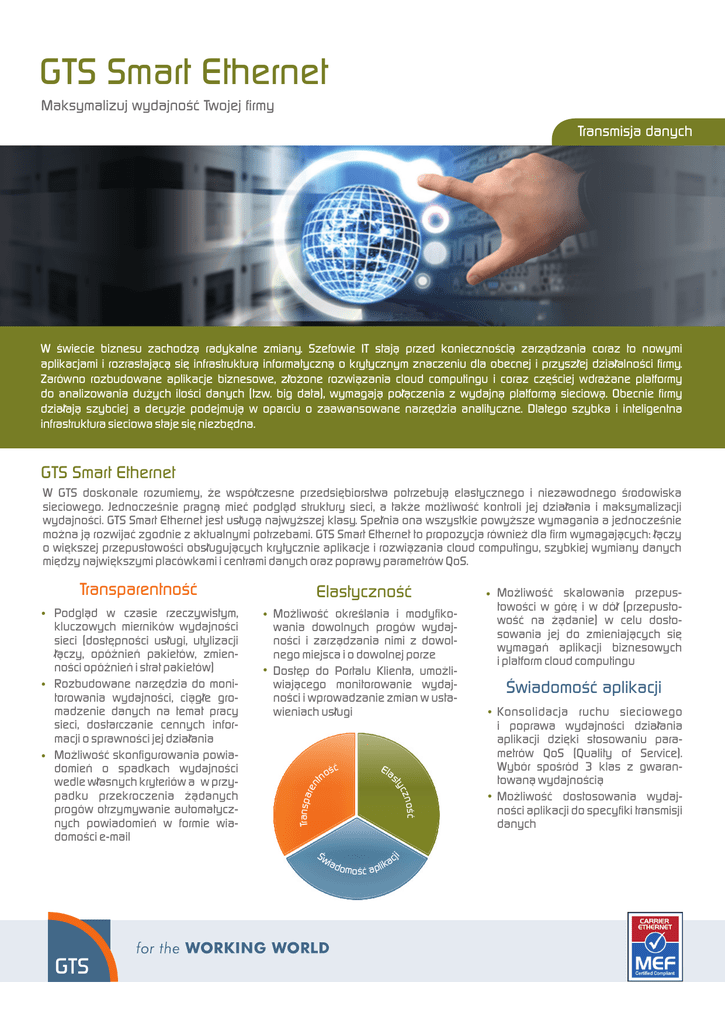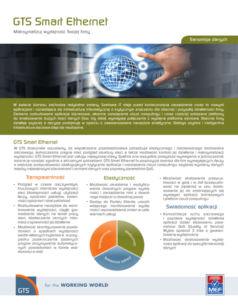 GTS Smart Ethernet Maksymalizuj wydajność Twojej firmy Transmisja danych W świecie biznesu zachodzą radykalne zmiany. Szefowie IT stają przed koniecznością zarządzania coraz to nowymi aplikacjami i rozrastającą się infrastrukturą informatyczną o krytycznym znaczeniu dla obecnej i przyszłej działalności firmy. Zarówno rozbudowane aplikacje biznesowe, złożone rozwiązania cloud computingu i coraz częściej wdrażane platformy do analizowania dużych ilości danych (tzw. big data), wymagają połączenia z wydajną platformą sieciową. Obecnie firmy działają szybciej a decyzje podejmują w oparciu o zaawansowane narzędzia analityczne. Dlatego szybka i inteligentna infrastruktura sieciowa staje się niezbędna. GTS Smart Ethernet W GTS doskonale rozumiemy, że współczesne przedsiębiorstwa potrzebują elastycznego i niezawodnego środowiska sieciowego. Jednocześnie pragną mieć podgląd struktury sieci, a także możliwość kontroli jej działania i maksymalizacji wydajności. GTS Smart Ethernet jest usługą najwyższej klasy. Spełnia ona wszystkie powyższe wymagania a jednocześnie można ją rozwijać zgodnie z aktualnymi potrzebami. GTS Smart Ethernet to propozycja również dla firm wymagających: łączy o większej przepustowości obsługujących krytycznie aplikacje i rozwiązania cloud computingu, szybkiej wymiany danych między największymi placówkami i centrami danych oraz poprawy parametrów QoS. Transparentność Możliwość określania i modyfikowania dowolnych progów wydajności i zarządzania nimi z dowolnego miejsca i o dowolnej porze Dostęp do Portalu Klienta, umożliwiającego monitorowanie wydajności i wprowadzanie zmian w ustawieniach usługi ść Ela s ść Św ac iad omość aplik ji Transpar en t no zno ty c Podgląd w czasie rzeczywistym, kluczowych mierników wydajności sieci (dostępności usługi, utylizacji łączy, opóźnień pakietów, zmienności opóźnień i strat pakietów) Rozbudowane narzędzia do monitorowania wydajności, ciągłe gromadzenie danych na temat pracy sieci, dostarczanie cennych informacji o sprawności jej działania Możliwość skonfigurowania powiadomień o spadkach wydajności wedle własnych kryteriów a w przypadku przekroczenia żądanych progów otrzymywanie automatycznych powiadomień w formie wiadomości e-mail Elastyczność Możliwość skalowania przepustowości w górę i w dół (przepustowość na żądanie) w celu dostosowania jej do zmieniających się wymagań aplikacji biznesowych i platform cloud computingu Świadomość aplikacji Konsolidacja ruchu sieciowego i poprawa wydajności działania aplikacji dzięki stosowaniu parametrów QoS (Quality of Service). Wybór spośród 3 klas z gwarantowaną wydajnością Możliwość dostosowania wydajności aplikacji do specyfiki transmisji danych LITWA Moskva Gdynia Gda sk Koszalin Olsztyn ROSJA Minsk Szczecin Bia ystok Bydgoszcz Toru NIEMCY Berlin BIAŁORUŚ Rzepin Warszawa Regionalny zasięg Rozległa, zintegrowana infrastruktura sieciowa dostępna w Europie Środkowej i Wschodniej: Czechy, Węgry, Polska, Rumunia i Słowacja. Pozna Brest Terespol Zielona Góra Opole Ústí nad Labem Karlovy Vary Frankfurt Plze Praha Sieć o długości 26 tys. kilometrów z punktami styku z sieci międzynarodowymi, krajowymi i lokalnymi ód Lublin POLSKA Wroc aw Liberec Hradec Králové Kielce Kiev Katowice Hrebenne Gliwice Medyka CZECHY Pardubice Kraków Rzeszów Olomouc Lviv Ostrava Jihlava Brno eské Bud jovice Zlín UKRAINA Žilina Hodonín Košice Banská Bystrica SŁOWACJA Wien Bratislava Budapest AUSTRIA Sopron Murska Sobota WĘGRY Bors Oradea Szolnok Ia i Chi in u Cluj Bac u Paks Nagykanizsa SŁOWENIA MOŁDAWIA Debrecen Györ Zalaegerszeg Varaždin Kiskunhalas Szeged Tompa Arad Timi oara Dumbr vi a Ponad 15 tys. podłączonych budynków, w których usługi świadczone są na preferencyjnych warunkach cenowych (jak w jednej sieci) Bra ov Zagreb CHORWACJA RUMUNIA Gala i Ploie ti Beograd Craiova SERBIA Sieć GTS Międzynarodowe węzły POP w Amsterdamie, Belgradzie, Berlinie, Chisinau, Frankfurcie, Istambule, Kijowie, Ljubljanie, Londynie, Lwowie, Sofii, Wiedniu i Zagrzebiu. Bucure ti Constan a Ruse BUŁGARIA Sofia Centrala Danych GTS GTS POPs Istanbul TURCJA 14 centrów danych w 5 krajach Europy Środkowo-Wschodniej Korzyści Podgląd działania sieci w czasie rzeczywistym za pomocą Portalu Klienta Parametry QoS umożliwiają uzyskanie wymaganej przez aplikacje wydajności Łatwość dostosowywania parametrów QoS sieci firmy i stosowanych aplikacji Możliwość analizy dużych zbiorów danych (tzw. big data) i wykorzystania statystyk sieci do poprawy procesów decyzyjnych Rozwiązanie oparte na jedynej dostępnej w regionie, jednorodnej sieci w technologii Ethernet Szeroki zakres technologii dostępowych o prędkościach od 1 Mb/s do 10 Gb/s GTS POLAND SP. Z O.O. UL. MARYNARSKA 15 02-674 WARSZAWA INFOLINIA 800 900 900 Brak konieczności nabywania kosztownego oprogramowania administracyjnego