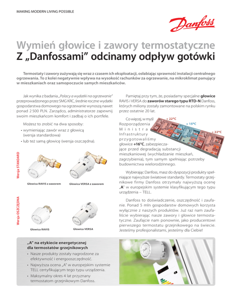 MAKING MODERN LIVING POSSIBLE Wymień głowice i zawory termostatyczne Z „Danfossami” odcinamy odpływ gotówki Termostaty i zawory zużywają się wraz z czasem ich eksploatacji, osłabiając sprawność instalacji centralnego ogrzewania. To z kolei negatywnie wpływa na wysokość rachunków za ogrzewanie, na mikroklimat panujący w mieszkaniach oraz samopoczucie samych mieszkańców. Jak wynika z badania „Polacy a wydatki na ogrzewanie” przeprowadzonego przez SMG KRC, średnie roczne wydatki gospodarstwa domowego na ogrzewanie wynoszą nawet ponad 2 500 PLN. Zarządco, administratorze zapewnij swoim mieszkańcom komfort i zadbaj o ich portfele. Możesz to zrobić na dwa sposoby: •wymieniając zawór wraz z głowicą (wersja standardowa) Wersja standard •lub też samą głowicę (wersja oszczędna). Głowica VERSA z zaworem Wersja Oszczędna Głowica RAVIS z zaworem Głowica RAVIS Głowica VERSA „A” na etykiecie energetycznej dla termostatów grzejnikowych • Nasze produkty zostały nagrodzone za efektywność i energooszczędność. • Najwyższa ocena „A” w europejskim systemie TELL certyfikującym tego typu urządzenia. • Maksymalny okres 4 lat przyznany termostatom grzejnikowym Danfoss. Pamiętaj przy tym, że, posiadamy specjalne głowice RAVIS i VERSA do zaworów starego typu RTD-N Danfoss, których miliony zostały zamontowane na polskim rynku przez ostatnie 20 lat. Co więcej, w myśl Rozporządzenia M i n i s t r a Inf ras truk tur y p r z y g o to w a l iś my głowice +16°C, zabezpieczające przed degradacją substancji mieszkaniowej (wychładzanie mieszkań, zagrzybienia), tym samym spełniając potrzeby budownictwa wielorodzinnego. Wybierając Danfoss, masz do dyspozycji produkty spełniające najwyższe światowe standardy. Termostaty grzejnikowe firmy Danfoss otrzymały najwyższą ocenę „A” w europejskim systemie klasyfikującym tego typu urządzenia – TELL. Danfoss to doświadczenie, oszczędność i zaufanie. Ponad 5 mln gospodarstw domowych korzysta wyłącznie z naszych produktów. Już raz nam zaufaliście wybierając nasze zawory i głowice termostatyczne. Zaufajcie nam ponownie, jako producentowi pierwszego termostatu grzejnikowego na świecie. Jesteśmy profesjonalistami, jesteśmy dla Ciebie! Jak dodatkowo możesz oszczędzać? Zawory podpionowe dla instalacji c.o. Zawory do instalacji cyrkulacji cwu Kolejnych oszczędności (8-10%) oraz poprawy pracy instalacji c.o. zapewniamy przy pomocy zaworów podpionowych ASV. Podczas pracy instalacji c.o., powstają wahania ciśnienia u podstawy pionu, które są efektem pracy zaworów termostatycznych. Powodują one zmianę ilości wody płynącej do różnych gałęzi instalacji. Zmienność przepływów objawia się występowaniem nadmiaru lub niedoborem ilości przepływającej wody w różnych częściach instalacji, co w konsekwencji powoduje szumy – zastosowanie zaworów ASV całkowicie likwiduje to zjawisko i dodatkowo zapewnia właściwy rozdział wody w instalacji dzięki czemu każde z ogrzewanych pomieszczeń jest optymalnie dogrzane a zużycie energii ograniczone do niezbędnego minimum. Inną formą oszczędności są sytuacje, w trakcie zwykłej eksploatacji, podczas której musimy wykonać prace na instalacji. Zawór podpionowy to brak potrzeby zrzucania wody z budynku. Zastosowanie zaworów ASV (ASV-M na zasilaniu, ASV-PV na powrocie) potrafi zwrócić się w ciągu 2 lat. Naszą propozycję ograniczenia kosztów eksploatacyjnych instalacji w budynkach wielorodzinnych uzupełnia kolejne autorskie rozwiązanie, którym jest wykonany z brązu zawór MTCV. Poniżej korzyści, jakie wnosi dla instalacji cwu zastosowanie zaworu cyrkulacyjnego Danfoss: • obniżenie kosztów przygotowania cwu rzędu 20% (amortyzacja już w pół roku) • zapewnienie komfortu mieszkańcom („ciepła woda od ręki”) • ochrona przed Legionellą Zamontowany na przewodzie cyrkulacji cwu zapewnia optymalną pracę instalacji dzięki stabilizacji temperatury wody w całym budynku. Gdy dany pion osiągnie temperaturę zadaną, MTCV przymyka przepływ do wartości minimalnej. Dzięki temu uzyskujemy żądaną temperaturę w każdym z punktów poboru wody. Nasi przedstawiciele handlowi w całej Polsce: Marianna Stępień armatura grzejnikowa, zawory równoważące, system c.w.u., elektroniczne regulatory temperatury, wentylatory Menadżer regionu zachodniego 603 880 120 Tomasz Perek 603 880 945 Rafał Groblewski 603 880 136 Marek Kołodziejski 601 294 990 Gerard Cempel 603 880 113 Andrzej Händel Gdańsk Bydgoszcz Gorzów Wkpl. Menadżer regionu centralnego Białystok Poznań Warszawa Menadżer regionu południowego Łódź 603 880 137 Martyna Zasławska 603 880 112 Grzegorz Gładys 601 390 125 Iwona Dobrowolska-Syc 603 880 125 Kazimierz Trojnar 603 880 124 Lublin Wrocław Kielce Opole Katowice Kraków Danfoss Poland Sp. z o.o. ul. Chrzanowska 5 05-825 Grodzisk Mazowiecki Cezary Pytko Olsztyn Szczecin tel. (22) 755 07 00 faks (22) 755 07 01 e-mail: [email protected] www.ogrzewanie.danfoss.pl Rzeszów 603 880 131 Andrzej Siemieniuk 603 880 138 Agata Syropolska 603 880 101 Karina Sznurczak 603 880 155 Przemysław Morawski 603 888 557