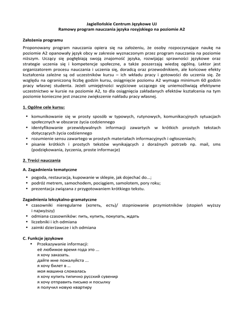Jagiellońskie Centrum Językowe UJ Ramowy program nauczania języka rosyjskiego na poziomie A2 Założenia programu Proponowany program nauczania opiera się na założeniu, że osoby rozpoczynające naukę na poziomie A2 opanowały język obcy w zakresie wyznaczonym przez program nauczania na poziomie niższym. Uczący się pogłębiają swoją znajomość języka, rozwijając sprawności językowe oraz strategie uczenia się i kompetencje społeczne, a także poszerzają wiedzę ogólną. Lektor jest organizatorem procesu nauczania i uczenia się, doradcą oraz przewodnikiem, ale końcowe efekty kształcenia zależne są od uczestników kursu – ich wkładu pracy i gotowości do uczenia się. Ze względu na ograniczoną liczbę godzin kursu, osiągnięcie poziomu A2 wymaga minimum 60 godzin pracy własnej studenta. Jeżeli umiejętności wyjściowe uczącego się uniemożliwiają efektywne uczestnictwo w kursie na poziomie A2, to dla osiągnięcia zakładanych efektów kształcenia na tym poziomie konieczne jest znaczne zwiększenie nakładu pracy własnej. 1. Ogólne cele kursu: • komunikowanie się w prosty sposób w typowych, rutynowych, komunikacyjnych sytuacjach społecznych w obszarze życia codziennego • identyfikowanie przewidywalnych informacji zawartych w krótkich prostych tekstach dotyczących życia codziennego • rozumienie sensu zawartego w prostych materiałach informacyjnych i ogłoszeniach; • pisanie krótkich i prostych tekstów wynikających z doraźnych potrzeb np. mail, sms (podziękowania, życzenia, proste informacje) 2. Treści nauczania A. Zagadnienia tematyczne • pogoda, restauracja, kupowanie w sklepie, jak dojechać do...; • podróż metrem, samochodem, pociągiem, samolotem, pory roku; • prezentacja związana z przygotowaniem krótkiego tekstu. Zagadnienia leksykalno-‐gramatyczne • czasowniki nieregularne (хотеть, есть)/ stopniowanie przymiotników (stopień wyższy i najwyższy) • odmiana czasowników: пить, купить, покупать, ждать • liczebniki i ich odmiana • zaimki dzierżawcze i ich odmiana C. Funkcje językowe • Przekazywanie informacji: eё любимое время года это ... я хочу заказать. дайте мне пожалуйста ... я хочу билет в … моя машина сломалась я хочу купить типично русский сувенир я хочу отправить письмо и посылку я получил новую квартиру в ней находятся я приглашаю тебя посетить мою страну • zdobywanie informacji: что я могу заказать на обед какой сувенир вы мне предлагаете как доехать до слолько стоит где я могу купить путеводитель сколько стоит прокат автомобиля в день как мне попасть на кольцевую линию в котором часу отправляется поезд в Санкт-‐ Петербург какое сегодня число; как туда доехать 3. Przewidywane efekty kształcenia: Słuchanie Po zakończeniu kursu student potrafi: • rozumieć wypowiedzi z zakresu tematyki życia codziennego dotyczącej samego użytkownika języka, jego bliskich, przyjaciół, np. wypoczynek, wyjazd za granicę, zakupy, uroczystości rodzinne, święta, wizyta u lekarzy specjalistów poczta, internet, informacje przekazane przez spikera na dworcu, przez motorniczego w tramwaju (dotyczące np. kasowania biletów), jak również krótkich tekstów mówionych na temat różnych regionów Rosji, czy ochrony środowiska. • rozumieć także teksty pisane: mogą to być drobne ogłoszenia dotyczące ofert pracy, reklamy, krótkie listy, jadłospis, rozkład jazdy pociągów, rejsów samolotów, ceny biletów. • zrozumieć komunikaty dotyczące życia studenckiego, funkcjonowania uczelni polecenia, prośby, odpowiedzi prowadzącego zajęcia jak i swojego rozmówcy Czytanie Po zakończeniu kursu student potrafi: • przeczytać znany mu tekst w miarę płynnie, uwzględniając akcent i wymowę poszczególnych samogłosek i spółgłosek, a nowy tekst po uprzednim wysłuchaniu go dość płynnie • przeczytać i zrozumieć nieskomplikowane polecenia • przeczytać i zrozumieć napisy dotyczące godzin pracy banku, poczty, sklepu • przeczytać i zrozumieć nieskomplikowane informacje i ogłoszenia Pisanie Po zakończeniu kursu student potrafi: • przekazać krótką treść usłyszanego tekstu • wypełnić kartę meldunkową • stosować zwroty używane w korespondencji prywatnej • napisać (ze słownikiem) tekst o sobie, uwzględniając swoje zainteresowania związane z kierunkiem studiów i z uczelnią Mówienie Po zakończeniu kursu student potrafi: • posługiwać się prostymi konstrukcjami zdaniowymi z poszerzonym zasobem leksykalnym na znane mu tematy w różnych sytuacjach • przeprowadzić proste rozmowy telefoniczne, uzyskać potrzebne informacje (np. jak dojechać do określonego celu) • wypowiedzieć się na temat aktywnego wypoczynku, opisać stan emocjonalny człowieka, jego cechy zewnętrzne, opisać swoje warunki życia, formułować swoje potrzeby (np. związane z zakupami, zamawianiem jedzenie w restauracji, wysłać list na poczcie, opowiedzieć krótko o obejrzanej sztuce oraz jak spędza wakacje • prowadzić rozmowy na znane mu tematy używając zdań prostych i podrzędnie złożonych w ograniczonym zakresie