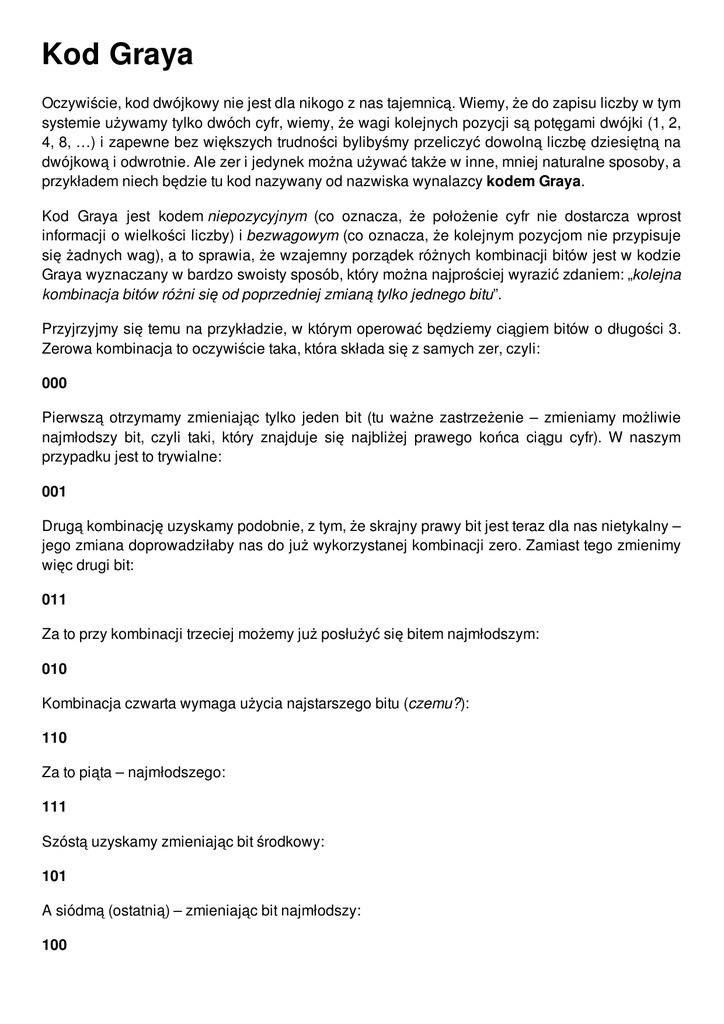 Kod Graya Oczywiście, kod dwójkowy nie jest dla nikogo z nas tajemnicą. Wiemy, że do zapisu liczby w tym systemie używamy tylko dwóch cyfr, wiemy, że wagi kolejnych pozycji są potęgami dwójki (1, 2, 4, 8, …) i zapewne bez większych trudności bylibyśmy przeliczyć dowolną liczbę dziesiętną na dwójkową i odwrotnie. Ale zer i jedynek można używać także w inne, mniej naturalne sposoby, a przykładem niech będzie tu kod nazywany od nazwiska wynalazcy kodem Graya. Kod Graya jest kodem niepozycyjnym (co oznacza, że położenie cyfr nie dostarcza wprost informacji o wielkości liczby) i bezwagowym (co oznacza, że kolejnym pozycjom nie przypisuje się żadnych wag), a to sprawia, że wzajemny porządek różnych kombinacji bitów jest w kodzie Graya wyznaczany w bardzo swoisty sposób, który można najprościej wyrazić zdaniem: „kolejna kombinacja bitów różni się od poprzedniej zmianą tylko jednego bitu”. Przyjrzyjmy się temu na przykładzie, w którym operować będziemy ciągiem bitów o długości 3. Zerowa kombinacja to oczywiście taka, która składa się z samych zer, czyli: 000 Pierwszą otrzymamy zmieniając tylko jeden bit (tu ważne zastrzeżenie – zmieniamy możliwie najmłodszy bit, czyli taki, który znajduje się najbliżej prawego końca ciągu cyfr). W naszym przypadku jest to trywialne: 001 Drugą kombinację uzyskamy podobnie, z tym, że skrajny prawy bit jest teraz dla nas nietykalny – jego zmiana doprowadziłaby nas do już wykorzystanej kombinacji zero. Zamiast tego zmienimy więc drugi bit: 011 Za to przy kombinacji trzeciej możemy już posłużyć się bitem najmłodszym: 010 Kombinacja czwarta wymaga użycia najstarszego bitu (czemu?): 110 Za to piąta – najmłodszego: 111 Szóstą uzyskamy zmieniając bit środkowy: 101 A siódmą (ostatnią) – zmieniając bit najmłodszy: 100 Zauważ, że przejście od kombinacji siódmej do zerowej również spełnia wymaganie zmiany tylko jednego bitu. Istnieje również prostsza (bo bezpośrednia – nieiteracyjna) metoda uzyskania dowolnego elementu kodu Gray, którą opisuje się następująco: jeśli x jest ciągiem bitów reprezentującym na n pozycjach pewną liczbę w naturalnym kodzie dwójkowym, to podziel ją przez dwa, a wynik umieść w y (pamiętamy oczywiście, że dzielenie przez dwa możemy zastąpić przesunięciem liczby o jeden bit w prawo) wykonaj operację XOR na n odpowiadających sobie bitach liczb x i y wynik da ci reprezentację liczby x w kodzie Graya Sprawdźmy to na trzech bitach i dla liczby 5: 510 = 1012 510 / 210 = 0102 1012 xor 0102 = 1112 co daje wynik zgodny z naszymi wcześniejszymi eksperymentami (tu dodajmy jeszcze, że rolę operatora xor pełni w języku C znak ^ (caret)). Polecenie: napisz program, który wczyta ze standardowego wejścia dwie liczby całkowite: n oznaczające liczbę bitów i m, oznaczające pewną liczbę, reprezentowalną na n bitach, a następnie wypisze na standardowe wyjście ciąg n bitów odpowiadający m-tej kombinacji bitów w n-bitowym kodzie Graya Dane wejściowe: dwie liczby całkowite liczba bitów n (n: n >= 1 i n <= 32000) numer poszukiwanej kombinacji bitów w n-bitowym kodzie Graya (m: m >= 0 i m < 232000) Dane wyjściowe: ciąg n bitów składający się na m-tą kombinację bitów w n-bitowym kodzie Graya Przykład: Wejście: 35 Wyjście: 111