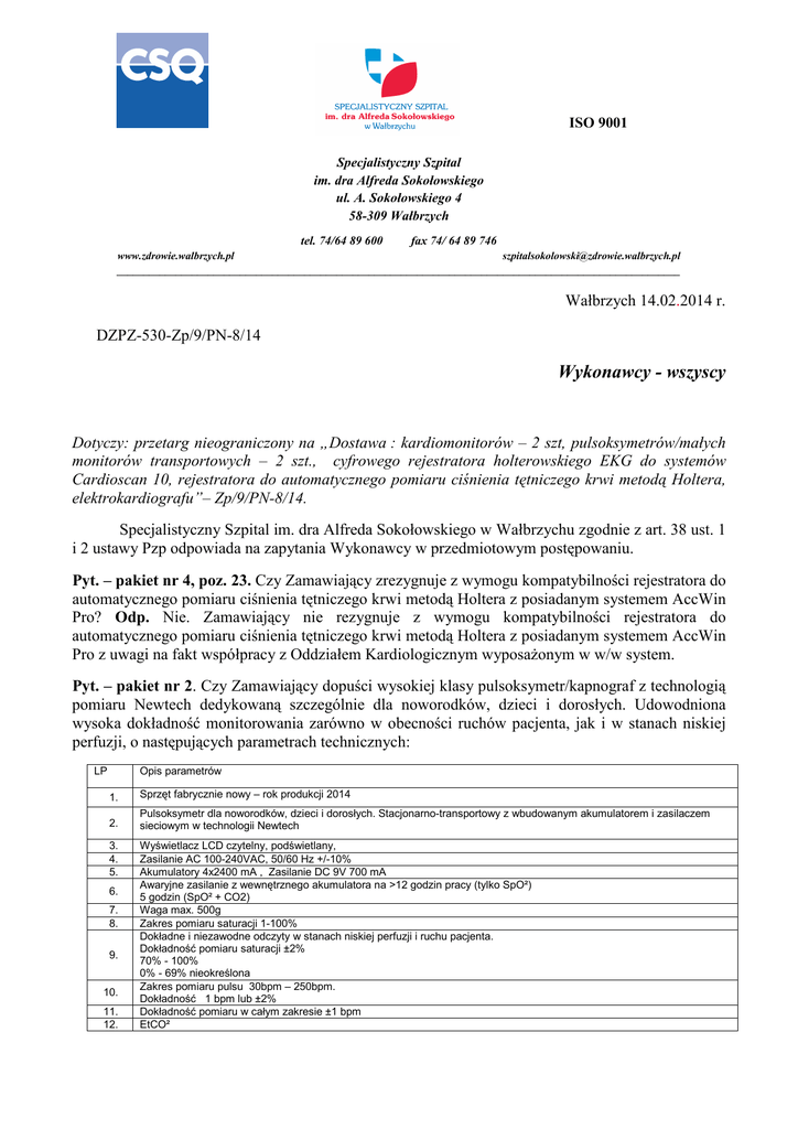 ISO 9001 Specjalistyczny Szpital im. dra Alfreda Sokołowskiego ul. A. Sokołowskiego 4 58-309 Wałbrzych tel. 74/64 89 600 fax 74/ 64 89 746 www.zdrowie.walbrzych.pl [email protected] _________________________________________________________________________________________________________ Wałbrzych 14.02.2014 r. DZPZ-530-Zp/9/PN-8/14 Wykonawcy - wszyscy Dotyczy: przetarg nieograniczony na „Dostawa : kardiomonitorów – 2 szt, pulsoksymetrów/małych monitorów transportowych – 2 szt., cyfrowego rejestratora holterowskiego EKG do systemów Cardioscan 10, rejestratora do automatycznego pomiaru ciśnienia tętniczego krwi metodą Holtera, elektrokardiografu”– Zp/9/PN-8/14. Specjalistyczny Szpital im. dra Alfreda Sokołowskiego w Wałbrzychu zgodnie z art. 38 ust. 1 i 2 ustawy Pzp odpowiada na zapytania Wykonawcy w przedmiotowym postępowaniu. Pyt. – pakiet nr 4, poz. 23. Czy Zamawiający zrezygnuje z wymogu kompatybilności rejestratora do automatycznego pomiaru ciśnienia tętniczego krwi metodą Holtera z posiadanym systemem AccWin Pro? Odp. Nie. Zamawiający nie rezygnuje z wymogu kompatybilności rejestratora do automatycznego pomiaru ciśnienia tętniczego krwi metodą Holtera z posiadanym systemem AccWin Pro z uwagi na fakt współpracy z Oddziałem Kardiologicznym wyposaŜonym w w/w system. Pyt. – pakiet nr 2. Czy Zamawiający dopuści wysokiej klasy pulsoksymetr/kapnograf z technologią pomiaru Newtech dedykowaną szczególnie dla noworodków, dzieci i dorosłych. Udowodniona wysoka dokładność monitorowania zarówno w obecności ruchów pacjenta, jak i w stanach niskiej perfuzji, o następujących parametrach technicznych: LP Opis parametrów 1. Sprzęt fabrycznie nowy – rok produkcji 2014 2. Pulsoksymetr dla noworodków, dzieci i dorosłych. Stacjonarno-transportowy z wbudowanym akumulatorem i zasilaczem sieciowym w technologii Newtech 3. 4. 5. 6. 7. 8. 9. 10. 11. 12. Wyświetlacz LCD czytelny, podświetlany, Zasilanie AC 100-240VAC, 50/60 Hz +/-10% Akumulatory 4x2400 mA , Zasilanie DC 9V 700 mA Awaryjne zasilanie z wewnętrznego akumulatora na >12 godzin pracy (tylko SpO²) 5 godzin (SpO² + CO2) Waga max. 500g Zakres pomiaru saturacji 1-100% Dokładne i niezawodne odczyty w stanach niskiej perfuzji i ruchu pacjenta. Dokładność pomiaru saturacji ±2% 70% - 100% 0% - 69% nieokreślona Zakres pomiaru pulsu 30bpm – 250bpm. Dokładność 1 bpm lub ±2% Dokładność pomiaru w całym zakresie ±1 bpm EtCO² 13. 14. 15. 16. 17. 18. 19. 20. 21. 22. 23. 24. 25. 26. 27. Zakres pomiarowy 0-150mmHg Rozdzielczość: 0,1mmHg (0-69)mmHg 0,25mmHg (70-150)mmHg ±2mmHg (0-40)mmHg ±5% (41-70)mmHg ±8% (71-100)mmHg ±10% (101-150)mmHg Ocena oddechów Zakres pomiarowy 0 – 150bpm, dokładność ±1 bpm Wyświetlenie krzywej pletyzmografu Alarm: Trzy poziomy alarmów wizualnych, dźwiękowych MoŜliwość ustawiania zakresu alarmu i głośności. Przechowywanie danych dla 100 pacjentów; 72-godziny dla kaŜdego pacjenta. Bezprzewodowy przesył danych; pasmo 2,4 GHz USB do PC ≤ 10m bez przeszkód Jeden wielorazowy czujnik dla noworodków/dorosłych do kaŜdego aparatu. Zmienna wysokość tonu saturacji podczas zmian jej wartości pozwalająca na śledzenie zmian SpO2 bez podchodzenia do monitora. Realizowane wielkością tonu pikania. Alarm dźwiękowy i wizualny dla pulsu. Alarm dźwiękowy i wizualny dla saturacji. Alarm dźwiękowy odłączenia czujnika Alarm dźwiękowy wyładowania akumulatora MoŜliwość regulacji głośności alarmu. MoŜliwość regulacji czasu wyciszenia alarmu. Czas uśredniania 2, 4, 8, 10, 12, 14, lub 16 sekund Odp. Zamawiający nie dopuszcza pulsoksymetru o w/w parametrach. Pyt. – pakiet nr 2. Czy Zamawiający dopuści do przetargu pulsoksymetr z 20-godzinną pamięcią trendów realizowaną z 5 minutowym interwałem? Odp. Tak. Pyt. – pakiet nr 2. Czy Zamawiający dopuści do przetargu urządzenie bez systemu SAT Seconds? Odp. Nie. Pyt. – pakiet nr 2. Czy Zamawiający dopuści do przetargu urządzenie prezentujące wyniki w jeden sposób, tzn. w postaci wartości liczbowych z sygnalizacją stanów alarmowych pulsowaniem wartości pomiaru, bez prezentacji krzywej pletyzmograficznej? Odp. Nie. Pyt. – wzór umowy. Czy Zamawiający zgodzi się, aby serwis gwarancyjny odbywał się w siedzibie Wykonawcy (z wysyłką na koszt Wykonawcy)? Odp. Zamawiający dopuszcza, aby serwis gwarancyjny odbywał się w siedzibie Wykonawcy (z wysyłką na koszt Wykonawcy) tylko w przypadku braku moŜliwości wykonania przeglądu w siedzibie Zamawiającego. Pyt. – wzór umowy. Czy Zamawiający dopuści, aby bezpłatny przegląd był wykonany na miesiąc przed zakończeniem gwarancji, bez dodatkowej konieczności wykonywania tego przeglądu równieŜ po zakończeniu okresu gwarancji? Odp. Zamawiający wymaga, aby bezpłatny przegląd został wykonany w ostatnim miesiącu przed zakończeniem gwarancji. W przypadku nie wykonania w tym terminie przeglądu Zamawiający dopuszcza jego wykonanie w okresie jednego miesiąca po zakończeniu gwarancji. Mariola Dudziak Dyrektor Szpitala