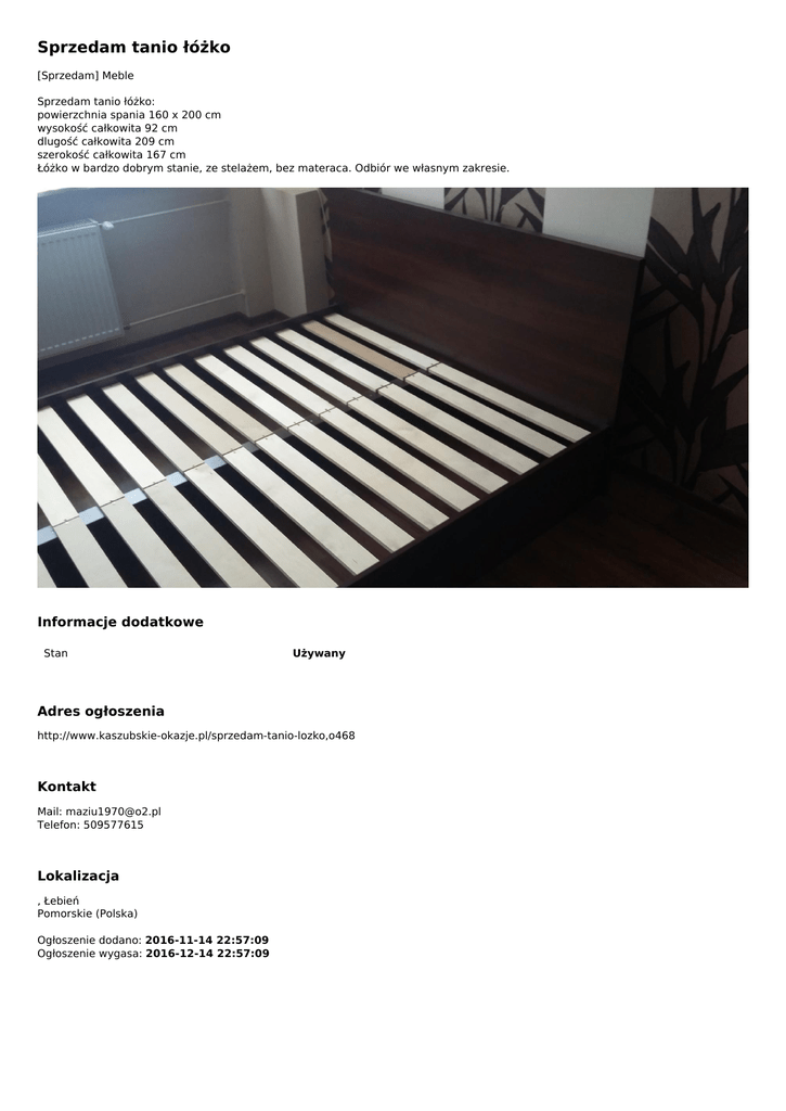 Sprzedam tanio łóżko [Sprzedam] Meble Sprzedam tanio łóżko: powierzchnia spania 160 x 200 cm wysokość całkowita 92 cm dlugość całkowita 209 cm szerokość całkowita 167 cm Łóżko w bardzo dobrym stanie, ze stelażem, bez materaca. Odbiór we własnym zakresie. Informacje dodatkowe Stan Używany Adres ogłoszenia http://www.kaszubskie-okazje.pl/sprzedam-tanio-lozko,o468 Kontakt Mail: [email protected] Telefon: 509577615 Lokalizacja , Łebień Pomorskie (Polska) Ogłoszenie dodano: 2016-11-14 22:57:09 Ogłoszenie wygasa: 2016-12-14 22:57:09 Powered by TCPDF (www.tcpdf.org)