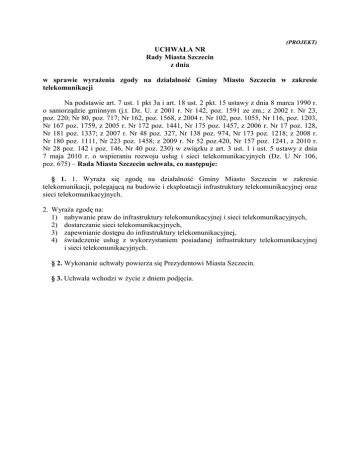(PROJEKT) UCHWAŁA NR Rady Miasta Szczecin z dnia w sprawie wyraŜenia zgody na działalność Gminy Miasto Szczecin w zakresie telekomunikacji Na podstawie art. 7 ust. 1 pkt 3a i art. 18 ust. 2 pkt. 15 ustawy z dnia 8 marca 1990 r. o samorządzie gminnym (j.t. Dz. U. z 2001 r. Nr 142, poz. 1591 ze zm.; z 2002 r. Nr 23, poz. 220; Nr 80, poz. 717; Nr 162, poz. 1568, z 2004 r. Nr 102, poz. 1055, Nr 116, poz. 1203, Nr 167 poz. 1759, z 2005 r. Nr 172 poz. 1441, Nr 175 poz. 1457, z 2006 r. Nr 17 poz. 128, Nr 181 poz. 1337; z 2007 r. Nr 48 poz. 327, Nr 138 poz. 974, Nr 173 poz. 1218; z 2008 r. Nr 180 poz. 1111, Nr 223 poz. 1458; z 2009 r. Nr 52 poz.420, Nr 157 poz. 1241, z 2010 r. Nr 28 poz. 142 i poz. 146, Nr 40 poz. 230) w związku z art. 3 ust. 1 i ust. 5 ustawy z dnia 7 maja 2010 r. o wspieraniu rozwoju usług i sieci telekomunikacyjnych (Dz. U Nr 106, poz. 675) – Rada Miasta Szczecin uchwala, co następuje: § 1. 1. WyraŜa się zgodę na działalność Gminy Miasto Szczecin w zakresie telekomunikacji, polegającą na budowie i eksploatacji infrastruktury telekomunikacyjnej oraz sieci telekomunikacyjnych. 2. WyraŜa zgodę na: 1) nabywanie praw do infrastruktury telekomunikacyjnej i sieci telekomunikacyjnych, 2) dostarczanie sieci telekomunikacyjnych, 3) zapewnianie dostępu do infrastruktury telekomunikacyjnej, 4) świadczenie usług z wykorzystaniem posiadanej infrastruktury telekomunikacyjnej i sieci telekomunikacyjnych. § 2. Wykonanie uchwały powierza się Prezydentowi Miasta Szczecin. § 3. Uchwała wchodzi w Ŝycie z dniem podjęcia. UZASADNIENIE wniosku w sprawie wyraŜenia zgody na prowadzenie działalności telekomunikacyjnej przez Gminę Miasto Szczecin: 1. Ustawa z dnia 7 maja 2010 r. (Dz. U Nr 106, poz. 675) o wspieraniu rozwoju usług i sieci telekomunikacyjnych - art. 3 ust.1 i ust. 5 ; nakłada obowiązek podjęcia uchwały przez Radę Miasta o prowadzeniu działalności telekomunikacyjnej przez Gminę Miasto Szczecin. Gmina Miasto Szczecin eksploatuje sieci telekomunikacyjne (bezprzewodowe i przewodowe ~60 km długości łącznej wraz z kanalizacją), prowadzi rozbudowę sieci dla własnych potrzeb we współpracy z innymi organizacjami (Policja, StraŜ PoŜarna i inne) – połączonych jest ok. 35 lokalizacji. 2. Gmina Miasto Szczecin prowadzi działalność telekomunikacyjną w rozumieniu ww. ustawy, co skutkuje koniecznością podjęcia stosownej uchwały Rady Miasta. 3. Uchwała nie powoduje skutków finansowych.