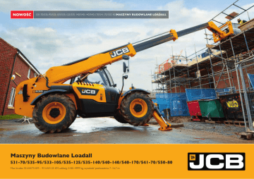 NOWOŚĆ 531-70/535-95/533-105/535-125/535-140/540-140/540-170/541-70/550-80 |MASZYNY BUDOWLANE LOADALL Maszyny Budowlane Loadall 531-70/535-95/533-105/535-125/535-140/540-140/540-170/541-70/550-80 Moc brutto: 55 kW/75 KM – 93 kW/125 KM, udźwig: 3100–4999 kg, wysokość podnoszenia: 7–16,7 m Dlaczego warto wybrać nową maszynę JCB Loadall... NOWOŚĆ PRZYRZĄDY Z EKRANEM TFT O WYSOKIEJ ROZDZIELCZOŚCI NOWOŚĆ NOWOŚĆ NOWOŚĆ DO 15% WYŻSZY MOMENT OBROTOWY† WENTYLATOR Z 7 PRĘDKOŚCIAMI PRACY SILNIK JCB ECOMAX T4i/IIIB – FILTR DPF NIE JEST KONIECZNY NOWOŚĆ NOWOŚĆ NOWOŚĆ NOWOŚĆ POPRAWIONY, ODDOLNY WYDMUCH POWIETRZA OSZCZĘDNOŚĆ PALIWA NAWET O 7% NIEZWYKLE WYDAJNY WENTYLATOR CHŁODZĄCY O ZMIENNEJ PRĘDKOŚCI† NISKOPROFILOWA MASKA SILNIKA NOWOŚĆ WYDAJNE HAMULCE ZAPEWNIAJĄCE 2% OSZCZĘDNOŚCI PALIWA† NOWOŚĆ MOŻLIWOŚĆ ZASTOSOWANIA SILNIKA 55 kW† † W zależności od modelu NAJWYŻSZA WYDAJNOŚĆ, DOSKONAŁA PRODUKTYWNOŚĆ NOWA SERIA MASZYN BUDOWLANYCH LODALL ZOSTAŁA ZAPROJEKTOWANA POD KĄTEM OPTYMALNEGO GOSPODAROWANIA CZASEM I PIENIĘDZMI. DZIĘKI TEMU ZAPEWNIA WYJĄTKOWĄ WYDAJNOŚĆ, WSZECHSTRONNE MOŻLIWOŚCI, WIDOCZNOŚĆ, CZASY CYKLI ROBOCZYCH ORAZ ERGONOMIĘ. NAJLEPSZA W KLASIE PRODUKTYWNOŚĆ JEST NATURALNYM NASTĘPSTWEM TYCH CECH. Nowy, wydajny silnik EcoMAX T4i firmy JCB zapewnia odpowiednie parametry mocy i momentu obrotowego nawet przy niskich obrotach. Duży wybór modeli serii Loadall umożliwia dobranie maszyny doskonale dostosowanej do potrzeb. 3 Produktywna maszyna 3 1 Maszyna budowlana JCB Loadall jest niezwykle zwrotna, dzięki czemu łatwo nią manewrować na niewielkiej przestrzeni. Niewielki rozstaw osi i duże kąty blokady sterowania umożliwiają skrócenie czasu manewrowania w miejscu pracy. 2 Maszyny Loadall mają napęd na 4 koła, zapewniający doskonałą przyczepność i wydajność na miękkim i błotnistym podłożu (istnieje też możliwość przełączenia na napęd na 2 koła podczas jazdy drogowej, co pozwala zminimalizować zużycie opon i paliwa). Opcjonalnie dostępny jest także układ różnicowego ograniczania poślizgu na osi przedniej. Wydajny system podnoszenia i hydrauliki 3 Opcjonalny system Smoothride (SRS)* firmy JCB chroni przed wstrząsami generowanymi przez wysięgnik, zapewniając lepsze podtrzymywanie ładunku i większy komfort (a pośrednio wydajność) pracy operatora podczas jazdy z dużą prędkością po drogach lub nierównym podłożu. Większa oszczędność paliwa w silniku EcoMAX T4i firmy JCB wyposażonym w turbosprężarkę o zmiennej geometrii, zapewniającą najwyższą wydajność przy niskich obrotach*. 4 System szybkozłączy JCB ułatwia i przyspiesza wymianę akcesoriów. 5 Niezwykle wydajne podnoszenie, rozkładanie i spychanie w maksymalnie skróconych cyklach roboczych dzięki układowi hydraulicznemu, który ma najlepsze parametry w swojej klasie. Nasze maszyny z 3- i 4-częściowym wysięgnikiem wyposażamy w stabilizatory zapewniające większą stabilność oraz lepsze parametry podnoszenia (nie dotyczy modelu 535-95). 1 *W zależności od modelu 4 Maszyny budowlane Loadall 531-70/535-95/533-105/535-125/535-140/540-140/540-170/541-70/550-80 2 NAJWYŻSZA WYDAJNOŚĆ, DOSKONAŁA PRODUKTYWNOŚĆ Wydajny układ sterowania 6 W maszynach budowlanych Loadall dostępne są trzy tryby sterowania. Tryb 2 kół skrętnych nadaje się doskonale do jazdy z dużą prędkością po drogach. Tryb 4 kół skrętnych sprawdza się najlepiej w ograniczonych przestrzeniach. Natomiast tryb kraba jest odpowiedni podczas manewrów przy ścianach i budynkach. Opcjonalny wentylator wsteczny może być używany do usuwania kurzu i pozostałości z układu chłodzenia, co zapewnia stałą wydajność maszyny. 7 Możliwość obsługi układu napędowego* za pomocą pedału hamulca zapewnia wielofunkcyjność i wyższą moc podczas załadunku lub przenoszenia obciążenia. Natomiast dzięki układowi wspomagania wszystkich kół hamowanie przebiega płynnie i jest precyzyjne. 4 8 Wszystkie modele JCB Loadall są wyposażone w pomocnicze złącze wysięgnika, które umożliwia dołączenie różnego rodzaju osprzęt, co zwiększa wszechstronność maszyny. *W zależności od modelu 5 6 7 8 Maszyny budowlane Loadall 531-70/535-95/533-105/535-125/535-140/540-140/540-170/541-70/550-80 5 TRAFNA INWESTYCJA MASZYNY BUDOWLANE LOADALL FIRMY JCB SĄ NIE TYLKO WYDAJNE – ZAPEWNIAJĄ TEŻ NISKIE OGÓLNE KOSZTY EKSPLOATACJI. ZAPROJEKTOWALIŚMY JE TAK, ABY ZMAKSYMALIZOWAĆ ZWROT Z INWESTYCJI – NASZE MASZYNY GWARANTUJĄ WYJĄTKOWĄ OSZCZĘDNOŚĆ PALIWA, BEZKONKURENCYJNIE WYSOKĄ WARTOŚĆ W PRZYPADKU ODSPRZEDAŻY I NISKIE KOSZTY UTRZYMANIA. Wydajne silniki EcoMAX 1 Silniki EcoMAX o mocy 81 kW i 93 kW EcoMAX są wyposażone w wentylator chłodzący o zmiennej prędkości, który automatycznie reaguje na zmianę temperatury otoczenia, zapewniając maksymalne oszczędności oraz minimalny hałas. Silnik EcoMAX jest w stanie wygenerować wysokie parametry mocy i momentu obrotowego nawet przy niskich obrotach, rzędu 1300–1400 obr/min, co zapewnia paliwooszczędną współpracę układów napędowego i hydraulicznego. Nowy silnik 55 kW o wysokim momencie obrotowym zapewnia produktywność i maksymalną wydajność. 2 Ze względu na brak systemu oczyszczania gazów spalinowych silniki EcoMAX nie wymagają stosowania kosztownych olejów smarowych o dużej odporności na temperaturę lub płynów AdBlue, dzięki czemu można zaoszczędzić na kosztach serwisowania. Opracowane w oparciu o zasady efektywnego projektowania maszyny Loadall T4i zużywają nawet o 7% mniej paliwa niż modele serii Tier 3. 1 Silniki EcoMAX można dostosować do pracy na paliwach o mniejszej liczbie oktanowej, co ułatwia późniejszą odsprzedaż maszyn serii Loadall, gdyż mogą być eksploatowane na innych obszarach. Poziom oleju przekładniowego skrzyni biegów Powershift został zmniejszony o 1% w celu zapewnienia większej wydajności