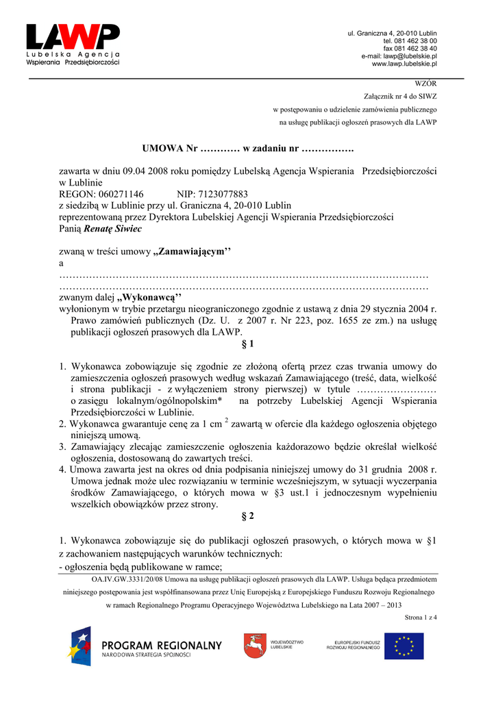 ul. Graniczna 4, 20-010 Lublin tel. 081 462 38 00 fax 081 462 38 40 e-mail: [email protected] www.lawp.lubelskie.pl WZÓR Załącznik nr 4 do SIWZ w postępowaniu o udzielenie zamówienia publicznego na usługę publikacji ogłoszeń prasowych dla LAWP UMOWA Nr ………… w zadaniu nr ……………. zawarta w dniu 09.04 2008 roku pomiędzy Lubelską Agencja Wspierania Przedsiębiorczości w Lublinie REGON: 060271146 NIP: 7123077883 z siedzibą w Lublinie przy ul. Graniczna 4, 20-010 Lublin reprezentowaną przez Dyrektora Lubelskiej Agencji Wspierania Przedsiębiorczości Panią Renatę Siwiec zwaną w treści umowy ,,Zamawiającym’’ a ………………………………………………………………………………………………… ………………………………………………………………………………………………… zwanym dalej ,,Wykonawcą’’ wyłonionym w trybie przetargu nieograniczonego zgodnie z ustawą z dnia 29 stycznia 2004 r. Prawo zamówień publicznych (Dz. U. z 2007 r. Nr 223, poz. 1655 ze zm.) na usługę publikacji ogłoszeń prasowych dla LAWP. §1 1. Wykonawca zobowiązuje się zgodnie ze złoŜoną ofertą przez czas trwania umowy do zamieszczenia ogłoszeń prasowych według wskazań Zamawiającego (treść, data, wielkość i strona publikacji - z wyłączeniem strony pierwszej) w tytule …………………… o zasięgu lokalnym/ogólnopolskim* na potrzeby Lubelskiej Agencji Wspierania Przedsiębiorczości w Lublinie. 2. Wykonawca gwarantuje cenę za 1 cm 2 zawartą w ofercie dla kaŜdego ogłoszenia objętego niniejszą umową. 3. Zamawiający zlecając zamieszczenie ogłoszenia kaŜdorazowo będzie określał wielkość ogłoszenia, dostosowaną do zawartych treści. 4. Umowa zawarta jest na okres od dnia podpisania niniejszej umowy do 31 grudnia 2008 r. Umowa jednak moŜe ulec rozwiązaniu w terminie wcześniejszym, w sytuacji wyczerpania środków Zamawiającego, o których mowa w §3 ust.1 i jednoczesnym wypełnieniu wszelkich obowiązków przez strony. §2 1. Wykonawca zobowiązuje się do publikacji ogłoszeń prasowych, o których mowa w §1 z zachowaniem następujących warunków technicznych: - ogłoszenia będą publikowane w ramce; OA.IV.GW.3331/20/08 Umowa na usługę publikacji ogłoszeń prasowych dla LAWP. Usługa będąca przedmiotem niniejszego postępowania jest współfinansowana przez Unię Europejską z Europejskiego Funduszu Rozwoju Regionalnego w ramach Regionalnego Programu Operacyjnego Województwa Lubelskiego na Lata 2007 – 2013 Strona 1 z 4 ul. Graniczna 4, 20-010 Lublin tel. 081 462 38 00 fax 081 462 38 40 e-mail: [email protected] www.lawp.lubelskie.pl - ogłoszenia będą publikowane w kolorach określonych przez Zamawiającego; - druk tekstu będzie wytłuszczony w miejscach wskazanych przez Zamawiającego; - wszystkie ogłoszenia muszą być minimalizowane tak, aby jego tekst był przejrzysty i czytelny; - ogłoszenia będą zawierać obowiązujące logotypy zgodnie ze wskazaniem Zamawiającego, a Wykonawca zastosuje logotypy według wzorów i kolorów, które znajdują się na: • Znak graficzny Narodowej Strategii Spójności (dla Programu Regionalnego) Szczegółowe wymagania odnośnie znaku graficznego Narodowej Strategii Spójności (Programu Regionalnego) www.funduszestrukturalne.gov.pl; • Symbol Unii Europejskiej – Szczegółowe wymagania odnośnie znaku graficznego Symbolu Unii Europejskiej http://europa.eu.int/abc/symbols/emblem/graphics1_pl.htm; • Herb Województwa Lubelskiego - Szczegółowe wymagania odnośnie znaku graficznego Herbu Województwa Lubelskiego http://www.lubelskie.pl/um/herb_uchwala.php; • Logo Lubelskiej Agencji Wspierania Przedsiębiorczości w Lublinie dostępne na stronie : www.lawp.lubelskie.pl. 2. Zamawiący kaŜdorazowo będzie przesyłał tekst ogłoszenia oraz wskazywał proponowane miejsce jego zamieszczenia, na co najmniej 7 dni kalendarzowych przed planowaną publikacją. Przekazanie tekstu nastepować będzie drogą: e-mail (z potwierdzeniem otrzymania w ciągu 24 godzin od daty wysłania przez Zamawiającego), faksem (z potwierdzeniem otrzymania w ciągu 24 godzin od daty wysłania przez Zamawiającego), osobiście – forma pisemna + nośnik elektroniczny (z poświadczeniem otrzymania). Wykonawca niezwłocznie przekaŜe drogą elektroniczną Zamawiającemu ostateczną wersję graficzną do zaakceptowania na adres e-mail: [email protected]. Zamawiający niezwłocznie akceptuje przekazaną wersję ogłoszenia i przesyła potwierdzenie na wskazany adres e-mail Wykonawcy……………………….. W razie zaistnienia takiej konieczności Zamawiający nanosi poprawki i zawsze zawiadamia o tym Wykonawcę. Poprawione ogłoszenie Zamawiający przesyła Wykonawcy, a ten nanosi poprawki i ponownie przesyła jako wersję ostateczną do zaakceptowania przez Zamawiającego. Zamawiający wyznacza osoby upowaŜnione do kontaktu w sprawach dotyczących realizacji umowy: - …………………..– Sekretariat - tel……………..; Oddział - tel…………….., - …………………..- Sekretariat - tel……………..; Oddział - tel……………...,. 3. Wykonawca ponosi odpowiedzialność za błędy powstałe w treści ogłoszenia, które są rozbieŜne z teścią ogłoszenia przedstawioną przez Zamawiającego. W sytuacji, OA.IV.GW.3331/20/08 Umowa na usługę publikacji ogłoszeń prasowych dla LAWP. Usługa będąca przedmiotem niniejszego postępowania jest współfinansowana przez Unię Europejską z Europejskiego Funduszu Rozwoju Regionalnego w ramach Regionalnego Programu Operacyjnego Województwa Lubelskiego na Lata 2007 – 2013 Strona 2 z 4 ul. Graniczna 4, 20-010 Lublin tel. 081 462 38 00 fax 081 462 38 40 e-mail: [email protected] www.lawp.lubelskie.pl o której mowa wyŜej Wykonawca na koszt własny dokonywać będzie sprostowań treści zamieszczonych ogłoszeń. Sprostowania są publikowane niezwłocznie po zauwaŜeniu