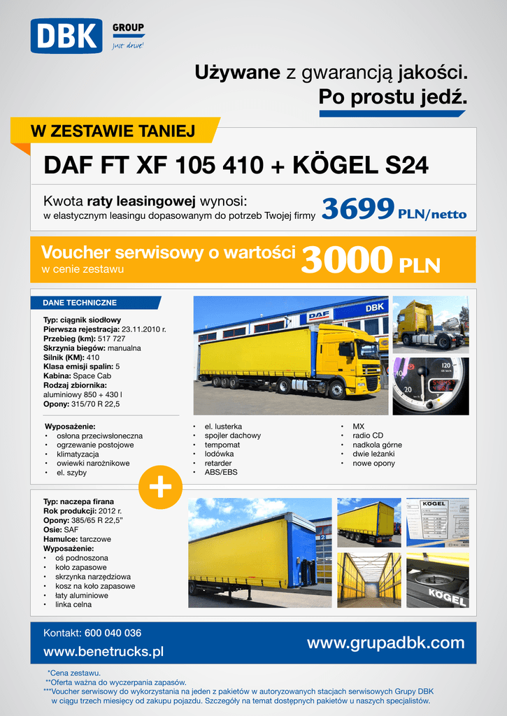 Używane z gwarancją jakości. Po prostu jedź. W ZESTAWIE TANIEJ DAF FT XF 105 410 + KÖGEL S24 Kwota raty leasingowej wynosi: w elastycznym leasingu dopasowanym do potrzeb Twojej firmy Voucher serwisowy o wartości w cenie zestawu 3699 PLN/netto 3000 PLN DANE TECHNICZNE Typ: ciągnik siodłowy Pierwsza rejestracja: 23.11.2010 r. Przebieg (km): 517 727 Skrzynia biegów: manualna Silnik (KM): 410 Klasa emisji spalin: 5 Kabina: Space Cab Rodzaj zbiornika: aluminiowy 850 + 430 l Opony: 315/70 R 22,5 Wyposażenie: • osłona przeciwsłoneczna • ogrzewanie postojowe • klimatyzacja • owiewki narożnikowe • el. szyby Typ: naczepa firana Rok produkcji: 2012 r. Opony: 385/65 R 22,5” Osie: SAF Hamulce: tarczowe Wyposażenie: • oś podnoszona • koło zapasowe • skrzynka narzędziowa • kosz na koło zapasowe • łaty aluminiowe • linka celna Kontakt: 600 040 036 + www.benetrucks.pl • • • • • • el. lusterka spojler dachowy tempomat lodówka retarder ABS/EBS • • • • • MX radio CD nadkola górne dwie leżanki nowe opony www.grupadbk.com *Cena zestawu. **Oferta ważna do wyczerpania zapasów. ***Voucher serwisowy do wykorzystania na jeden z pakietów w autoryzowanych stacjach serwisowych Grupy DBK w ciągu trzech miesięcy od zakupu pojazdu. Szczegóły na temat dostępnych pakietów u naszych specjalistów.