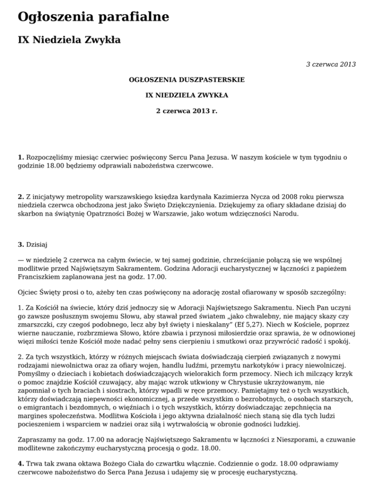 Ogłoszenia parafialne IX Niedziela Zwykła 3 czerwca 2013 OGŁOSZENIA DUSZPASTERSKIE IX NIEDZIELA ZWYKŁA 2 czerwca 2013 r. 1. Rozpoczęliśmy miesiąc czerwiec poświęcony Sercu Pana Jezusa. W naszym kościele w tym tygodniu o godzinie 18.00 będziemy odprawiali nabożeństwa czerwcowe. 2. Z inicjatywy metropolity warszawskiego księdza kardynała Kazimierza Nycza od 2008 roku pierwsza niedziela czerwca obchodzona jest jako Święto Dziękczynienia. Dziękujemy za ofiary składane dzisiaj do skarbon na świątynię Opatrzności Bożej w Warszawie, jako wotum wdzięczności Narodu. 3. Dzisiaj — w niedzielę 2 czerwca na całym świecie, w tej samej godzinie, chrześcijanie połączą się we wspólnej modlitwie przed Najświętszym Sakramentem. Godzina Adoracji eucharystycznej w łączności z papieżem Franciszkiem zaplanowana jest na godz. 17.00. Ojciec Święty prosi o to, ażeby ten czas poświęcony na adorację został ofiarowany w sposób szczególny: 1. Za Kościół na świecie, który dziś jednoczy się w Adoracji Najświętszego Sakramentu. Niech Pan uczyni go zawsze posłusznym swojemu Słowu, aby stawał przed światem „jako chwalebny, nie mający skazy czy zmarszczki, czy czegoś podobnego, lecz aby był święty i nieskalany” (Ef 5,27). Niech w Kościele, poprzez wierne nauczanie, rozbrzmiewa Słowo, które zbawia i przynosi miłosierdzie oraz sprawia, że w odnowionej więzi miłości tenże Kościół może nadać pełny sens cierpieniu i smutkowi oraz przywrócić radość i spokój. 2. Za tych wszystkich, którzy w różnych miejscach świata doświadczają cierpień związanych z nowymi rodzajami niewolnictwa oraz za ofiary wojen, handlu ludźmi, przemytu narkotyków i pracy niewolniczej. Pomyślmy o dzieciach i kobietach doświadczających wielorakich form przemocy. Niech ich milczący krzyk o pomoc znajdzie Kościół czuwający, aby mając wzrok utkwiony w Chrystusie ukrzyżowanym, nie zapomniał o tych braciach i siostrach, którzy wpadli w ręce przemocy. Pamiętajmy też o tych wszystkich, którzy doświadczają niepewności ekonomicznej, a przede wszystkim o bezrobotnych, o osobach starszych, o emigrantach i bezdomnych, o więźniach i o tych wszystkich, którzy doświadczając zepchnięcia na margines społeczeństwa. Modlitwa Kościoła i jego aktywna działalność niech staną się dla tych ludzi pocieszeniem i wsparciem w nadziei oraz siłą i wytrwałością w obronie godności ludzkiej. Zapraszamy na godz. 17.00 na adorację Najświętszego Sakramentu w łączności z Nieszporami, a czuwanie modlitewne zakończymy eucharystyczną procesją o godz. 18.00. 4. Trwa tak zwana oktawa Bożego Ciała do czwartku włącznie. Codziennie o godz. 18.00 odprawiamy czerwcowe nabożeństwo do Serca Pana Jezusa i udajemy się w procesję eucharystyczną. 5. W tym tygodniu również pierwszy czwartek i pierwszy piątek miesiąca. Okazja do spowiedzi świętej pierwszopiątkowej w naszej Kolegiacie od poniedziałku do piątku od godz. 16.00-18.00. 6. W czwartek, 6 czerwca, zakończenie oktawy uroczystości Bożego Ciała. W tym dniu podczas mszy św. nastąpi obrzęd błogosławieństwa wianków. Natomiast po Mszy św. wieczornej w ramach Roku Wiary zapraszamy na adorację Najświętszego Sakramentu, która trwać będzie do godz. 20.00. 7. W piątek w Godzinie Bożego Miłosierdzia na godz. 15.00 zapraszamy do naszego Sanktuarium na adorację Najświętszego Sakramentu i na Koronkę do Bożego Miłosierdzia, a po niej Msza św. Okazja do spowiedzi św. od 14.30 — 15.00. 8. W piątek przypada uroczystość Najświętszego Serca Pana Jezusa. Po Mszy św. o godz. 18.00 z kościoła Najświętszego Serca Pana Jezusa wyruszy procesja eucharystyczna wynagradzająca do kościoła Św. Stanisława Kostki u Ojców Jezuitów. Ze względu na uroczystość, w tym dniu wstrzemięźliwość od potraw mięsnych nie obowiązuje. 9. W sobotę, 8 czerwca, w liturgii będziemy czcili Niepokalane Serce Najświętszej Maryi Panny. Dodatkowa Msza św. ku czci Matki Bożej o godz. 11.00 z uczczeniem relikwii Bł. Matki Teresy z Kalkuty. Na tej Mszy św. za wstawiennictwem bł. Matki Teresy z Kalkuty, orędowniczki w sprawach trudnych w sposób szczególny polecać Bogu będziemy osoby zmagające się z chorobami onkologicznymi. 10. W najbliższą Niedzielę tzw. kolekta inwestycyjna. Ofiary w czasie kolekty składać będziemy na spłacanie oświetlenia kościoła.