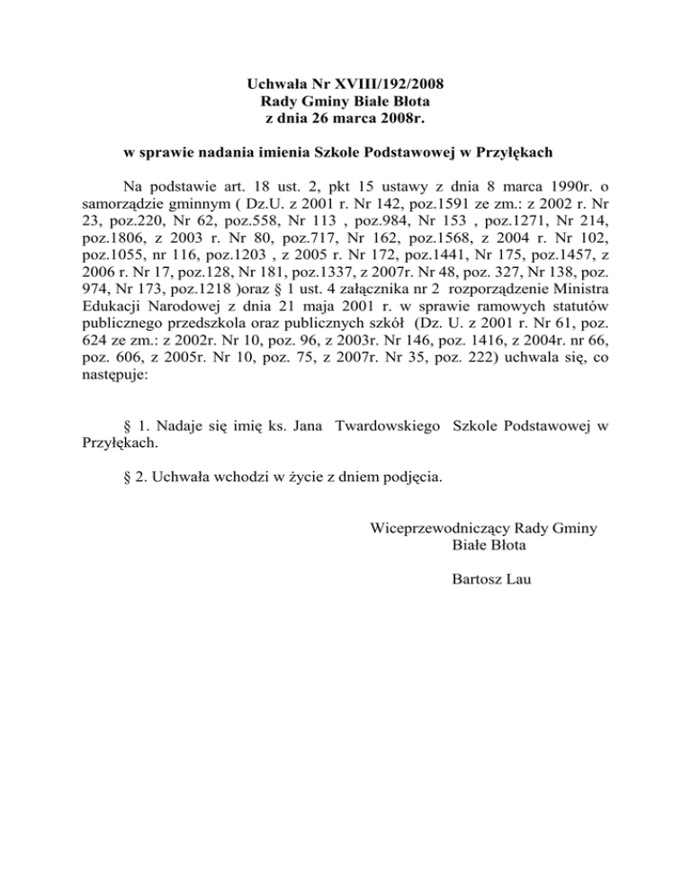 Uchwała Nr XVIII/192/2008 Rady Gminy Białe Błota z dnia 26 marca 2008r. w sprawie nadania imienia Szkole Podstawowej w Przyłękach Na podstawie art. 18 ust. 2, pkt 15 ustawy z dnia 8 marca 1990r. o samorządzie gminnym ( Dz.U. z 2001 r. Nr 142, poz.1591 ze zm.: z 2002 r. Nr 23, poz.220, Nr 62, poz.558, Nr 113 , poz.984, Nr 153 , poz.1271, Nr 214, poz.1806, z 2003 r. Nr 80, poz.717, Nr 162, poz.1568, z 2004 r. Nr 102, poz.1055, nr 116, poz.1203 , z 2005 r. Nr 172, poz.1441, Nr 175, poz.1457, z 2006 r. Nr 17, poz.128, Nr 181, poz.1337, z 2007r. Nr 48, poz. 327, Nr 138, poz. 974, Nr 173, poz.1218 )oraz § 1 ust. 4 załącznika nr 2 rozporządzenie Ministra Edukacji Narodowej z dnia 21 maja 2001 r. w sprawie ramowych statutów publicznego przedszkola oraz publicznych szkół (Dz. U. z 2001 r. Nr 61, poz. 624 ze zm.: z 2002r. Nr 10, poz. 96, z 2003r. Nr 146, poz. 1416, z 2004r. nr 66, poz. 606, z 2005r. Nr 10, poz. 75, z 2007r. Nr 35, poz. 222) uchwala się, co następuje: § 1. Nadaje się imię ks. Jana Twardowskiego Szkole Podstawowej w Przyłękach. § 2. Uchwała wchodzi w Ŝycie z dniem podjęcia. Wiceprzewodniczący Rady Gminy Białe Błota Bartosz Lau Uzasadnienie Zgodnie z §1 ust. 4 załącznika nr 2 rozporządzenia Ministra Edukacji Narodowej z dnia 21 maja 2001 r. w sprawie ramowych statutów publicznego przedszkola oraz publicznych szkół, Rada Pedagogiczna, Samorząd Uczniowski oraz Rada Rodziców Szkoły Podstawowej w Przyłękach zwróciła się z wnioskiem do Rady Gminy o nadanie szkole imienia ks. Jana Twardowskiego. Cała społeczność Szkoły Podstawowej w Przyłękach w wyniku tajnego głosowania dokonała wyboru tego patrona. Po dokonaniu wyboru patrona i publicznym ogłoszeniu wyników, w szkole jest realizowane zadanie „POZNAJMY PATRONA SZKOŁY”. Uczniowie przygotowali port- folia, w których gromadzili informacje o ks. Janie Twardowskim. Został przeprowadzony konkurs gminny dla uczniów kl. IV- VI oraz I gimnazjalnej „Spotkanie z Janem od Biedronki”: - konkurs wiedzy o Ks. Janie Twardowskim - konkurs recytatorski - konkurs plastyczny - konkurs literacki. W w/w konkursach brali udział uczniowie wszystkich szkół z terenu naszej gminy. Odbywały się równieŜ wieczory poetyckie, podczas których państwo radni, rodzice, uczniowie i nauczyciele czytali poezję ks. Jana Twardowskiego. Zorganizowano równieŜ „Zaduszki z ks. Janem Twardowskim”uroczysty montaŜ słowno- muzyczny, który skłaniał do zadumy i refleksji zgromadzonych w Kościele mieszkańców Przyłęk. Planowane jest przeprowadzenie gminnego konkursu poetyckiego: „Spotkanie z ks. Janem Twardowskim” Uczniowie przygotowują drogę krzyŜową na podstawie rozwaŜań ks. Jana Twardowskiego oraz spotkanie wielkopostne dla całego środowiska pt. „KrzyŜ, zbawienie, zmartwychwstanie” z ks. Janem Twardowskim. Planowana jest równieŜ wycieczka do Warszawy do Świątyni Opatrzności BoŜej i Kościoła Wizytek. Uczniowie pragną poznać miejsca, w których Ŝył i pracował ks. Jan Twardowski. Nawiązano równieŜ współpracę z Gimnazjum im. ks. Jana Twardowskiego w Rozogach (woj. warmińsko- mazurskie). W uroczystości nadania imienia tej szkole uczestniczył ks. Jan Twardowski. Przez cały czas w szkole trwa akcja informacyjna. Na korytarzach i w salach lekcyjnych wyeksponowane są gazetki. Ksiądz Twardowski to niezwykle skromny człowiek i wielki poeta. Był pasjonatem i wnikliwym znawcą przyrody. Pisał o niej z pasją właściwą największym entuzjastom. Czytając jego wiersze, odkrywamy bliski związek twórcy z polską wsią, polską przyrodą. Ks. Twardowski starał się opisywać przyrodę z jej cudami i zagadkami. Pochylał się wraz z czytelnikiem nad tajemnicą mrówki i pasikonika. Atutem poezji ks. Twardowskiego jest prostota, bezpośredniość, optymizm, pragnienie dzielenia się „słowem jak chlebem”. Uczniowie szkoły, malowniczo połoŜonej wśród lasów i łąk, mają, podobnie jak ks. Twardowski, bliski kontakt z przyrodą. Podczas swoich wędrówek po ścieŜkach dydaktycznych słuchają odgłosów przyrody, zachwycają się pięknem natury, odnajdują w niej interesujące szczegóły, tak jak to czynił poeta. Na lekcjach odkrywają urodę poezji ks. Jana. Bliska jest im radość i miłość do przyrody płynąca z postawy poety. Nauczyciele odnaleźli w twórczości ks. Jana Twardowskiego swoisty program wychowawczy. Wiceprzewodniczący Rady Gminy Białe Błota Bartosz Lau