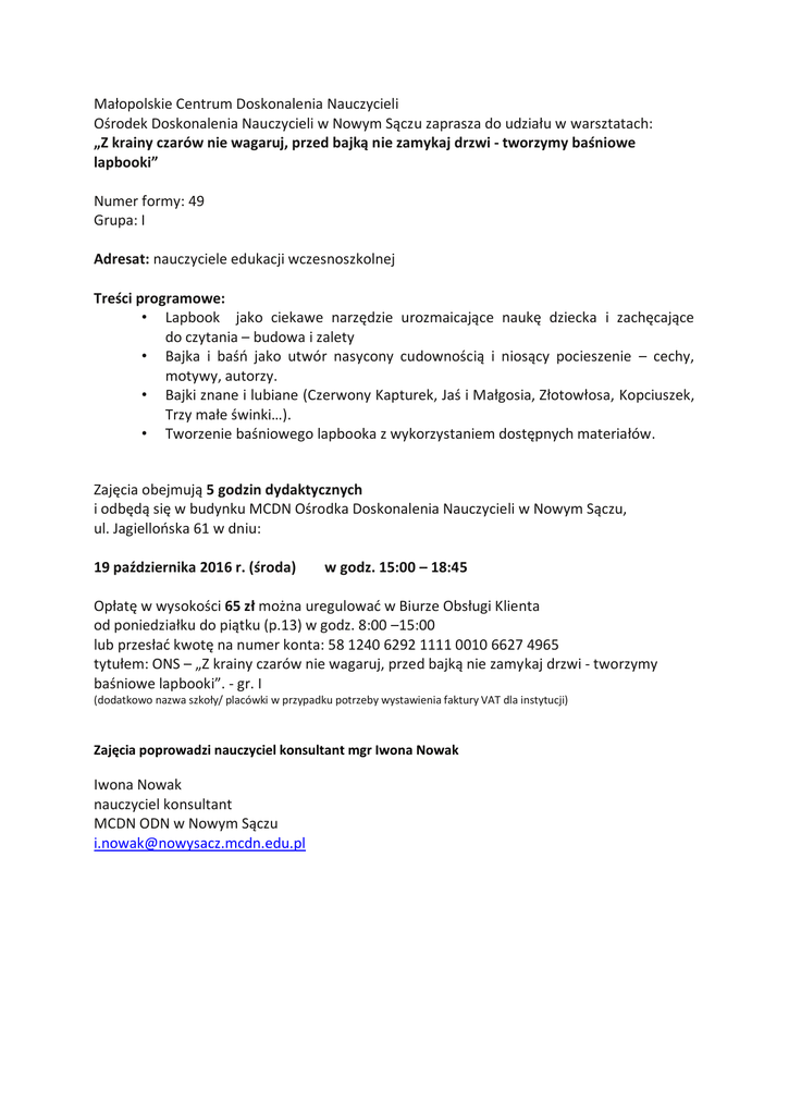 Małopolskie Centrum Doskonalenia Nauczycieli Ośrodek Doskonalenia Nauczycieli w Nowym Sączu zaprasza do udziału w warsztatach: „Z krainy czarów nie wagaruj, przed bajką nie zamykaj drzwi - tworzymy baśniowe lapbooki” Numer formy: 49 Grupa: I Adresat: nauczyciele edukacji wczesnoszkolnej Treści programowe: • Lapbook jako ciekawe narzędzie urozmaicające naukę dziecka i zachęcające do czytania – budowa i zalety • Bajka i baśń jako utwór nasycony cudownością i niosący pocieszenie – cechy, motywy, autorzy. • Bajki znane i lubiane (Czerwony Kapturek, Jaś i Małgosia, Złotowłosa, Kopciuszek, Trzy małe świnki…). • Tworzenie baśniowego lapbooka z wykorzystaniem dostępnych materiałów. Zajęcia obejmują 5 godzin dydaktycznych i odbędą się w budynku MCDN Ośrodka Doskonalenia Nauczycieli w Nowym Sączu, ul. Jagiellońska 61 w dniu: 19 października 2016 r. (środa) w godz. 15:00 – 18:45 Opłatę w wysokości 65 zł można uregulować w Biurze Obsługi Klienta od poniedziałku do piątku (p.13) w godz. 8:00 –15:00 lub przesłać kwotę na numer konta: 58 1240 6292 1111 0010 6627 4965 tytułem: ONS – „Z krainy czarów nie wagaruj, przed bajką nie zamykaj drzwi - tworzymy baśniowe lapbooki”. - gr. I (dodatkowo nazwa szkoły/ placówki w przypadku potrzeby wystawienia faktury VAT dla instytucji) Zajęcia poprowadzi nauczyciel konsultant mgr Iwona Nowak Iwona Nowak nauczyciel konsultant MCDN ODN w Nowym Sączu [email protected]
