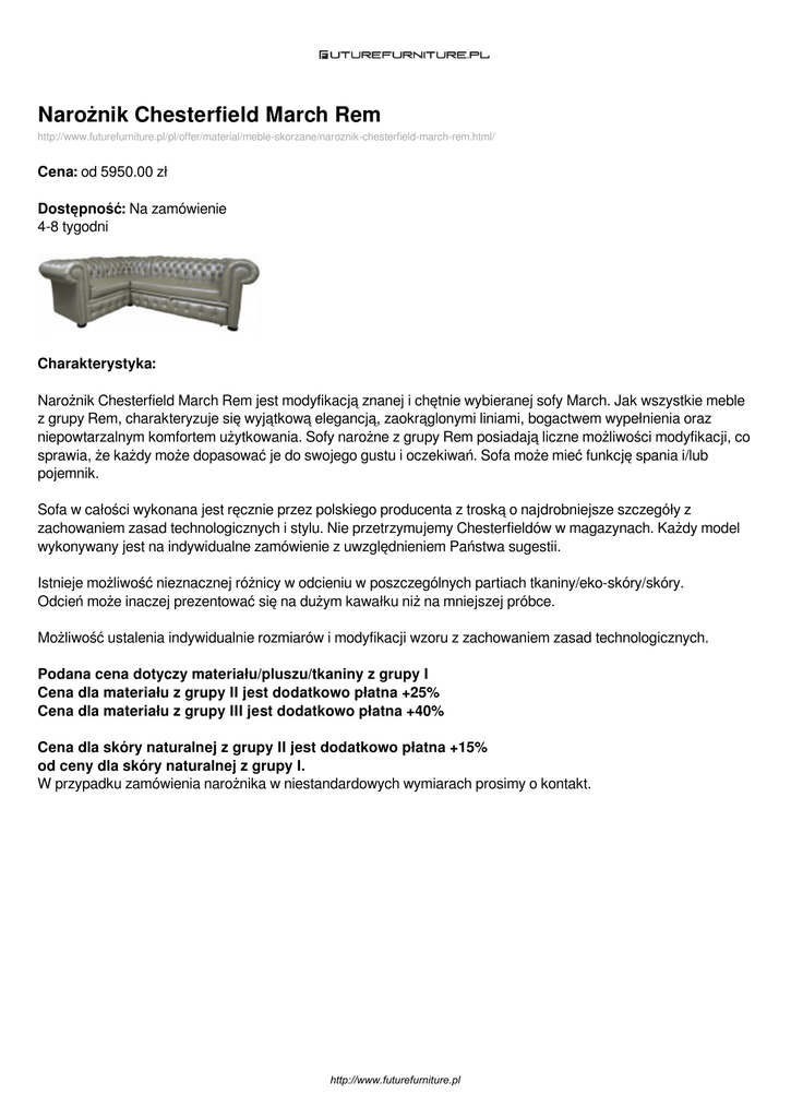 Narożnik Chesterfield March Rem http://www.futurefurniture.pl/pl/offer/material/meble-skorzane/naroznik-chesterfield-march-rem.html/ Cena: od 5950.00 zł Dostępność: Na zamówienie 4-8 tygodni Charakterystyka: Narożnik Chesterfield March Rem jest modyfikacją znanej i chętnie wybieranej sofy March. Jak wszystkie meble z grupy Rem, charakteryzuje się wyjątkową elegancją, zaokrąglonymi liniami, bogactwem wypełnienia oraz niepowtarzalnym komfortem użytkowania. Sofy narożne z grupy Rem posiadają liczne możliwości modyfikacji, co sprawia, że każdy może dopasować je do swojego gustu i oczekiwań. Sofa może mieć funkcję spania i/lub pojemnik. Sofa w całości wykonana jest ręcznie przez polskiego producenta z troską o najdrobniejsze szczegóły z zachowaniem zasad technologicznych i stylu. Nie przetrzymujemy Chesterfieldów w magazynach. Każdy model wykonywany jest na indywidualne zamówienie z uwzględnieniem Państwa sugestii. Istnieje możliwość nieznacznej różnicy w odcieniu w poszczególnych partiach tkaniny/eko-skóry/skóry. Odcień może inaczej prezentować się na dużym kawałku niż na mniejszej próbce. Możliwość ustalenia indywidualnie rozmiarów i modyfikacji wzoru z zachowaniem zasad technologicznych. Podana cena dotyczy materiału/pluszu/tkaniny z grupy I Cena dla materiału z grupy II jest dodatkowo płatna +25% Cena dla materiału z grupy III jest dodatkowo płatna +40% Cena dla skóry naturalnej z grupy II jest dodatkowo płatna +15% od ceny dla skóry naturalnej z grupy I. W przypadku zamówienia narożnika w niestandardowych wymiarach prosimy o kontakt. http://www.futurefurniture.pl Dostępne wersje produktu: nazwa produktu warianty cena Narożnik Chesterfield Tapicerka plusz, 5950.00zł March Rem 160x260 tkanina gr I cm Pojemnik (+300.00 zł) Poduszka ozdobna 40x40 cm (+65.00 zł) Kryształki Swarovskiego (+1500.00 zł) Funkcja spania (+1100.00 zł) Siedzisko: pianka tapicerska + sprężyny bonellowe (+250.00 zł) Siedzisko: pianka tapicerska + wypełnienie silikonowe (+250.00 zł) Narożnik Chesterfield Tapicerka plusz, 6200.00zł March Rem 180x260 tkanina gr I cm Funkcja spania (+1100.00 zł) Siedzisko: pianka tapicerska + wypełnienie silikonowe (+250.00 zł) Pojemnik (+300.00 zł) Siedzisko: pianka tapicerska + sprężyny bonellowe (+250.00 zł) Kryształki Swarovskiego (+1600.00 zł) PROMOCJA Siedzisko: pianka tapicerska + sprężyny bonellowe (+0.00 zł) Poduszka ozdobna 40x40 cm (+65.00 zł) Narożnik Chesterfield Tapicerka plusz, 6450.00zł March Rem 200x260 tkanina gr I cm Pojemnik (+300.00 zł) Poduszka ozdobna 40x40 cm (+65.00 zł) http://www.futurefurniture.pl dostępne 4-8 tygodni 4-8 tygodni 4-8 tygodni nazwa produktu warianty cena Kryształki Swarovskiego (+1700.00 zł) Funkcja spania (+1100.00 zł) Siedzisko: pianka tapicerska + sprężyny bonellowe (+250.00 zł) Siedzisko: pianka tapicerska + wypełnienie silikonowe (+250.00 zł) Narożnik Chesterfield Tapicerka plusz, 7000.00zł March Rem 260x260 tkanina gr I cm Poduszka ozdobna 40x40 cm (+65.00 zł) Kryształki Swarovskiego (+1900.00 zł) Funkcja spania (+1100.00 zł) Siedzisko: pianka tapicerska + sprężyny bonellowe (+250.00 zł) Siedzisko: pianka tapicerska + wypełnienie silikonowe (+250.00 zł) Narożnik Chesterfield Tapicerka skóra 10200.00zł 8750.00zł March Rem 160x260 naturalna grupa I cm Pojemnik (+300.00 zł) Poduszka ozdobna 40x40 cm (+65.00 zł) Kryształki Swarovskiego (+1500.00 zł) Funkcja spania (+1100.00 zł) Siedzisko: pianka tapicerska + sprężyny bonellowe (+250.00 zł) Siedzisko: pianka tapicerska + wypełnienie silikonowe (+250.00 zł) Narożnik Chesterfield Tapicerka skóra 10500.00zł 9150.00zł March Rem 180x260 naturalna grupa I http://www.futurefurniture.pl dostępne 4-8 tygodni 4-8 tygodni 4-8 tygodni nazwa produktu cm warianty cena dostępne Pojemnik (+300.00 zł) Poduszka ozdobna 40x40 cm (+65.00 zł) Kryształki Swarovskiego (+1600.00 zł) Funkcja spania (+1100.00 zł) Siedzisko: pianka tapicerska + sprężyny bonellowe (+250.00 zł) Siedzisko: pianka tapicerska + wypełnienie silikonowe (+250.00 zł) Narożnik Chesterfield Tapicerka skóra 10600.00zł 9500.00zł 4-8 tygodni March Rem 200x260 naturalna grupa I cm Pojemnik (+300.00 zł) Poduszka ozdobna 40x40 cm (+65.00 zł) Kryształki Swarovskiego (+1700.00 zł) Funkcja spania (+1100.00 zł) Siedzisko: pianka tapicerska + sprężyny bonellowe (+250.00 zł) Siedzisko: pianka tapicerska + wypełnienie silikonowe (+250.00 zł) Narożnik Chesterfield Tapicerka skóra 11200.00zł 4-8 tygodni March Rem 260x260 naturalna grupa I 10300.00zł cm Poduszka ozdobna 40x40 cm (+65.00 zł) Kryształki Swarovskiego (+1900.00 zł) Funkcja spania (+1100.00 zł) Siedzisko: pianka tapicerska + sprężyny bonellowe (+250.00 zł) Siedzisko: pianka tapicerska + wypełnienie silikonowe (+250.00 http://www.futurefurniture.pl nazwa produktu warianty zł) cena http://www.futurefurniture.pl dostępne Zdjęcia produktu: http://www.futurefurniture.pl Powered by TCPDF (www.tcpdf.org)
