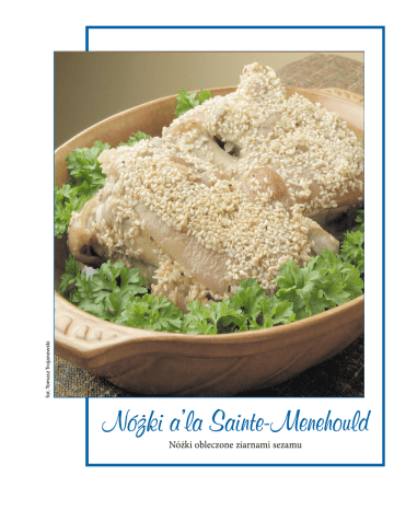 fot. Tomasz Trojanowski Nóżki obleczone ziarnami sezamu Nóżki a la Sainte-Menehould Czas przygotowania: w garnku jest letni, odcedzamy 2,5 godziny nóżki. Składniki dla 4 osób: 3. Obtaczamy je w jaju, następnie 4 nóżki wieprzowe (ok. 1,6 kg) w ziarnach sezamu. Pieczemy na 120 g cebuli patelni lub w piekarniku. 160 g marchewki jajo Gotowej potrawy: 1,6 kg 125 g smalcu 100 g ziarna sezamu Rada: Przyprawy: uwagę, by było na nich dużo mięsa. seler naciowy, gałązka tymianku, rozmarynu, trybuli, pęczek natki pietruszki, 2 liście laurowe, 10 ziarenek pieprzu, sól, pieprz mielony Zawartość w 100 g potrawy: Białko 11,0 g my wzdłuż na połowy, pieprzy- Tłuszcz 14,6 g my, solimy. Węglowodany 1,4 g B:T:W 1:1,3:0,1 kcal 185,1 1. Wyczyszczone nóżki przecina- 2. Wrzucamy do dużego garnka jarzyny, zioła, przyprawy i nóżki. Gotujemy na wolnym ogniu do miękkości. Studzimy. Gdy płyn optymalnik Kupując nóżki, należy zwrócić