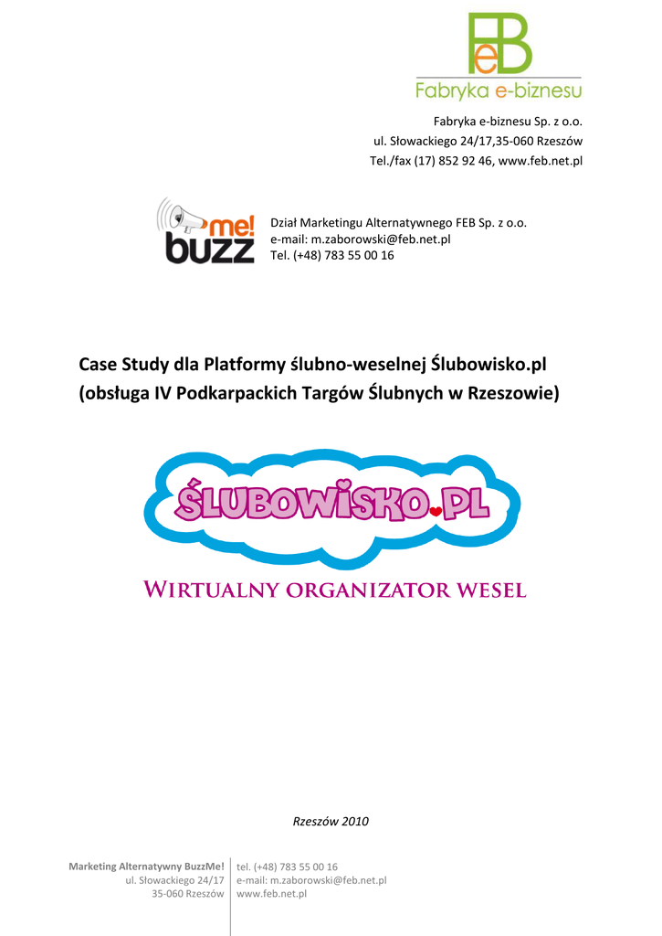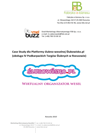 Fabryka e-biznesu Sp. z o.o. ul. Słowackiego 24/17,35-060 Rzeszów Tel./fax (17) 852 92 46, www.feb.net.pl Dział Marketingu Alternatywnego FEB Sp. z o.o. e-mail: [email protected] Tel. (+48) 783 55 00 16 Case Study dla Platformy ślubno-weselnej Ślubowisko.pl (obsługa IV Podkarpackich Targów Ślubnych w Rzeszowie) Rzeszów 2010 Marketing Alternatywny BuzzMe! ul. Słowackiego 24/17 35-060 Rzeszów tel. (+48) 783 55 00 16 e-mail: [email protected] www.feb.net.pl Podsumowanie kampanii: 1. Klient/profil: Platforma ślubno-weselna Ślubowisko.pl (rys. 1), patron medialny IV Podkarpackich Targów Ślubnych w Rzeszowie, Hala „Podpromie” (23-24.01.2010r.). Klient posiada na targach swoje stoisko, ponadto organizuje atrakcyjny konkurs dla Odwiedzających Targi. Rys. 1. Strona główna Platformy Ślubowisko.pl 2. Cel kampanii: Przed rozpoczęciem działao dokładnie przeanalizowano potrzeby Klienta i ustalono z nim zadania do wykonania. Wyznaczono następujące cele do osiągnięcia: Kompleksowa organizacja konkursu: Wymyślenie mechanizmów/idei konkursu, Opracowanie strony www konkursu, materiałów poligraficznych oraz popularyzacja go wśród Odwiedzających, Opracowanie Regulaminu Konkursu (pod nadzorem Prawnika), Pozyskanie Sponsorów nagród na sumę min. 10.000 zł, Nadzór przebiegu konkursu, wyłonienie Zwycięzców i przekazania nagród, przyciągnięcie Odwiedzających do stoiska Klienta, uatrakcyjnienie imprezy, podniesienie jej prestiżu i popularyzacja, promocja marki Klienta (budowanie wizerunku), wzrost odwiedzin i Unikalnych Użytkowników strony www.slubowisko.pl oraz jej zarejestrowanych Użytkowników. Marketing Alternatywny BuzzMe! tel. (+48) 783 55 00 16 ul. Słowackiego 24 lok.16-18 e-mail: [email protected] 35-060 Rzeszów www.feb.net.pl 3. Podjęte działania: W ramach realizacji postawionych celów zrealizowano następujące działania: Wymyślenie mechanizmu/idei konkursu Spośród 5 propozycji wybrano i zrealizowano konkurs polegający na odgadnięciu długości logotypu Klienta (co do mm), znajdującego się na stoisku Klienta. Odwiedzający wpisywali dane na kupony konkursowe, rozdawane przy kasach i wrzucali je do urny na stoisku Klienta. Osoby będące najbliżej wygrywały nagrody. Wyniki opublikowano 2 dni po targach na stronach Klienta (były dostępne po zalogowaniu). Widok logotypu konkursowego przedstawiono na rys. 2. Opracowanie Regulaminu Konkursu (pod nadzorem Prawnika) Chcąc zabezpieczyd Klienta oraz Uczestników opracowano Regulamin Konkursu, który umieszczono na stronie Klienta. Pozyskanie Sponsorów/Fundatorów nagród Etap ten obejmował następujące działania: Przygotowanie oferty współpracy, Przygotowanie bazy potencjalnych Sponsorów/Fundatorów, Selekcja bazy potencjalnych Sponsorów/Fundatorów, Kontakt telefoniczny/mailowy/osobisty z wyselekcjonowanymi Sponsorami/Fundatorami nagród, wysyłka ofert, Przygotowanie Oświadczeo Fundatorów, Potwierdzenie udziału w konkursie organizowanym przez Ślubowisko.pl na IV Podkarpackich Targach Ślubnych, przez Sponsorów/Fundatorów, Kontakt telefoniczny/mailowy/osobisty ze Sponsorami/Fundatorami i odbiór Oświadczeo Fundatora, Ustalenie wysyłki/dostarczenia/odbioru materiałów reklamowych, logotypów oraz nagród, Odbiór materiałów reklamowych, logotypów, nagród Sponsorów/Fundatorów. Na rys. 2 przedstawiono logotypy pozyskanych Sponsorów Rys. 2 Logotypy pozyskanych Sponsorów Marketing Alternatywny BuzzMe! tel. (+48) 783 55 00 16 ul. Słowackiego 24 lok.16-18 e-mail: [email protected] 35-060 Rzeszów www.feb.net.pl Opracowanie atrakcyjnej szaty graficznej konkursu na stronie Platformy Ślubowisko.pl, Opracowanie bannerów internetowych, rollup’ów, mailingów, tekstów na stronę konkursową i targową, Opracowanie szaty graficznej strony IV Podkarpackich Targów Ślubnych w Rzeszowie (zakładka na Platformie Ślubowisko.pl), Opracowanie materiałów poligraficznych promujących Klienta i konkurs (ulotki, kupony konkursowe, inne materiały reklamowe), Organizacja stoiska dla Platformy Ślubowisko.pl na Hali „Podpromie” w Rzeszowie Ustalenie dekoracji, wymyślenie motywu przewodniego dekoracji (rys.3), Przygotowanie sprzętu elektronicznego, Umieszczenie bannerów internetowych i artykułu od Organizatora MTR na stronie Ślubowisko.pl w zakładce targowej, Przygotowanie 3 000 paczek z materiałami reklamowymi Sponsorów/Fundatorów nagród w konkursie (ponad 500 kg ulotek), Kampania „buzz marketingowa” Dystrybucja ekskluzywnych podwójnych zaproszeo na IV Podkarpackie Targi Ślubne w Rzeszowie, Dekoracja stoiska wystawowego dla Ślubowisko.pl, Ustalenie obowiązków hostess oraz fotografów i nadzór Wcześniej pozyskano pięd hostess do kolportażu materiałów reklamowych Sponsorów i Klienta, oraz dwóch fotografów, którzy mieli zająd się profesjonalną sesją dla Platformy Ślubowisko.pl, Rozmieszczenie materiałów reklamowych, sprzętu elektronicznego Klienta na Targach Ślubnych, Koordynacja oraz nadzór nad poprawnością przebiegającego konkursu, kolportażu materiałów reklamowych oraz stoiska Klienta ( 23-24.01.2010r. ), Wyłonienie oraz opublikowanie zwycięzców konkursu na stronie Klienta oraz spisanie maili z kuponów konkursowych, Po weryfikacji danych spośród ponad 5000 kuponów konkursowych wybrano Zwycięzców. Dodatkowo wszystkie maile z kuponów zapisano, sporządzono bazę mailingową i wysłano do niej informacje o rozstrzygnięciu konkursu, Umieszczenie relacji/filmów/artykułów/innych materiałów na stronie targowej, na Platformie Ślubowisko.pl, Dopilnowanie odbioru nagród przez zwycięzców. Marketing Alternatywny BuzzMe! tel. (+48) 783 55 00 16 ul. Słowackiego 24 lok.16-18 e-mail: [email protected] 35-060 Rzeszów www.feb.net.pl Rys.3. Widok stoiska Ślubowisko.pl 4. Efekty kampanii Po zakooczeniu działao przedstawiono Klientowi szczegółowy raport wyników. Do najważniejszych efektów kampanii zaliczyd należy: Pozyskanie nag