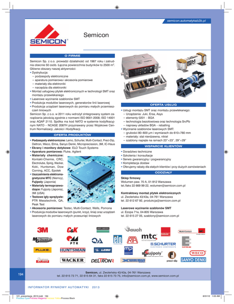 semicon.automatykab2b.pl Semicon O FIRMIE Semicon Sp. z o.o. prowadzi działalność od 1987 roku i zatrudnia obecnie 50 osób. Łączna powierzchnia budynków to 2500 m². Główne obszary naszej aktywności: Dystrybucja: − podzespoły elektroniczne − aparatura pomiarowa i akcesoria pomiarowe − materiały dla elektroniki − narzędzia dla elektroniki Montaż usługowy płytek elektronicznych w technologii SMT oraz montażu przewlekanego Laserowe wycinanie szablonów SMT Produkcja modułów laserowych, generatorów linii laserowej Produkcja urządzeń laserowych do pomiaru małych przemieszczeń liniowych Semicon Sp. z o.o. w 2011 roku wdrożył zintegrowany system zarządzania jakością zgodnie z normami ISO 9001-2008; ISO 14001 oraz AQAP 2110. Spółka ma kod NATO w systemie kodyfikacyjnym NATO – NCAGE 2087H przyznawany przez Wojskowe Centrum Normalizacji, Jakości i Kodyfikacji. OFERTA PRODUKTÓW Podzespoły elektroniczne: Lemo, Schurter, Multi-Contact, Preci-Dip, Deltron, Weco, Elma, Sanyo Denki, Microprecission, 3M, IC-Haus Ekrany i monitory dotykowe: ELO Touch Systems Aparatura pomiarowa: Fluke, Agilent Materiały chemiczne: Kontakt-Chemie, CRC, Electrolube, Spirig, Wacker, Koki, Huntsman, Dow Corning, ACC, Epotek Uszczelnienia elektromagnetyczne MTC (Niemcy), Fujipoly (Japonia) Materiały termoprzewodzące: Fujipoly (Japonia), 3M (USA) Testowe igły sprężyste: PTR Messtechnik, QA, Peak Test Akcesoria pomiarowe: Testec, Multi-Contact, Wells, Pomona Produkcja modułów laserowych (punkt, krzyż, linia) oraz urządzeń laserowych do pomiaru małych przesunięć liniowych 194 OFERTA USŁUG Usługi montażu SMT oraz montażu przewlekanego: − Urządzenia: Juki, Ersa, Asys − elementy 0201 – BGA − technologia bezołowiowa oraz technologia Sn/Pb − naprawy układów BGA – reballing Wycinanie szablonów laserowych SMT: − grubości 80–600 μm i wymiarach do 610×780 mm − materiały: stal nierdzewna, nikiel − szablony napięte na ramach 23”×23”, 29”×29” WSPARCIE KLIENTÓW Doradztwo techniczne Szkolenia i konsultacje Serwis gwarancyjny i pogwarancyjny Kompletacja dostaw Oferujemy rabaty dla stałych klientów i przy dużych zamówieniach ODDZIAŁY Sklep firmowy Wolumen paw. 70 A, 01-912 Warszawa tel./faks 22 669 99 22, [email protected] Kontraktowy montaż płytek elektronicznych ul. Zwoleńska 43/43a, 04-761 Warszawa tel. 22 612 67 92, [email protected] Laserowe wycinanie szablonów SMT ul. Ezopa 71a, 04-805 Warszawa tel. 22 615 27 05, [email protected] Semicon, ul. Zwoleńska 43/43a, 04-761 Warszawa tel. 22 615 73 71, 22 615 64 31, faks 22 615 73 75, [email protected], www.semicon.com.pl I N F O R M AT O R R Y N KO W Y AU T O M AT Y K I 121_prezentacje_2013.indd 194 Process CyanProcess MagentaProcess YellowProcess Black 2013 8/31/12 1:03 AM