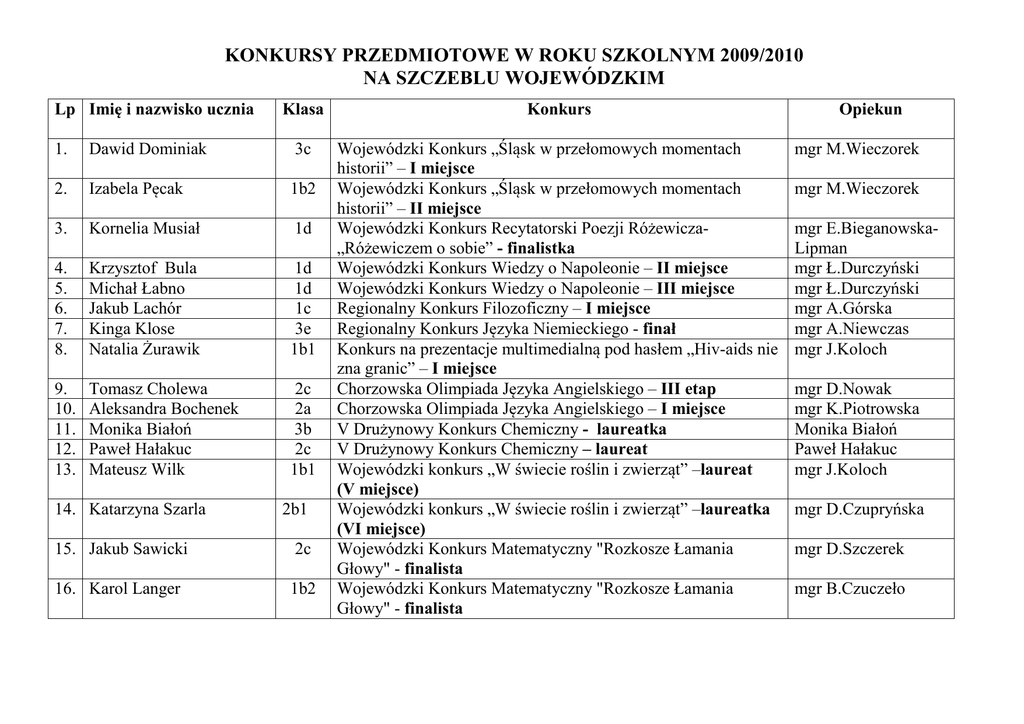KONKURSY PRZEDMIOTOWE W ROKU SZKOLNYM 2009/2010 NA SZCZEBLU WOJEWÓDZKIM Lp Imię i nazwisko ucznia Klasa Konkurs Wojewódzki Konkurs „Śląsk w przełomowych momentach historii” – I miejsce Wojewódzki Konkurs „Śląsk w przełomowych momentach historii” – II miejsce Wojewódzki Konkurs Recytatorski Poezji Różewicza„Różewiczem o sobie” - finalistka Wojewódzki Konkurs Wiedzy o Napoleonie – II miejsce Wojewódzki Konkurs Wiedzy o Napoleonie – III miejsce Regionalny Konkurs Filozoficzny – I miejsce Regionalny Konkurs Języka Niemieckiego - finał Konkurs na prezentacje multimedialną pod hasłem „Hiv-aids nie zna granic” – I miejsce Chorzowska Olimpiada Języka Angielskiego – III etap Chorzowska Olimpiada Języka Angielskiego – I miejsce V Drużynowy Konkurs Chemiczny - laureatka V Drużynowy Konkurs Chemiczny – laureat Wojewódzki konkurs „W świecie roślin i zwierząt” –laureat (V miejsce) Wojewódzki konkurs „W świecie roślin i zwierząt” –laureatka (VI miejsce) Wojewódzki Konkurs Matematyczny "Rozkosze Łamania Głowy" - finalista Wojewódzki Konkurs Matematyczny "Rozkosze Łamania Głowy" - finalista 1. Dawid Dominiak 3c 2. Izabela Pęcak 1b2 3. Kornelia Musiał 1d 4. 5. 6. 7. 8. Krzysztof Bula Michał Łabno Jakub Lachór Kinga Klose Natalia Żurawik 1d 1d 1c 3e 1b1 9. 10. 11. 12. 13. Tomasz Cholewa Aleksandra Bochenek Monika Białoń Paweł Hałakuc Mateusz Wilk 2c 2a 3b 2c 1b1 14. Katarzyna Szarla 2b1 15. Jakub Sawicki 2c 16. Karol Langer 1b2 Opiekun mgr M.Wieczorek mgr M.Wieczorek mgr E.BieganowskaLipman mgr Ł.Durczyński mgr Ł.Durczyński mgr A.Górska mgr A.Niewczas mgr J.Koloch mgr D.Nowak mgr K.Piotrowska Monika Białoń Paweł Hałakuc mgr J.Koloch mgr D.Czupryńska mgr D.Szczerek mgr B.Czuczeło 17. Izabela Pęcak 1b2 18. 19. 20. 21. 2c 2c 2c 2c Jakub Sawicki Wojciech Szczypka Tomasz Kuchna Paweł Hałakuc 22. Jakub Sawicki 2c 23. Wojciech Szczypka 2c 24. Zuzanna Jańczuk 25. Monika Jelonek 26. Barbara Woźniak 1b1 1b1 2b1 27. Małgorzata Krzywicka 1c 28. Piotr Skotnicki 1e 29. Katarzyna Cieplińska 2e 30. Kinga Klose 31. Anna Piątkowska 3e 2a 32. 33. 34. 35. 1e 1e 1e 1e Anna Kaczmarczyk Aleksandra Nożyńska Katarzyna Matyjaszczyk Piotr Skotnicki Wojewódzki Konkurs Matematyczny "Rozkosze Łamania Głowy" - finalista VII Śląski Konkurs Matematyczny - laureat VII Śląski Konkurs Matematyczny - laureat VII Śląski Konkurs Matematyczny - laureat Drużynowy Konkurs Matematyczny „Tour de science” org. przez Uniwersytet Śląski – I miejsce Drużynowy Konkurs Matematyczny „Tour de science” org. przez Uniwersytet Śląski – I miejsce Drużynowy Konkurs Matematyczny „Tour de science” org. przez Uniwersytet Śląski – I miejsce XX Regionalnego Konkursu "Randka z Chemią" – II miejsce XX Regionalnego Konkursu "Randka z Chemią" – laureatka Regionalny Konkurs na pracę literacką „Na skrzydłach wyobraźni” – I miejsce Wojewódzki konkurs „ Mieszkam w województwie śląskim” finalistka Wojewódzki konkurs „ Mieszkam w województwie śląskim” finalista Regionalny konkurs „Rzeźbiarze powierzchni ziemi” finalistka Wojewódzki Konkurs Języka Niemieckiego – IV miejsce Wojewódzki konkurs wiedzy o krajach obszaru języka angielskiego organizowanego przez Uniwersytet Śląski –II miejsce Wojewódzki konkurs „Szukamy bohaterów” -laureatka Wojewódzki konkurs „Szukamy bohaterów” -laureatka Wojewódzki konkurs „Szukamy bohaterów” -laureatka Wojewódzki konkurs „Szukamy bohaterów” -wyróżnienie mgr B.Czuczeło mgr D.Szczerek mgr D.Szczerek mgr D.Szczerek mgr D.Szczerek mgr D.Szczerek mgr D.Szczerek mgr M.Gałkiewicz mgr M.Gałkiewicz mgr A.Górska mgr D.Bruździńska mgr D.Bruździńska mgr D.Bruździńska mgr A.Niewczas mgr M.Osiejuk mgr M.Ziółkowska mgr M.Ziółkowska mgr M.Ziółkowska mgr M.Ziółkowska 36. 37. 38. 39. Tomasz Dąbek Dawid Dominiak Robert Krusiński Marcin Romański 1e 3c 3c 3c Wojewódzki konkurs Wojewódzki konkurs Wojewódzki konkurs Wojewódzki konkurs „Szukamy bohaterów”-wyróżnienie „Szukamy bohaterów” -laureat „Szukamy bohaterów” –laureat „Szukamy bohaterów” -laureat mgr M.Ziółkowska mgr M.Wieczorek mgr M.Wieczorek mgr M.Wieczorek