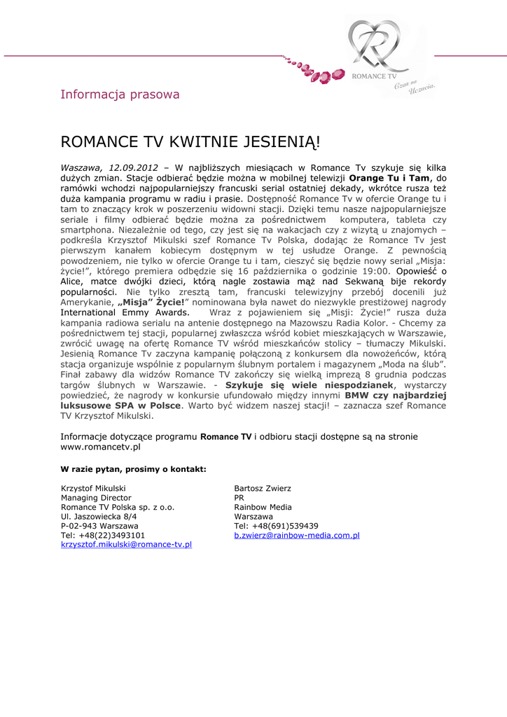 Informacja prasowa ROMANCE TV KWITNIE JESIENIĄ! Waszawa, 12.09.2012 – W najbliższych miesiącach w Romance Tv szykuje się kilka dużych zmian. Stacje odbierać będzie można w mobilnej telewizji Orange Tu i Tam, do ramówki wchodzi najpopularniejszy francuski serial ostatniej dekady, wkrótce rusza też duża kampania programu w radiu i prasie. Dostępność Romance Tv w ofercie Orange tu i tam to znaczący krok w poszerzeniu widowni stacji. Dzięki temu nasze najpopularniejsze seriale i filmy odbierać będzie można za pośrednictwem komputera, tableta czy smartphona. Niezależnie od tego, czy jest się na wakacjach czy z wizytą u znajomych – podkreśla Krzysztof Mikulski szef Romance Tv Polska, dodając że Romance Tv jest pierwszym kanałem kobiecym dostępnym w tej usłudze Orange. Z pewnością powodzeniem, nie tylko w ofercie Orange tu i tam, cieszyć się będzie nowy serial „Misja: życie!”, którego premiera odbędzie się 16 października o godzinie 19:00. Opowieść o Alice, matce dwójki dzieci, którą nagle zostawia mąż nad Sekwaną bije rekordy popularności. Nie tylko zresztą tam, francuski telewizyjny przebój docenili już Amerykanie, „Misja” Życie!” nominowana była nawet do niezwykle prestiżowej nagrody International Emmy Awards. Wraz z pojawieniem się „Misji: Życie!” rusza duża kampania radiowa serialu na antenie dostępnego na Mazowszu Radia Kolor. - Chcemy za pośrednictwem tej stacji, popularnej zwłaszcza wśród kobiet mieszkających w Warszawie, zwrócić uwagę na ofertę Romance TV wśród mieszkańców stolicy – tłumaczy Mikulski. Jesienią Romance Tv zaczyna kampanię połączoną z konkursem dla nowożeńców, którą stacja organizuje wspólnie z popularnym ślubnym portalem i magazynem „Moda na ślub”. Finał zabawy dla widzów Romance TV zakończy się wielką imprezą 8 grudnia podczas targów ślubnych w Warszawie. - Szykuje się wiele niespodzianek, wystarczy powiedzieć, że nagrody w konkursie ufundowało między innymi BMW czy najbardziej luksusowe SPA w Polsce. Warto być widzem naszej stacji! – zaznacza szef Romance TV Krzysztof Mikulski. Informacje dotyczące programu Romance TV i odbioru stacji dostępne są na stronie www.romancetv.pl W razie pytan, prosimy o kontakt: Krzystof Mikulski Managing Director Romance TV Polska sp. z o.o. Ul. Jaszowiecka 8/4 P-02-943 Warszawa Tel: +48(22)3493101 [email protected] Bartosz Zwierz PR Rainbow Media Warszawa Tel: +48(691)539439 [email protected]