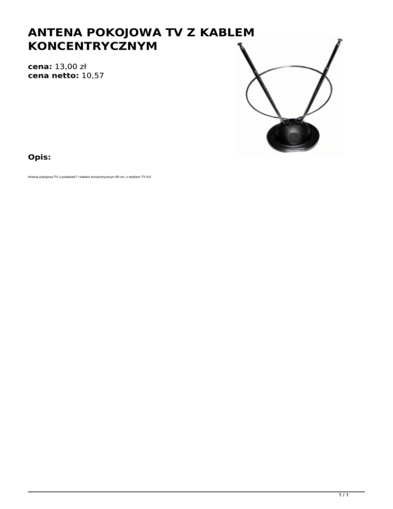 ANTENA POKOJOWA TV Z KABLEM KONCENTRYCZNYM cena: 13,00 zł cena netto: 10,57 Opis: Antena pokojowa TV z podstawk? i kablem koncentrycznym 80 cm, z wtykiem TV 9,5 1/1