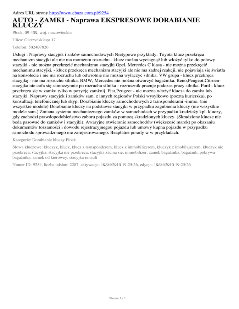 Adres URL strony http://www.ebaza.com.pl/9254 AUTO - ZAMKI - Naprawa EKSPRESOWE DORABIANIE KLUCZY Płock, 09-400, woj. mazowieckie Ulica: Gierzyńskiego 17 Telefon: 502407826 Usługi : Naprawy stacyjek i zaków samochodowych Nietypowe przykłady: Toyota klucz przekręca mechanizm stacyjki ale nie ma momentu rozruchu - klucz można wyciagnąć lub włożyć tylko do połowy stacyjki - nie można przekręcić mechanizmu stacyjki Opel, Mercedes C klasa - nie można przekręcić mechanimu stacyjki, - klucz przekręca mechanizm stacyjki ale nie ma żadnej reakcji, nie pojawiają się światła na konsolecie i nie ma rozruchu lub odwrotnie nie można wyłączyć silnika. VW grupa - klucz przekręca stacyjkę - nie ma rozruchu silnika. BMW, Mercedes nie można otworzyć bagażnika. Reno,Peugeot,Citroenstacyjka nie cofa się samoczynnie po rozruchu silnika - rozrusznik pracuje podczas pracy silnika. Ford - klucz przekręca się w zamku tylko w pozycję zamknij. Fiat,Peugeot - nie można włożyć klucza do zamka lub stacyjki. Naprawy stacyjek i zamków sam. z innych regionów Polski wysyłkowo (poczta kurierska), po konsultacji telefonicznej lub skyp. Dorabianie kluczy samochodowych z transponderami -immo. (nie wszystkie modele) Dorabianie kluczy na podstawie stacyjki w przypadku zagubienia kluczy (nie wszystkie modele sam.) Zmiana systemu mechanicznego zamków w samochodach w przypadku kradzieży kpl. kluczy, gdy zachodzi prawdopodobieństwo zaboru pojazdu za pomocą skradzionych kluczy. (Skradzione klucze nie będą pasować do zamków i stacyjki). Awaryjne otwieranie samochodów (większość marek) po okazaniu dokumentów tożsamości i dowodu rejestracyjnegou pojazdu lub umowy kupna pojazdu w przypadku samochodu sprowadzonego nie zarejestrowanego. Bezpłatne porady w w przykładach. Kategorie: Dorabianie kluczy Płock Słowa kluczowe: kluczyk, klucz, klucz z transponderem, klucz z immobilizerem, kluczyk z imobilajzerem, kluczyk nie przekręca, stacyjka, stacyjka nie przekręca, stacyjka zacina sie, immobilizer, zamek bagażnika, bagażnik, pokrywa bagażnika, zamek od kierowcy, stacyjka renault Numer ID: 9254, liczba odsłon: 2287, aktywacja: 10/04/2010 19:25:26, edycja: 10/04/2010 19:25:26 Strona 1 / 1
