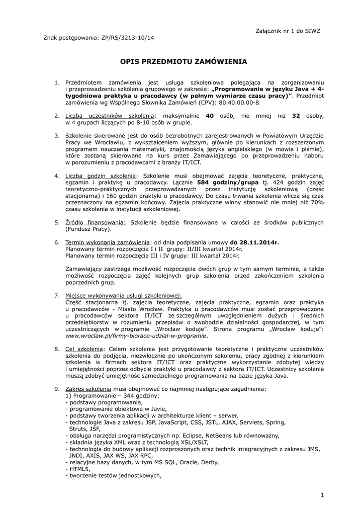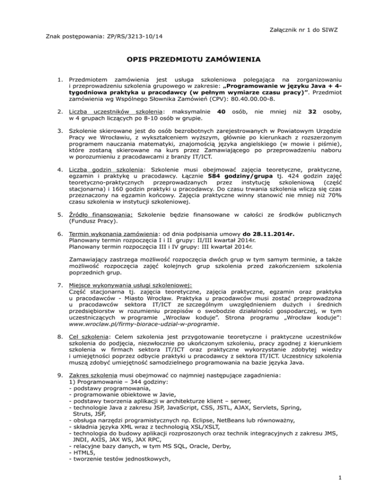 Załącznik nr 1 do SIWZ Znak postępowania: ZP/RS/3213-10/14 OPIS PRZEDMIOTU ZAMÓWIENIA 1. Przedmiotem zamówienia jest usługa szkoleniowa polegająca na zorganizowaniu i przeprowadzeniu szkolenia grupowego w zakresie: „Programowanie w języku Java + 4tygodniowa praktyka u pracodawcy (w pełnym wymiarze czasu pracy)”. Przedmiot zamówienia wg Wspólnego Słownika Zamówień (CPV): 80.40.00.00-8. 2. Liczba uczestników szkolenia: maksymalnie w 4 grupach liczących po 8-10 osób w grupie. 3. Szkolenie skierowane jest do osób bezrobotnych zarejestrowanych w Powiatowym Urzędzie Pracy we Wrocławiu, z wykształceniem wyższym, głównie po kierunkach z rozszerzonym programem nauczania matematyki, znajomością języka angielskiego (w mowie i piśmie), które zostaną skierowane na kurs przez Zamawiającego po przeprowadzeniu naboru w porozumieniu z pracodawcami z branży IT/ICT. 4. Liczba godzin szkolenia: Szkolenie musi obejmować zajęcia teoretyczne, praktyczne, egzamin i praktykę u pracodawcy. Łącznie 584 godziny/grupa tj. 424 godzin zajęć teoretyczno-praktycznych przeprowadzanych przez instytucję szkoleniową (część stacjonarna) i 160 godzin praktyki u pracodawcy. Do czasu trwania szkolenia wlicza się czas przeznaczony na egzamin końcowy. Zajęcia praktyczne winny stanowić nie mniej niż 70% czasu szkolenia w instytucji szkoleniowej. 5. Źródło finansowania: Szkolenie będzie finansowane w całości ze środków publicznych (Fundusz Pracy). 6. Termin wykonania zamówienia: od dnia podpisania umowy do 28.11.2014r. Planowany termin rozpoczęcia I i II grupy: II/III kwartał 2014r. Planowany termin rozpoczęcia III i IV grupy: III kwartał 2014r. 40 osób, nie mniej niż 32 osoby, Zamawiający zastrzega możliwość rozpoczęcia dwóch grup w tym samym terminie, a także możliwość rozpoczęcia zajęć kolejnych grup szkolenia przed zakończeniem szkolenia poprzednich grup. 7. Miejsce wykonywania usługi szkoleniowej: Część stacjonarna tj. zajęcia teoretyczne, zajęcia praktyczne, egzamin oraz praktyka u pracodawców - Miasto Wrocław. Praktyka u pracodawców musi zostać przeprowadzona u pracodawców sektora IT/ICT ze szczególnym uwzględnieniem dużych i średnich przedsiębiorstw w rozumieniu przepisów o swobodzie działalności gospodarczej, w tym uczestniczących w programie „Wrocław koduje”. Strona programu „Wrocław koduje”: www.wroclaw.pl/firmy-biorace-udzial-w-programie. 8. Cel szkolenia: Celem szkolenia jest przygotowanie teoretyczne i praktyczne uczestników szkolenia do podjęcia, niezwłocznie po ukończonym szkoleniu, pracy zgodnej z kierunkiem szkolenia w firmach sektora IT/ICT oraz praktyczne wykorzystanie zdobytej wiedzy i umiejętności poprzez odbycie praktyki u pracodawcy z sektora IT/ICT. Uczestnicy szkolenia muszą zdobyć umiejętność samodzielnego programowania na bazie języka Java. 9. Zakres szkolenia musi obejmować co najmniej następujące zagadnienia: 1) Programowanie – 344 godziny: - podstawy programowania, - programowanie obiektowe w Javie, - podstawy tworzenia aplikacji w architekturze klient – serwer, - technologie Java z zakresu JSP, JavaScript, CSS, JSTL, AJAX, Servlets, Spring, Struts, JSF, - obsługa narzędzi programistycznych np. Eclipse, NetBeans lub równoważny, - składnia języka XML wraz z technologią XSL/XSLT, - technologia do budowy aplikacji rozproszonych oraz technik integracyjnych z zakresu JMS, JNDI, AXIS, JAX WS, JAX RPC, - relacyjne bazy danych, w tym MS SQL, Oracle, Derby, - HTML5, - tworzenie testów jednostkowych, 1 - korzystanie z systemów kontroli wersji, - podstawy z zakresu wzorców projektowych, - podstawy Java EE, - tworzenie aplikacji przy wykorzystaniu Spring Framework i Hibernate, - Framework JSF, 2) Język angielski z wykorzystaniem specjalistycznego słownictwa – 80 godzin, 3) Praktyka u pracodawcy zgodnie z kierunkiem szkolenia – 160 godzin. 10. Organizacja szkolenia: 10.1 Szkolenie należy zrealizować według planu nauczania obejmującego 40 godzin w tygodniu. Jedną godzinę Zamawiający rozumie jako 60 minut, z czego na zajęcia edukacyjne przypada 45 minut a na przerwę 15 minut, przy czym długość przerw może być ustalona w sposób elastyczny, praktyka u pracodawcy musi odbywać się w pełnym wymiarze czasu pracy tj. po 8 godzin zegarowych dziennie; 10.2 Zajęcia muszą się odbywać w godz. między 08.00 – 18.00 (praktyka może być realizowana w innych godzinach, jednak w ramach godzin pracy danego zakładu pracy, wyłączając godziny nocne) od poniedziałku do piątku (z wyłączeniem niedziel, świąt oraz dni ustawowo wolnych od pracy), w kolejno następujących po sobie dniach, liczba godzin dziennie nie może przekroczyć 8. W wyjątkowych sytuacjach dopuszczalne jest przeprowadzenie zajęć w soboty. Praktyka u pracodawcy musi rozpocząć się w pierwszym dniu roboczym po zakończeniu zajęć teoretyczno-praktycznych odbywających się w instytucji szkoleniowej; 10.3 Wykonawca przygotuje program szkolenia, zawierający zakres o którym mowa w pkt 9. Egzamin końcowy musi być integralną częścią programu oraz wchodzić w skład ilości godzin przewidzianych programem. Egzamin końcowy musi być ujęty w Programie szkolenia w pozycji Plan nauczania z uwzględnieniem ilości godzin przewidzianych na ten egzamin oraz w harmonogramie szkolenia z uwzględnieniem daty przeprowadzenia tego egzaminu i ilości godzin przewidzianych na egzamin; 10.4 Wykonawca wyznaczy osobę odpowiedzialną za organizację szkolenia, kontakty z uczestnikami szkolenia oraz z Zamawiającym; 10.5 Wszystkie zajęcia muszą być przeprowadzone osobiście przez kadrę dydaktyczną wskazaną w ofercie. Nie dopuszcza się przeprowadzenia szkolenia, w tym praktyki u pracodawców drogą elektroniczną, metodą e-learningu, w formie eksternistycznej itp.; 10.6 Zajęcia muszą się odbywać w salach szkoleniowych (pracowniach komputerowych) przystosowanych do przeprowadzenia zajęć te