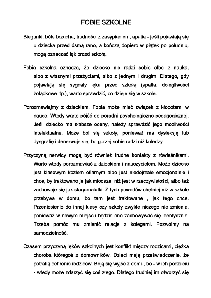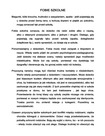 FOBIE SZKOLNE Biegunki, bóle brzucha, trudności z zasypianiem, apatia - jeśli pojawiają się u dziecka przed ósmą rano, a kończą dopiero w piątek po południu, mogą oznaczać lęk przed szkołą. Fobia szkolna oznacza, że dziecko nie radzi sobie albo z nauką, albo z własnymi przeżyciami, albo z jednym i drugim. Dlatego, gdy pojawiają się sygnały lęku przed szkołą (apatia, dolegliwości żołądkowe itp.), warto sprawdzić, co dzieje się w szkole. Porozmawiajmy z dzieckiem. Fobia może mieć związek z kłopotami w nauce. Wtedy warto pójść do poradni psychologiczno-pedagogicznej. Jeśli dziecko ma słabsze oceny, należy sprawdzić jego możliwości intelektualne. Może boi się szkoły, ponieważ ma dysleksję lub dysgrafię i denerwuje się, bo gorzej sobie radzi niż koledzy. Przyczyną nerwicy mogą być również trudne kontakty z rówieśnikami. Warto wtedy porozmawiać z dzieckiem i nauczycielem. Może dziecko jest klasowym kozłem ofiarnym albo jest niedojrzałe emocjonalnie i chce, by traktowano je jak młodsze, niż jest w rzeczywistości, albo też zachowuje się jak stary-malutki. Z tych powodów chętniej niż w szkole przebywa w domu, bo tam jest traktowane , jak tego chce. Przeniesienie do innej klasy czy szkoły zwykle niczego nie zmienia, ponieważ w nowym miejscu będzie ono zachowywać się identycznie. Trzeba pomóc mu zmienić relacje z kolegami. Pozwólmy na samodzielność. Czasem przyczyną lęków szkolnych jest konflikt między rodzicami, ciężka choroba któregoś z domowników. Dzieci mają przeświadczenie, że potrafią ochronić rodziców. Boją się wyjść z domu, bo - w ich poczuciu - wtedy może zdarzyć się coś złego. Dlatego trudniej im otworzyć się na świat i kontakty z rówieśnikami. Przyczyną fobii mogą być problemy dziecka z rozstawaniem się z rodzicami. Od urodzenia dziecko jest w bliskiej więzi z matką . W miarę zdobywania nowych umiejętności dziecko zyskuje niezależność i możliwość samodzielnego poznawania świata. Są momenty przełomowe, na przykład pójście do przedszkola, pierwszy wyjazd bez rodziców, okres dojrzewania. Jeśli wtedy dodatkowo pojawiają się kłopoty w domu, to dziecko może mieć trudności z otwarciem się na świat. Pozwólmy na przyjaźń. Niekiedy rodzice ograniczają samodzielność dziecka. Rodzic powinien uwierzyć, że dziecko sobie samo poradzi, że wystarczy je wspierać i pokazywać mu świat. Kłopoty z adaptacją w szkole może mieć dziecko, które wcześniej nie chodziło do przedszkola. Ma ono mniej doświadczeń w kontaktach z rówieśnikami. Warto więc, jeszcze zanim pójdzie do szkoły, zapewnić mu towarzystwo kolegów, np. organizując mu zajęcia na basenie, w kółku plastycznym itp. Fobię szkolną mogą mieć także dobrzy uczniowie. Czasem na dolegliwości psychosomatyczne skarży się dziecko, które ma dobre wyniki w nauce. Potrafi je zmartwić minus przy piątce, bo chce zaspokoić nie zawsze racjonalne wymagania stawiane mu przez rodziców. Zastanów się więc, może za dużo wymagasz od dziecka. Niepowodzenia w nauce mogą być przyczyną nerwicy. Skontaktuj się z psychologiem, który pomoże wyjaśnić przyczyny niepowodzeń. Zorganizuj dziecku zajęcia dodatkowe, np. reedukacyjne. Nie jest tam ono oceniane, a inne doświadczenia związane z nauką pozwolą mu doświadczyć satysfakcji uczenia się dla zaspokojenia ciekawości. Na lęki dziecko może zareagować też agresją . W ten sposób próbuje radzić sobie z niepewnością, wtedy poproś o pomoc pedagoga lub psychologa.