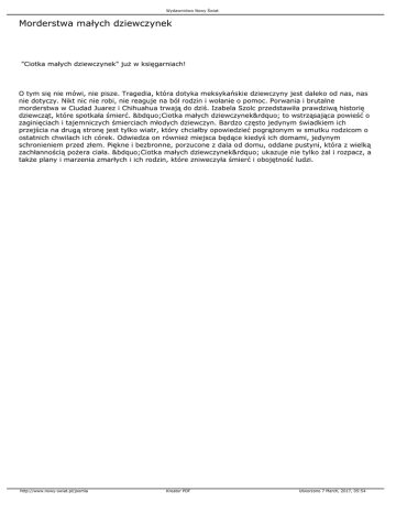 Wydawnictwo Nowy Świat Morderstwa małych dziewczynek "Ciotka małych dziewczynek" już w księgarniach! O tym się nie mówi, nie pisze. Tragedia, która dotyka meksykańskie dziewczyny jest daleko od nas, nas nie dotyczy. Nikt nic nie robi, nie reaguje na ból rodzin i wołanie o pomoc. Porwania i brutalne morderstwa w Ciudad Juarez i Chihuahua trwają do dziś. Izabela Szolc przedstawiła prawdziwą historię dziewcząt, które spotkała śmierć. „Ciotka małych dziewczynek” to wstrząsająca powieść o zaginięciach i tajemniczych śmierciach młodych dziewczyn. Bardzo często jedynym świadkiem ich przejścia na drugą stronę jest tylko wiatr, który chciałby opowiedzieć pogrążonym w smutku rodzicom o ostatnich chwilach ich córek. Odwiedza on również miejsca będące kiedyś ich domami, jedynym schronieniem przed złem. Piękne i bezbronne, porzucone z dala od domu, oddane pustyni, która z wielką zachłannością pożera ciała. „Ciotka małych dziewczynek” ukazuje nie tylko żal i rozpacz, a także plany i marzenia zmarłych i ich rodzin, które zniweczyła śmierć i obojętność ludzi. http://www.nowy-swiat.pl/joomla Kreator PDF Utworzono 7 March, 2017, 05:54