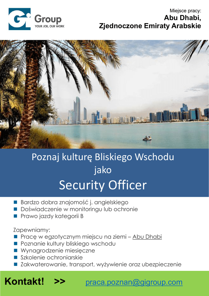 Miejsce pracy: Abu Dhabi, Zjednoczone Emiraty Arabskie Poznaj kulturę Bliskiego Wschodu jako Security Officer  Bardzo dobra znajomość j. angielskiego  Doświadczenie w monitoringu lub ochronie  Prawo jazdy kategorii B Zapewniamy:  Pracę w egzotycznym miejscu na ziemi – Abu Dhabi  Poznanie kultury bliskiego wschodu  Wynagrodzenie miesięczne  Szkolenie ochroniarskie  Zakwaterowanie, transport, wyżywienie oraz ubezpieczenie Kontakt! >> [email protected]