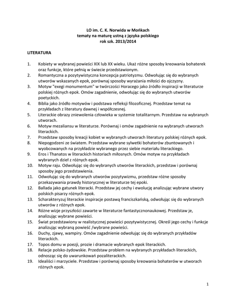 LO im. C. K. Norwida w Mońkach tematy na maturę ustną z języka polskiego rok szk. 2013/2014 LITERATURA 1. 2. 3. 4. 5. 6. 7. 8. 9. 10. 11. 12. 13. 14. 15. 16. 17. 18. 19. Kobiety w wybranej powieści XIX lub XX wieku. Ukaż różne sposoby kreowania bohaterek oraz funkcje, które pełnią w świecie przedstawionym. Romantyczna a pozytywistyczna koncepcja patriotyzmu. Odwołując się do wybranych utworów wskazanych epok, porównaj sposoby wyrażania miłości do ojczyzny. Motyw "exegi monumentum" w twórczości Horacego jako źródło inspiracji w literaturze polskiej różnych epok. Omów zagadnienie, odwołując się do wybranych utworów poetyckich. Biblia jako źródło motywów i podstawa refleksji filozoficznej. Przedstaw temat na przykładach z literatury dawnej i współczesnej. Literackie obrazy zniewolenia człowieka w systemie totalitarnym. Przedstaw na wybranych utworach. Motyw mezaliansu w literaturze. Porównaj i omów zagadnienie na wybranych utworach literackich. Przedstaw sposoby kreacji kobiet w wybranych utworach literatury polskiej różnych epok. Niepogodzeni ze światem. Przedstaw wybrane sylwetki bohaterów zbuntowanych i wyobcowanych na przykładzie wybranego przez siebie materiału literackiego. Eros i Thanatos w literackich historiach miłosnych. Omów motyw na przykładach wybranych dzieł z różnych epok. Motyw raju. Odwołując się do wybranych utworów literackich, przedstaw i porównaj sposoby jego przedstawienia. Odwołując się do wybranych utworów pozytywizmu, przedstaw różne sposoby przekazywania prawdy historycznej w literaturze tej epoki. Ballada jako gatunek literacki. Przedstaw jej cechy i ewolucję analizując wybrane utwory polskich pisarzy różnych epok. Scharakteryzuj literackie inspiracje postawą franciszkańską, odwołując się do wybranych utworów z różnych epok. Różne wizje przyszłości zawarte w literaturze fantastycznonaukowej. Przedstaw je, analizując wybrane powieści. Świat przedstawiony w realistycznej powieści pozytywistycznej. Określ jego cechy i funkcje analizując wybraną powieść /wybrane powieści. Duchy, zjawy, wampiry. Omów zagadnienie odwołując się do wybranych przykładów literackich. Topos domu w poezji, prozie i dramacie wybranych epok literackich. Relacje polsko-żydowskie. Przedstaw problem na wybranych przykładach literackich, odnosząc się do uwarunkowań pozaliterackich. Idealiści i marzyciele. Przedstaw i porównaj sposoby kreowania bohaterów w utworach różnych epok. 1 20. 21. 22. 23. 24. 25. 26. 27. 28. 29. 30. 31. 32. 33. 34. 35. 36. 37. 38. 39. 40. 41. Motyw dziecka i dzieciństwa w utworach literackich różnych epok. Odwołaj się do wybranych utworów. Różne sposoby funkcjonowania motywu zbrodni i kary w wybranych utworach literackich. Małe formy prozatorskie i ich bohaterowie. Omów temat na wybranych przykładach. "Małe ojczyzny" w literaturze jako miejsca, do których się zawsze wraca. Omów temat na wybranych przykładach. Różne obrazy miast przedstawione w literaturze XX wieku. Omów je, odwołując się do wybranych utworów. Przedstaw i porównaj funkcjonowanie motywów tańca i wesela w wybranych tekstach. Czas i przestrzeń w dramacie realistycznym, symboliczno-poetyckim i awangardowym. Porównaj ich realizację w wybranych utworach literackich. Na podstawie wybranych utworów literackich zaprezentuj sposoby i funkcje wykorzystania przez literaturę XX i/lub XXI wieku schematów powieści sensacyjnej (lub kryminalnej, przygodowej, romansowej). Sposoby i funkcje nawiązania do motywu Nike w poezji XX wieku. Omów zagadnienie, odwołując się do wybranych utworów. Antyk jako źródło współczesnej literatury. Przedstaw inspiracje kulturą starożytną w utworach twórców XX wieku. 30.Przemiana wewnętrzna jako czynnik charakteryzujący bohatera literackiego .Omów temat, odwołując się do wybranych utworów z romantyzmu. Różne oblicza katastrofizmu w literaturze dwudziestego wieku. Przedstaw je, odwołując się do wybranych utworów. Funkcje motywu tańca w tekstach literackich. Przedstaw je, odwołując się do wybranych dramatów. Na podstawie wybranych utworów przedstaw obraz rewolucji, jej siłę oraz wpływ na otaczającą rzeczywistość. 34.Portret władcy. Na podstawie analizy wybranych dzieł literackich, scharakteryzuj różnych władców. Sposoby ukazywania bohaterskiej śmierci w literaturze. Scharakteryzuj je na przykładzie wybranych utworów należących do jednej epoki literackiej. Różne metody walki z zaborcą przedstawione w literaturze dziewiętnastego wieku. Omów je, analizując wybrane utwory. Dramat pokolenia Kolumbów wyrażony w literaturze. Określ jego istotę i wymiar, analizując wybrane utwory. Charakter i cele odwołań do tradycji antycznej w twórczości Zbigniewa Herberta. Omów zagadnienie, odwołując się do wybranych wierszy poety. Literackie fascynacje brzydotą. Na podstawie wybranych utworów, określ jej funkcje estetyczne. Na przykładach wybranych utworów literatury XX wieku, przedstaw obraz człowieka zniewolonego. Pycha jako czynnik determinujący działania człowieka. Określ jej źródła i konsekwencje, analizując wybrane utwory dramaty. 2 42. 43. 44. 45. 46. 47. 48. 49. 50. 51. 52. 53. 54. 55. 56. 57. 58. 59. 60. 61. 62. 63. 64. 65. Modernistyczne próby przezwyciężania poczucia bezsensu życia. Omów je, analizując wybrane utwory z okresu Młodej Polski lub analizując utwory wybranego twórcy z tego okresu Parabola jako sposób wyrażania rzeczywistości. Na przykładach dzieł różnych twórców określ jej funkcje w tekstach literackich. Rola groteski jako sposobu kreowania świata w literaturze. Odwołaj się do wybranych utworów. Etos miłości romantycznej w literaturze romantyzmu i dziełach literackich późniejszych epok. Omów problem na wybranych przykładach. Ewolucja postaw patriotycznych ukazanych w literaturze polskiej XIX wieku. Przedstaw zagadnienie na wybranych przykładach