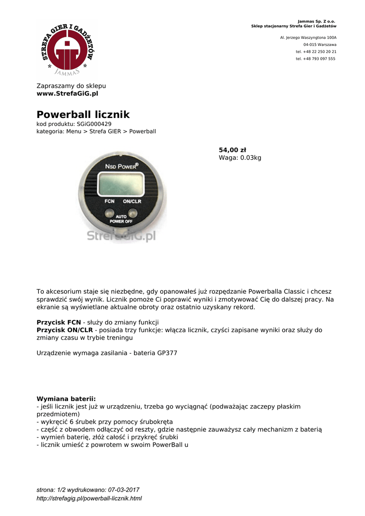 Jammas Sp. Z o.o. Sklep stacjonarny Strefa Gier i Gadżetów Al. Jerzego Waszyngtona 100A 04-015 Warszawa tel. +48 22 250 20 21 tel. +48 793 097 555 Zapraszamy do sklepu www.StrefaGiG.pl Powerball licznik kod produktu: SGiG000429 kategoria: Menu > Strefa GIER > Powerball 54,00 zł Waga: 0.03kg To akcesorium staje się niezbędne, gdy opanowałeś już rozpędzanie Powerballa Classic i chcesz sprawdzić swój wynik. Licznik pomoże Ci poprawić wyniki i zmotywować Cię do dalszej pracy. Na ekranie są wyświetlane aktualne obroty oraz ostatnio uzyskany rekord. Przycisk FCN - służy do zmiany funkcji Przycisk ON/CLR - posiada trzy funkcje: włącza licznik, czyści zapisane wyniki oraz służy do zmiany czasu w trybie treningu Urządzenie wymaga zasilania - bateria GP377 Wymiana baterii: - jeśli licznik jest już w urządzeniu, trzeba go wyciągnąć (podważając zaczepy płaskim przedmiotem) - wykręcić 6 śrubek przy pomocy śrubokręta - część z obwodem odłączyć od reszty, gdzie następnie zauważysz cały mechanizm z baterią - wymień baterię, złóż całość i przykręć śrubki - licznik umieść z powrotem w swoim PowerBall u strona: 1/2 wydrukowano: 07-03-2017 http://strefagig.pl/powerball-licznik.html Funkcje licznika: - pierwszy tryb (przebieg licznika): wyświetlana jednostka równa jest 100, tak więc mając liczbę 10 oznacza 1000 obrotów. Przebieg zapisuje się wyłącznie przy ustawionym trybie, podczas użytkownia z innych wynik się nie zapisuje. - drugi tryb (prędkość aktualna/chwilowa): prędkość z jaką aktulanie obraca się rotator, odświeżana co 1 sekundę i jest przedstawiana w obrotach na minutę RPM. - trzeci tryb (najlepszy wynik): zapamiętuje najlepszy wynik osiągniety w RPM czyli rekord. Funkcja działa wyłącznie podczas pracy tego trybu. - czwarty tryb (trening): 3 opcje 30/60/90 sekundowego treningu. JEŚLI ZASTANAWIASZ SIĘ NAD WYBOREM ODPOWIEDNIEGO MODELU POWERBALLA PRZECZYTAJ ARTYKUŁ HISTORIA, ZASADA DZIAŁANIA, OPIS I CHARAKTERYSTYKA KAŻDEJ KATEGORII strona: 2/2 wydrukowano: 07-03-2017 http://strefagig.pl/powerball-licznik.html