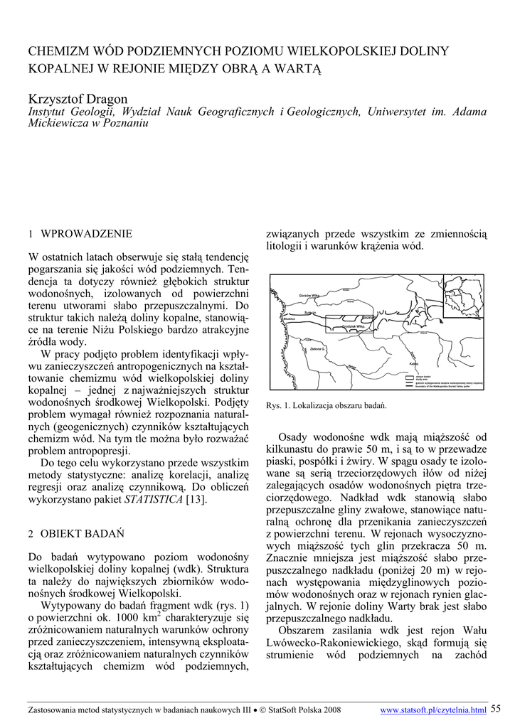 CHEMIZM WÓD PODZIEMNYCH POZIOMU WIELKOPOLSKIEJ DOLINY KOPALNEJ W REJONIE MIĘDZY OBRĄ A WARTĄ Krzysztof Dragon Instytut Geologii, Wydział Nauk Geograficznych i Geologicznych, Uniwersytet im. Adama Mickiewicza w Poznaniu 1 WPROWADZENIE W ostatnich latach obserwuje się stałą tendencję pogarszania się jakości wód podziemnych. Tendencja ta dotyczy również głębokich struktur wodonośnych, izolowanych od powierzchni terenu utworami słabo przepuszczalnymi. Do struktur takich należą doliny kopalne, stanowiące na terenie Niżu Polskiego bardzo atrakcyjne źródła wody. W pracy podjęto problem identyfikacji wpływu zanieczyszczeń antropogenicznych na kształtowanie chemizmu wód wielkopolskiej doliny kopalnej – jednej z najważniejszych struktur wodonośnych środkowej Wielkopolski. Podjęty problem wymagał również rozpoznania naturalnych (geogenicznych) czynników kształtujących chemizm wód. Na tym tle można było rozważać problem antropopresji. Do tego celu wykorzystano przede wszystkim metody statystyczne: analizę korelacji, analizę regresji oraz analizę czynnikową. Do obliczeń wykorzystano pakiet STATISTICA [13]. 2 OBIEKT BADAŃ Do badań wytypowano poziom wodonośny wielkopolskiej doliny kopalnej (wdk). Struktura ta należy do największych zbiorników wodonośnych środkowej Wielkopolski. Wytypowany do badań fragment wdk (rys. 1) o powierzchni ok. 1000 km2 charakteryzuje się zróżnicowaniem naturalnych warunków ochrony przed zanieczyszczeniem, intensywną eksploatacją oraz zróżnicowaniem naturalnych czynników kształtujących chemizm wód podziemnych, związanych przede wszystkim ze zmiennością litologii i warunków krążenia wód. Rys. 1. Lokalizacja obszaru badań. Osady wodonośne wdk mają miąższość od kilkunastu do prawie 50 m, i są to w przewadze piaski, pospółki i żwiry. W spągu osady te izolowane są serią trzeciorzędowych iłów od niżej zalegających osadów wodonośnych piętra trzeciorzędowego. Nadkład wdk stanowią słabo przepuszczalne gliny zwałowe, stanowiące naturalną ochronę dla przenikania zanieczyszczeń z powierzchni terenu. W rejonach wysoczyznowych miąższość tych glin przekracza 50 m. Znacznie mniejsza jest miąższość słabo przepuszczalnego nadkładu (poniżej 20 m) w rejonach występowania międzyglinowych poziomów wodonośnych oraz w rejonach rynien glacjalnych. W rejonie doliny Warty brak jest słabo przepuszczalnego nadkładu. Obszarem zasilania wdk jest rejon Wału Lwówecko-Rakoniewickiego, skąd formują się strumienie wód podziemnych na zachód Zastosowania metod statystycznych w badaniach naukowych III • © StatSoft Polska 2008 www.statsoft.pl/czytelnia.html 55 Chemizm wód podziemnych poziomu wielkopolskiej doliny kopalnej w rejonie między Obrą a Wartą w kierunku doliny Obry i na wschód w kierunku doliny Warty. Rys. 2. Przekrój hydrogeologiczny. 1 – piaski i żwiry, 2 – gliny zwałowe, 3 – iły, 4 – mułki, 5 – węgle brunatne 6 – poziom ciśnień piezometrycznych wód wielkopolskiej doliny kopalnej Q – czwartorzęd, Tr – trzeciorzęd. 3 METODYKA BADAŃ Do wstępnej identyfikacji procesów hydrogeochemicznych kształtujących chemizm wód wdk wykorzystano metodę analizy czynnikowej. W pierwszej kolejności dane wyjściowe (zmienne) poddano standaryzacji wg kryteriów podanych przez Davisa [3]. Punktem wyjściowym analizy jest wyodrębnienie z macierzy korelacji nowych grup zmiennych, które są kombinacją liniową zmiennych pierwotnych. W tym celu zastosowano analizę składowych głównych. Pierwszy otrzymany czynnik tłumaczy największą część wariancji, każdy następny coraz mniejszą. Ładunek czynnikowy wskazuje w jakim stopniu czynniki opisują zmienną (np. stężenie jonu). Jeżeli ładunki czynnikowe przyjmują wysokie wartości (bliskie 1 lub -1), oznacza to silny związek korelacyjny zmiennej pierwotnej z opisującym ją czynnikiem. W celu uzyskania przejrzystego układu ładunków dane poddano rotacji varimax, w wyniku czego otrzymano wysokie wartości czynnikowe (bliskie 1 lub -1), dla jednych zmiennych (skorelowanych w czynniku), przy wartościach bliskich 0 dla pozostałych zmiennych. Dla wydzielonych czynników w całkowitej zmienności analizowanego zbioru obliczono procentowy ich udział. Dla określenia liczby czynników zastosowano kryterium Kaisera. Dzięki temu do interpretacji przyjęto tylko te czynniki, które w największej części opisują zmienność analizowanego zbioru (o wartościach własnych >1) i dają się sensownie interpretować [4]. O tym, w jakim stopniu wydzielone czynniki opisują zmienność badanej cechy, mówi tzw. zmienność 56 www.statsoft.pl/czytelnia.html wspólna V, która jest równa sumie kwadratów ładunków czynnikowych. Dla tak przeliczonych danych wyjściowych obliczono wartości czynnikowe. Jak wykazano [2], wartości czynnikowe (w poszczególnych opróbowanych punktach) są ściśle zależne od intensywności procesu opisywanego przez czynnik. Wartości czynnikowe przedstawiono na wykresach rozrzutu oraz na mapach. Obszary o najwyższych wartościach czynnikowych (>1) są odbiciem intensywności oddziaływania procesu opisywanego przez czynnik, wartości ekstremalnie niskie (<-1) odzwierciedlają obszary, gdzie dany proces charakteryzuje się słabym oddziaływaniem, natomiast wartości bliskie 0 odzwierciedlają średnią intensywność oddziaływania procesu. Wynik analizy czynnikowej jest najbardziej czytelny, gdy liczba czynników jest mała, zmienność wspólna V wysoka (jak najbliższa 1), a otrzymane czynniki dają się czytelnie interpretować przyrodniczym procesem [6]. Dla przykładu – zestaw parametrów fizyczno-chemicznych wód skorelowanych w czynniku da się wyjaśnić za pomocą procesu (antropogenicznego lub geogenicznego), który mógł doprowadzić do obserwowanej zmienności. Wstępnym etapem analizy statystycznej było testowanie normalności rozkładu, do czego wykorzyst