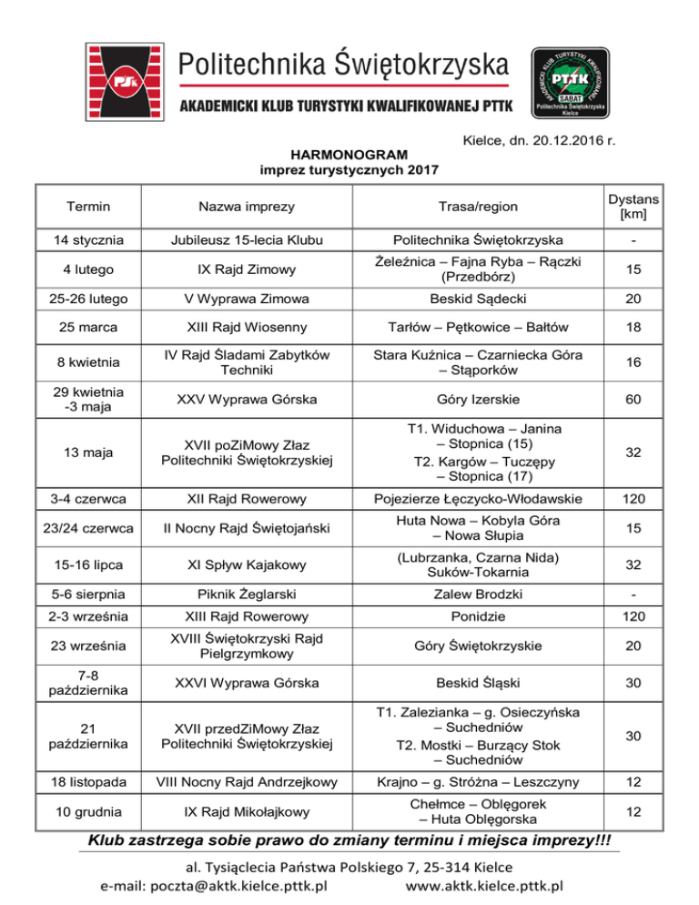 Kielce, dn. 20.12.2016 r. HARMONOGRAM imprez turystycznych 2017 Termin Nazwa imprezy Trasa/region Dystans [km] 14 stycznia Jubileusz 15-lecia Klubu Politechnika Świętokrzyska - 4 lutego IX Rajd Zimowy Żeleźnica – Fajna Ryba – Rączki (Przedbórz) 15 25-26 lutego V Wyprawa Zimowa Beskid Sądecki 20 25 marca XIII Rajd Wiosenny Tarłów – Pętkowice – Bałtów 18 8 kwietnia IV Rajd Śladami Zabytków Techniki Stara Kuźnica – Czarniecka Góra – Stąporków 16 29 kwietnia -3 maja XXV Wyprawa Górska Góry Izerskie 60 T1. Widuchowa – Janina – Stopnica (15) T2. Kargów – Tuczępy – Stopnica (17) 13 maja XVII poZiMowy Złaz Politechniki Świętokrzyskiej 3-4 czerwca XII Rajd Rowerowy Pojezierze Łęczycko-Włodawskie 120 23/24 czerwca II Nocny Rajd Świętojański Huta Nowa – Kobyla Góra – Nowa Słupia 15 15-16 lipca XI Spływ Kajakowy (Lubrzanka, Czarna Nida) Suków-Tokarnia 32 5-6 sierpnia Piknik Żeglarski Zalew Brodzki - 2-3 września XIII Rajd Rowerowy Ponidzie 120 23 września XVIII Świętokrzyski Rajd Pielgrzymkowy Góry Świętokrzyskie 20 7-8 października XXVI Wyprawa Górska Beskid Śląski 30 21 października XVII przedZiMowy Złaz Politechniki Świętokrzyskiej T1. Zalezianka – g. Osieczyńska – Suchedniów T2. Mostki – Burzący Stok – Suchedniów 30 18 listopada VIII Nocny Rajd Andrzejkowy Krajno – g. Stróżna – Leszczyny 12 10 grudnia IX Rajd Mikołajkowy Chełmce – Oblęgorek – Huta Oblęgorska 12 Klub zastrzega sobie prawo do zmiany terminu i miejsca imprezy!!! al. Tysiąclecia Państwa Polskiego 7, 25-314 Kielce e-mail: [email protected] www.aktk.kielce.pttk.pl 32