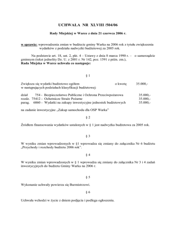 UCHWAŁA NR XLVIII /504/06 Rady Miejskiej w Warce z dnia 21 czerwca 2006 r. w sprawie: wprowadzenia zmian w budżecie gminy Warka na 2006 rok z tytułu zwiększenia wydatków z podziału nadwyżki budżetowej za 2005 rok. Na podstawie art. 18, ust. 2, pkt. 4 – Ustawy z dnia 8 marca 1990 r. – o samorządzie gminnym (tekst jednolity Dz. U. z 2001 r. Nr 142, poz. 1591 z późn. zm.), Rada Miejska w Warce uchwala co następuje: §1 Zwiększa się wydatki budżetowe ogółem w następujących podziałach klasyfikacji budżetowej: o kwotę dział 754 - Bezpieczeństwo Publiczne i Ochrona Przeciwpożarowa rozdz. 75412 - Ochotnicze Straże Pożarne parag. 6060 - Wydatki na zakupy inwestycyjne jednostek budżetowych 35.000,- 35.000,35.000,35.000,- na zadanie inwestycyjne „Zakup samochodu dla OSP Warka” §2 Źródłem finansowania wydatków ustalonych w § 1 jest nadwyżka budżetowa za 2005 rok. §3 W wyniku zmian wprowadzonych w §1 wprowadza się zmiany do załącznika Nr 6 budżetu „Przychody i rozchody budżetu 2006 rok”. §4 W wyniku zmian wprowadzonych w § 1 wprowadza się zmiany do załącznika Nr 3 i 4 zadań inwestycyjnych do budżetu Gminy Warka na 2006 r. §5 Wykonanie uchwały powierza się Burmistrzowi. §6 Uchwała wchodzi w życie z dniem podjęcia i podlega ogłoszeniu. UZASADNIENIE Środki finansowe z nadwyżki budżetowej 2005 r w kwocie 35.000,- zł przeznacza się na zakup samochodu dla OSP Warka. Załącznik nr 3 Wykaz zadań inwestycyjnych na 2006 rok w poszczególnych działach budżetu 010 ROLNICTWO I ŁOWIECTWO 2 755 000 1. Budowa kanalizacji Magierowa Wola 2 695 000 w tym: środki włsne gminy kredyt BOŚ pożyczka WFOŚiGW 2. Kontynuacja wodociągowania południowej części gminy oraz przebudowa stacji uzdatniania ujęcia wody Bończa 600 TRANSPORT I ŁĄCZNOŚĆ 60 000 1 010 576 2. Współfinansowanie zgodnie z porozumieniem modernizacji dróg powiatowych na terenie gminy 373 000 4. Usunięcie starych drzew uszkadzających nawierzchnię ul. Lotników, dokonanie nowych nasadzeń i odtworzenie zmodernizowanej całej ulicy i chodników 5. Opracowanie dokumenatacji projektowej przebudowy ul. Niemojewskiej wraz z budową parkingu Gospodarka Mieszkaniowa 1. Opracowanie projektu elewacji zewnętrznych bydynków przy Pl. St. Czarnieckiego ADMINISTRACJA PUBLICZNA 1. Budowa Urzędu Gminy 2. Zakup komputerów i oprogramowania 754 2 225 000 130 000 3. Wykonanie projektu ul. Łąkowej 750 395 000 1. Modernizacja ciągu ulic Grójecka, Warszawska, Wójtowska, Lotników środki własne gminy 700 45 000 BEZPIECZEŃSTWO PUBLICZNE I OCHRONA PRZECIWPOŻAROWA 373 000 20 000 452 576 35 000 30 000 30 000 2 206 900 2 106 900 100 000 635 000 1. Zakup samochodu dla OSP Warka w tym: pożyczka WFOŚiGW 2. Budowa garażu przy OSP Warka 801 OŚWIATA I WYCHOWANIE 1. Termoocieplenie PSP Nr 2 w Warce w tym kredyt BISE 852 450 000 100 000 816 427 581 427 581 427 2. Budowa wejścia do Szkoły Podstawowej PSP Nr 2 w Warce 115 000 3. Modernizacja kotłowni węglowej na olejową PSP Konary 120 000 w tym: środki własne 20 000 pożyczka WFOŚiGW 100 000 POMOC SPOŁECZNA 1. Zakup komputerów 900 535 000 GOSPODARKA KOMUNALNA I OCHRONA ŚRODOWISKA 6 000 6 000 2 659 000 1. Zakup wiat przystankowych 18 000 2. Zakup słupów ogłoszeniowych 32 000 3. Budowa sieci oświetlenia ulicznego 100 000 4. Drobne wodociąowanie na terenie miasta i gminy 30 000 5. Budowa kanalizacji w ul. Grójeckiej, Orzeszkowej 2 287 000 w tym: pożyczka z NFOŚiGW kredyt BOŚ środki własne gminy 6. Zakup nieruchomości od Skarbu Państwa po FUM Warka w upadłości 1 802 000 440 000 45 000 0 7. Budowa kanalizacji na nowowybudowanym osiedlu przy ul. Ks. M. Ciemniewskiego 30 000 8. Zakup kontenerów 27 000 9. Przebudowa kolektora deszczowego w ul. Polnej 10 Zakup witaczy dla Gminy Warka 100 000 35 000 921 KULTURA I OCHRONA DZIEDZICTWA NARODOWEGO 880 000 1. Modernizacja i adaptacja na cele kulturalne, społeczne zabytkowego dworku przy ul. Długiej w Warce 780 000 2. Zagospodarowanie terenu przy Dworku na ul. Długiej 100 000 RAZEM : 10 998 903 Załącznik Nr 6 PRZYCHODY I ROZCHODY BUDŻETU 2006 r. Dz. 00 – PRZYCHODY I ROZCHODY ZWIĄZANE Z FINANSOWANIEM NIEDOBORU I ROZDYSPONOWANIEM NADWYŻKI BUDŻETOWEJ ORAZ Z PRYWATYZACJĄ MAJĄTKU JEDNOSTEK SAMORZĄDU TERYTORIALNEGO Lp. I KLASYFIKACJA PRZYCHODÓW I ROZCHODÓW § 957 PRZYCHODY § 01 1. Nadwyżka 2 lat ubiegłych 2. Sprzedaż papierów wartościowych wyemitowanych przez gminy 3. Planowane do zaciągnięcia kredyty długoterminowe 4. Planowane do zaciągnięcia pożyczki i kredyty długoterminowe 5. Przychody z prywatyzacji majątku 6. Spłaty pożyczek udzielonych KWOTA 1.061.900,- § 952 - 6.023.427,- 7.085.327,- RAZEM PRZYCHODY II ROZCHODY § 02 1. 2. 3. 4. Spłaty kredytów długoterminowych Spłaty pożyczek Wykup papierów wartościowych Udzielone pożyczki - 651.186,- § 992 651.186,- RAZEM ROZCHODY INFORMACJE UZUPEŁNIAJĄCE 1. Planowane dochody 2. Planowane wydatki 3. Wynik - różnica między 1 i 2 (+) - różnica między 2 i 1 (-) 33.043.056 zł 39.477.197 zł -- 6.434.141 zł POKRYCIE DEFICYTU / NIEDOBORU / BUDŻETU 1. kredytem / pożyczką / długoterminowym 2. przychodami ze sprzedaży papierów wartościowych 6.023.427 zł -zł 3. przychodami z prywatyzacji majątku II. -- PRZEZNACZENIE ŚRODKÓW BUDŻETU 1. spłata kredytu i pożyczki 2. pożyczki udzielone 3. wykup papierów wartościowych 651.186 zł -zł -zł zł Załącznik nr 4 Plan zadań inwestycyjnych Gminy Warka na 2006 rok Lp. Dział Rozdział Paragraf Wyszczególnienie Ogólna kwota realizacji zadań 2 695 000 Środki własne z budżetu Gminny Fundusz Ochrony Środowiska 45 000 Pożyczka kredyty - Dotacje 1 010 01095 6050 Budowa kanalizacji Magierowa Wola 2 650 000 - 2 600 60016 6050 Modernizacja ciągu ulic Warszawska, Wójtowska, Lotników 130 000 130 000 - - - 3 600 60014 6050 Współfinansowanie zgodnie z porozumieniem dróg powiatowych na terenie gminy 373 000 373 000 - - - 4 801 80101 6050 