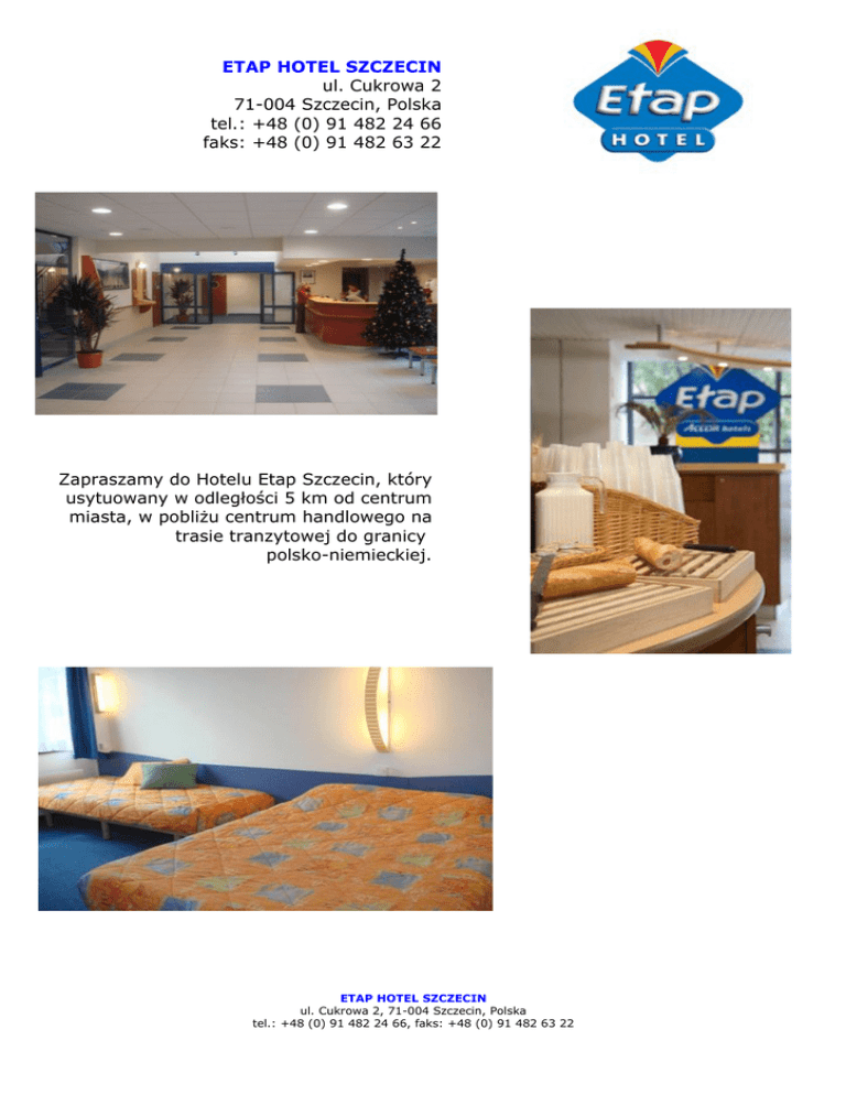 ETAP HOTEL SZCZECIN ul. Cukrowa 2 71-004 Szczecin, Polska tel.: +48 (0) 91 482 24 66 faks: +48 (0) 91 482 63 22 Zapraszamy do Hotelu Etap Szczecin, który usytuowany w odległości 5 km od centrum miasta, w pobliżu centrum handlowego na trasie tranzytowej do granicy polsko-niemieckiej. ETAP HOTEL SZCZECIN ul. Cukrowa 2, 71-004 Szczecin, Polska tel.: +48 (0) 91 482 24 66, faks: +48 (0) 91 482 63 22 Wszystkie nasze pokoje posiadają własną łazienkę (prysznic) oraz bogaty wybór kanałów telewizyjnych. ETAP HOTEL SZCZECIN ul. Cukrowa 2, 71-004 Szczecin, Polska tel.: +48 (0) 91 482 24 66, faks: +48 (0) 91 482 63 22
