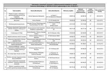 Informacja o zawartych umowach o dofinansowanie projektów w ramach konkursu zamkniętego nr 38/POKL/9.5/2012 ogłoszonego w dniu 19.09.2012 r. Wartość przyznanego dofinansowania Liczba zdobytych punktów Data podpisania umowy 49 987,40 77 05.03.2013 35 950,00 35 950,00 86 14.03.2013 ul. Kazimierza Wielkiego 33/14 36-020 Tyczyn 34 514,85 34 514,85 87 27.03.2013 Stowarzyszenie Koła Gospodyń Wiejskich w Dzwonowej 39-225 Jodłowa Dzwonowa 85 38 471,55 38 471,55 66 27.03.2013 Z edukacją w III Wiek Gmina Niebylec / Gminny Ośrodek Kultury 38-114 Niebylec 182a 50 000,00 50 000,00 91 28.03.2013 6 Aktywna edukacja oknem na świat Gminne Centrum Kultury w Jeżowem 37-430 Jeżowe 236/2 48 828,73 48 828,73 85 28.03.2013 7 Kulinarna przyjemność w Gminie Jawornik Polski Stowarzyszenie Miłośników Gminy Jawornik Polski 37-232 Hadle Szklarskie 346 49 540,50 49 540,50 92 03.04.2013 8 OSP na straży bezpieczeństwa w Nawsiu Brzosteckim Ochotnicza Straż Pożarna w Nawsiu Brzosteckim Nawsie Brzosteckie 207 A 39-230 Brzostek 46 356,61 46 356,61 72 23.04.2013 9 Wyższe kwalifikacje - wieksza skuteczność strażaków ochotników Ochotniczej Straży Pożarnej w Nizinach Ochotnicza Straż Pożarna w Nizinach 37-716 Niziny 235 49 952,52 49 952,52 97 25.04.2013 10 Na naukę nigdy nie jest za późno Stowarzyszenie "Niżańskie Centrum Rozwoju" ul. Rudnicka 15 37-400 Racławice 49 995,10 49 995,10 69 29.04.2013 11 Wiedza, pewność i bezpieczeństwo atuty STRAŻAKA Ochotnicza Straż Pożarna Nowe Brusno 37-620 Nowe Brusno 49 517,80 49 517,80 69 29.04.2013 12 Czas na aktywność mieszkanek Duńkowic - edukacja artystycznai kulinarna Ochotnicza Straż Pożarna w Duńkowicach Duńkowice 16 37-550 Radymno 49 949,25 49 949,25 71 29.04.2013 13 Mobilny i wyszkolony strażak ochotnik gwarancją bezpieczeństwa Ochotnicza Straż Pożarna w Konieczkowej Konieczkowa 38-114 Niebylec 38 157,30 38 157,30 88 29.04.2013 Lp. Tytuł projektu Nazwa Beneficjenta Adres Beneficjenta Wartość projektu 1 Postaw na życie - edukacja w zakresie pierwszej pomocy dla młodzieży w Gminie Sędziszów Młp. Gmina Sędziszów Małopolski ul. Rynek 1 39-120 Sędziszów Małoplski 49 987,40 2 Bez barier Gmina Niwiska 37-147 Niwiska 430 3 Edukacja gwarancją sukcesu Ośrodek Pomocy Psychologicznej i Psychoedukacji "Do Celu" 4 Edukacja mieszkanek Dzwonowej w zakresie zdrowych i tradycyjnych potraw 5 14 Uniwersytet Dzieci w gminie Rymanów Fundacja "Jaś Wędrowniczek" Wykwalifikowani strażacy 15 bezpieczne społeczeństwo. Program Gmina Chmielnik rozwoju kluczowych umiejętności członków OSP w gminie Chmielnik Stowarzyszenie na Rzecz Rozwoju 16 Teraz My kobiety z Mszany Wsi Karpackiej KARPATKA ul. Bieleckiego 8 38-480 Rymanów 34 161,69 34 161,69 89 29.04.2013 36-016 Chmielnik 50 32 730,00 32 730,00 74 30.04.2013 Mszana 22 38-454 Tylawa 49 496,90 49 496,90 85 17.05.2013 17 Na dobry początek w edukacji - II edycja Gminny Ośrodek Kultury i Rekreacji w Krempnej 38-232 Krempna 85 49 999,39 49 999,39 80 20.05.2013 18 Będziemy działać skuteczniej Zakład Doskonalenia Zawodowego w Przemyślu ul. Wilsona 12, 37-700 Przemyśl 49 998,81 49 998,81 91 22.05.2013 19 Droga do skuteczności Zakład Doskonalenia Zawodowego w Przemyślu ul. Wilsona 12, 37-700 Przemyśl 49 998,81 49 998,81 90 22.05.2013 Pustynia 128a 39-200 Dębica 42 065,28 42 065,28 66 23.05.2013 20 Wyszkoleni strażacy OSP Pustynia Ochotnicz Straż Pożarna w Pustyni bezpieczna Gmina Dębica 21 Podniesienie kwalifikacji i umiejętności członków OSP Pustków Ochotnicza Straż Pozarna w Pustkowie Pustków Wieś 78 39-205 Pustków 41 520,28 41 520,28 65 23.05.2013 22 Edukacyjny Klub Kobiet Miejska Biblioteka Publiczna w Dynowie ul. K.Ożoga 6 36-065 DynówJarosław 47 700,00 47 700,00 76 19.06.2013 23 Edukacja dobrego rodzica Lokalny Ośrodek Kultury RAZEM w Niechobrzu 36-047 Niechobrz 278. 30 252,95 30 252,95 78 19.06.2013 24 Młodzież z klasą-inicjatywa edukacyjna Lokalna Grupa Działania KRAINA NAFTY ul. Dworska14 38-430 Miejsce Piastowe 41 420,00 41 420,00 80 24.06.2013 25 Wyszkolona OSP dla bezpieczeństwa Gminy Pilzno Ochotnicza Straż Pożarna w Pilźnie ul. Węgierska 30 39-220 Pilzno 33 152,35 33 152,35 71 25.06.2013 26 Szkoła i edukacja dobrego rodzica Lokalny Ośrodek Kultury "Wspólnota" w Zgłobniu Zgłobień - Dom Ludowy 36-046 Zgłobień 30 252,95 30 252,95 78 14.08.2013 27 Zabawa z Językiem Angielskim Kluczem do Sukcesu Aleksandra Brud POWER ENGLISH - NAUKA JĘZYKA ANGIELSKIEGO ul. Michała Wołodyjowskiego 25 37-200 Przeworsk 48 297,73 48 297,73 68 08.08.2013 28 Inicjatywa Kobiet 50+ Gminny Ośrodek Kultury w Niebylcu 38-114 Niebylec 182a 50 000,00 50 000,00 91 11.09.2013 29 Angielskie ABC Gawlik - Olszewska Ewelina Szkoła języka Angielskiego House of English ul. Konopnickiej 2, 39-100 Ropczyce 48 297,73 48 297,73 68 13.09.2013 30 E-dziennik - krok w innowacyjność Gmina Medyka 37-732 Medyka 288 45 570,01 45 570,01 101 24.01.2014 1 316 136,49 zł 1 316 136,49 zł Razem Projekt uzyskał dofinansowanie w ramach rezerwy finansowej przeznaczonej na procedurę odwoławczą.
